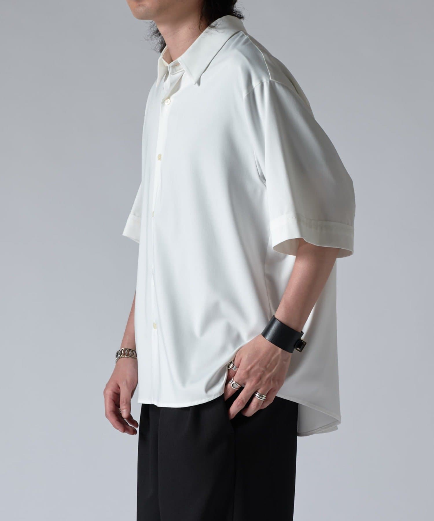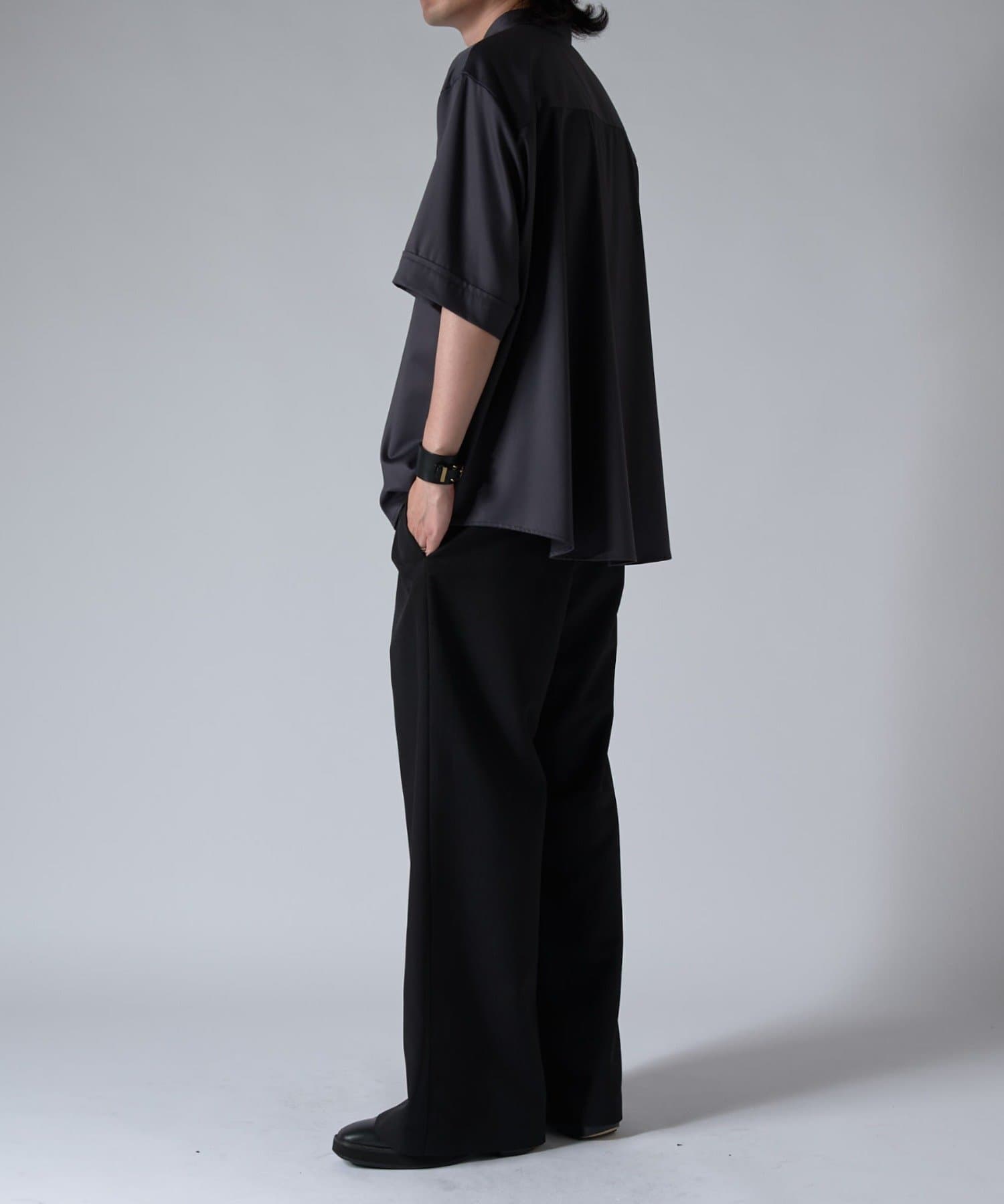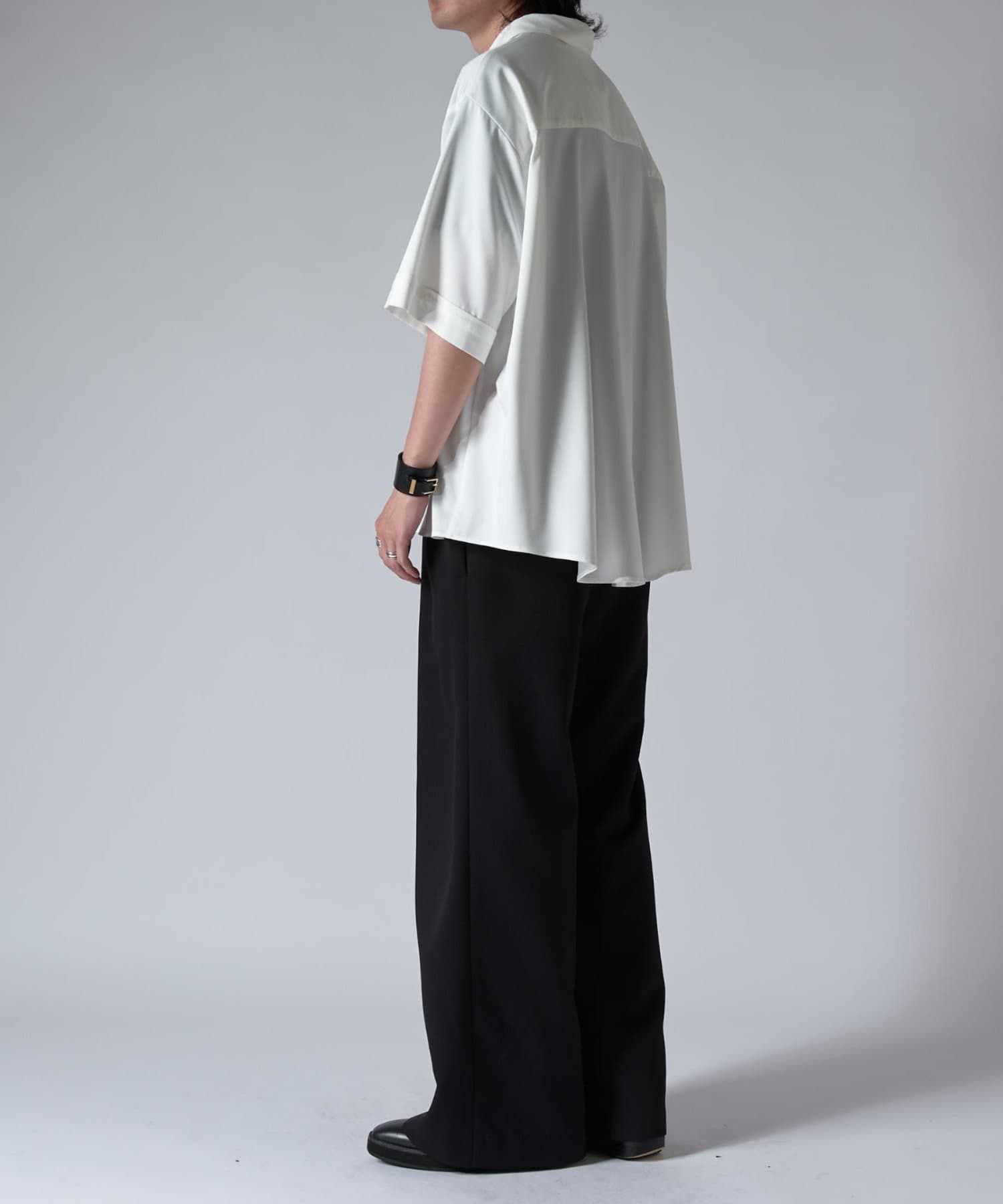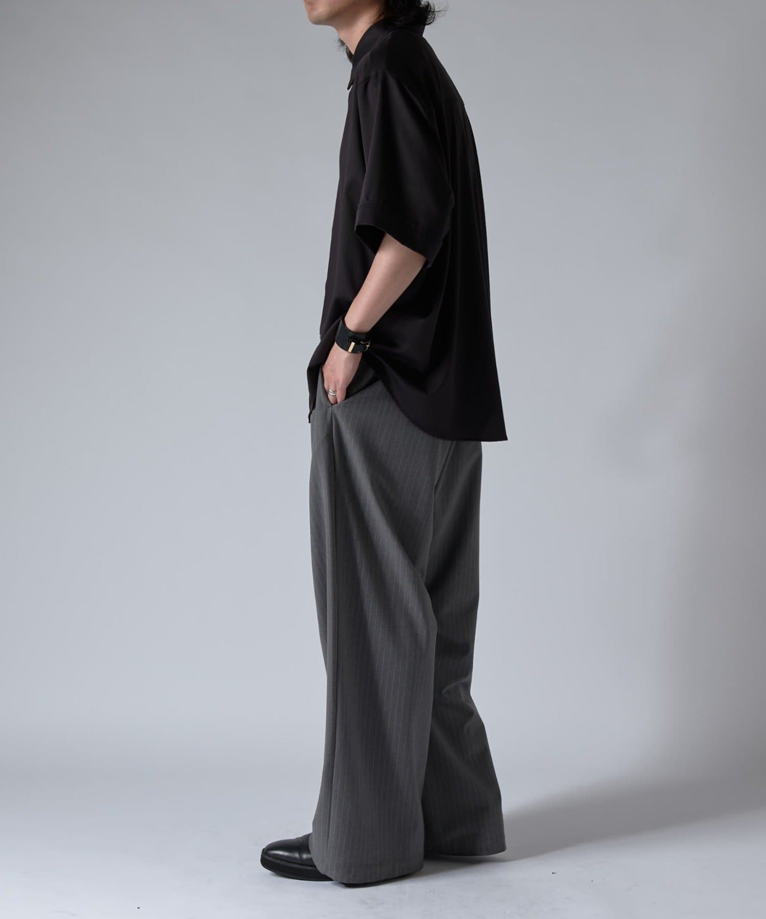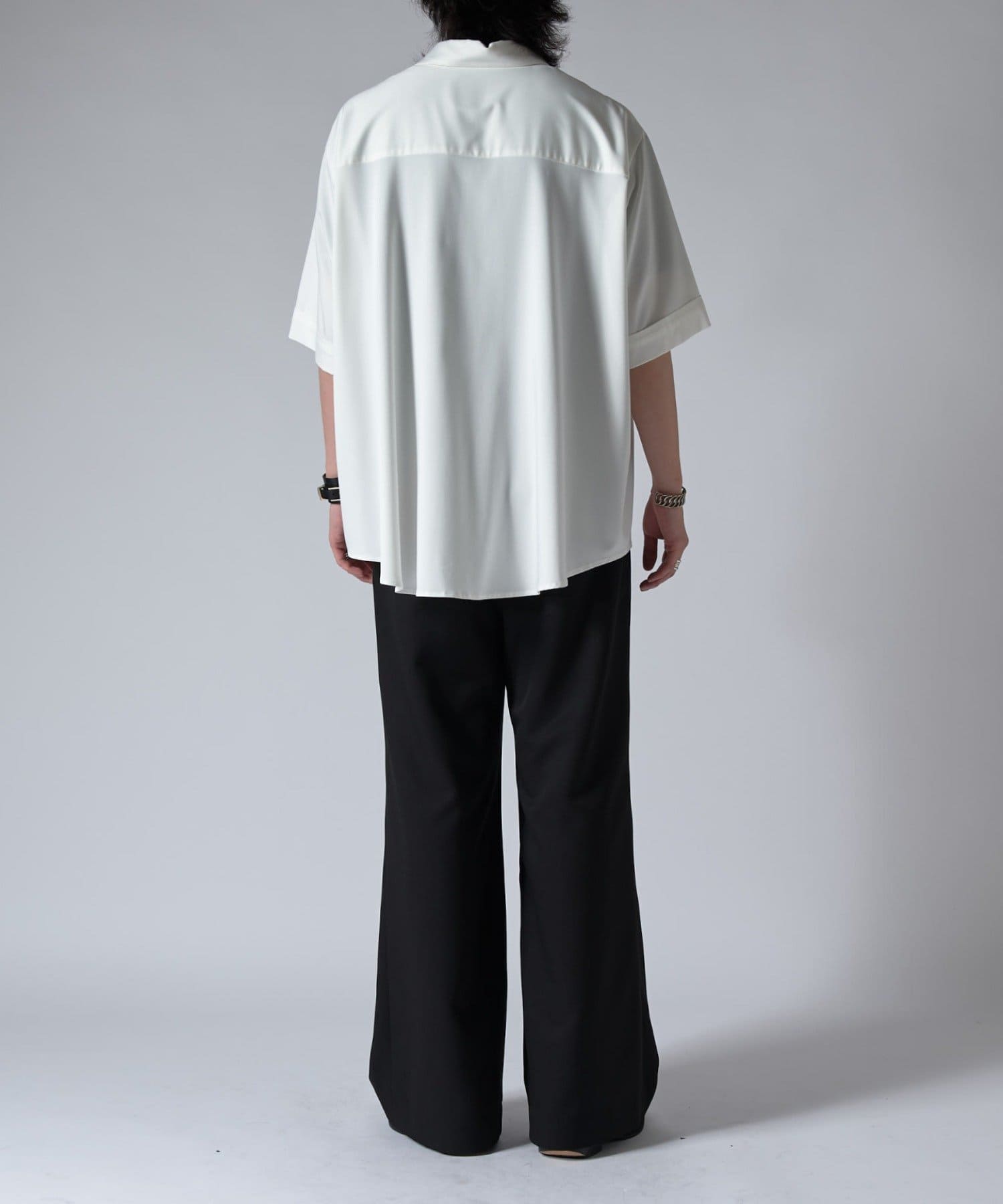 クリーンでミニマルな見た目のシャツなので、ワイドデニムやパラシュートパンツと組み合わせたキレイめカジュアルなスタイルがオススメ。