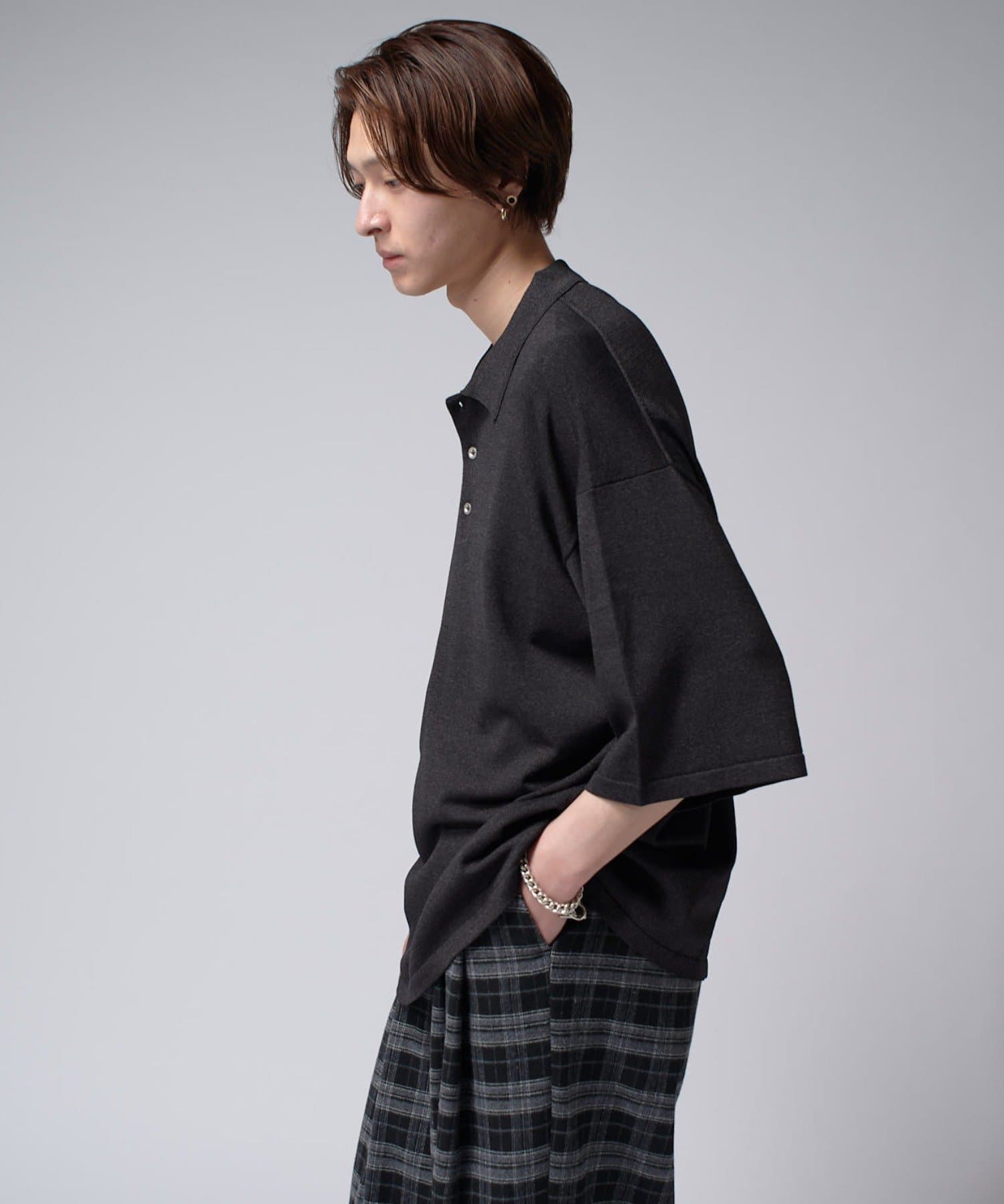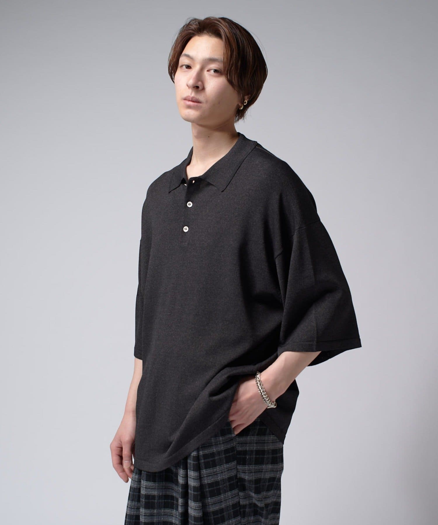キレイめでラフな印象のこちらのニットポロ。身幅と着丈をやや広くとりラフに着て頂けるサイジング。フロントにボタンと襟のアクセント。
