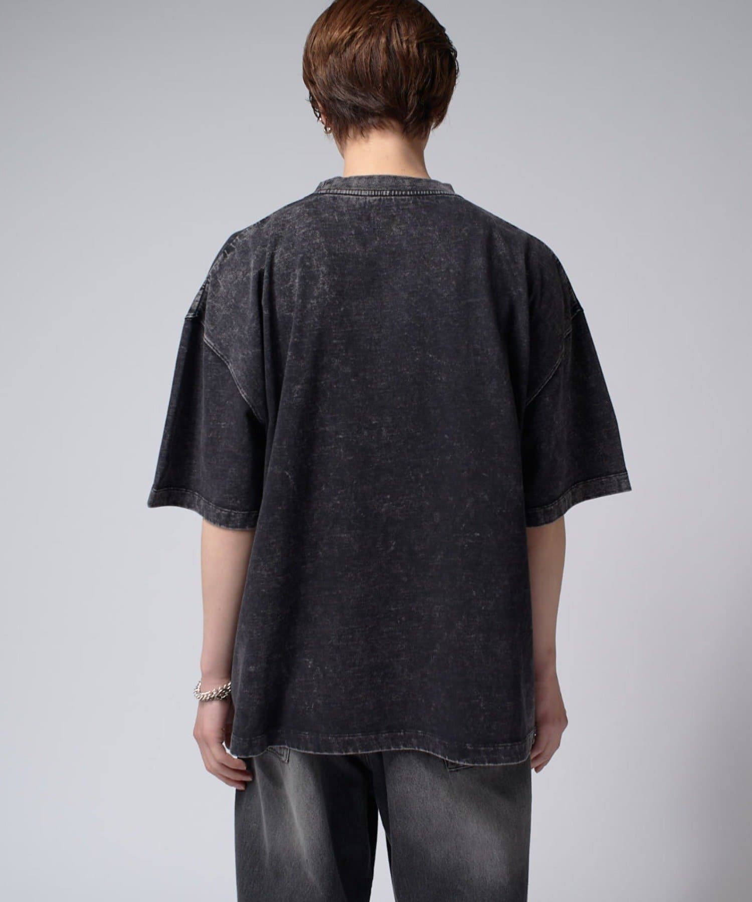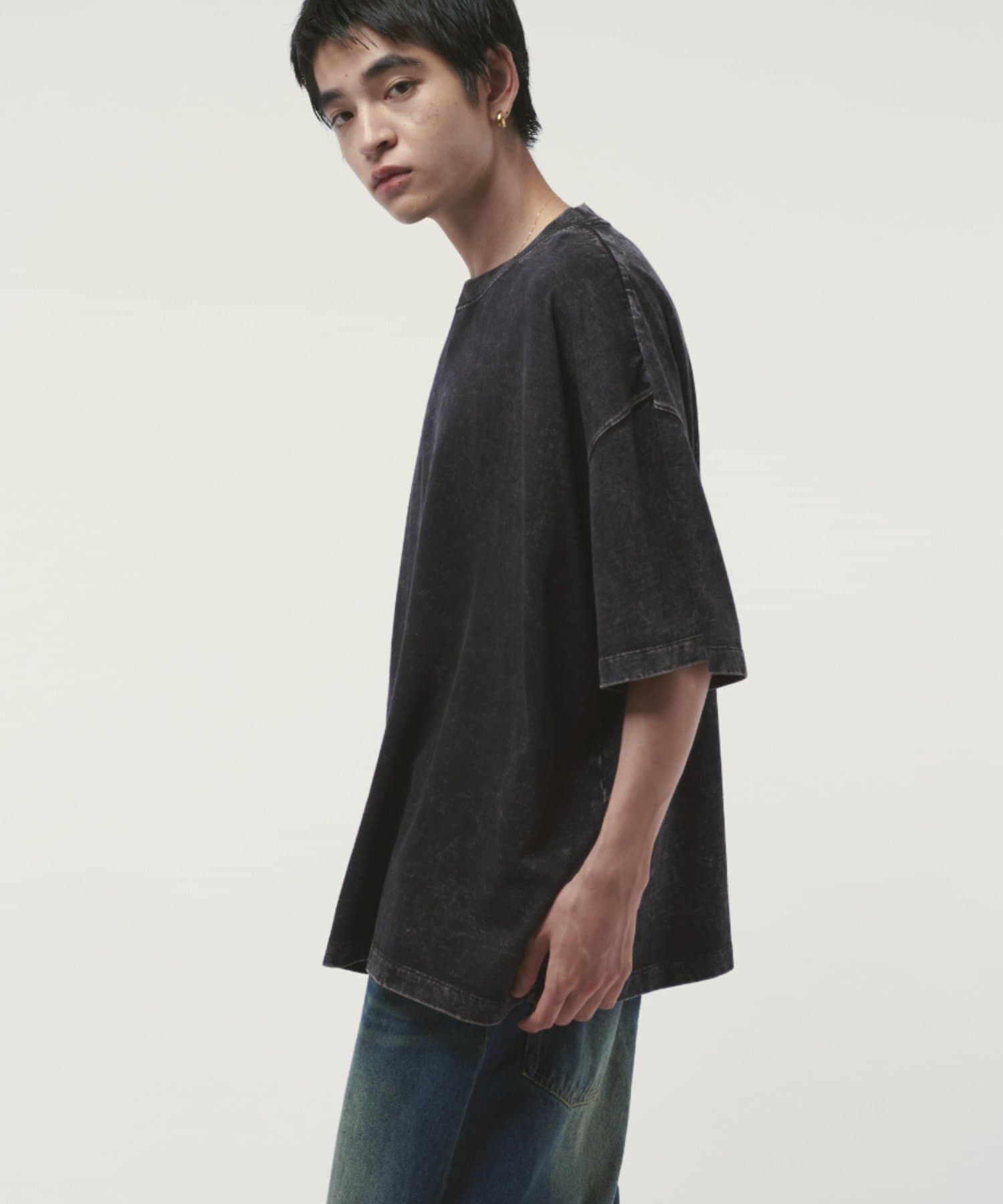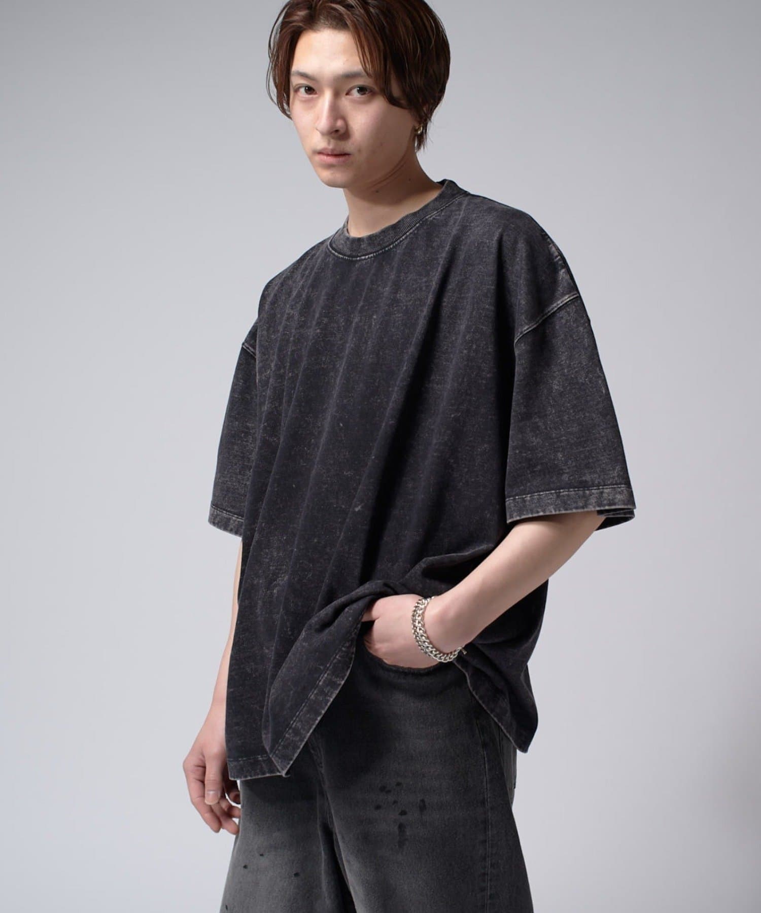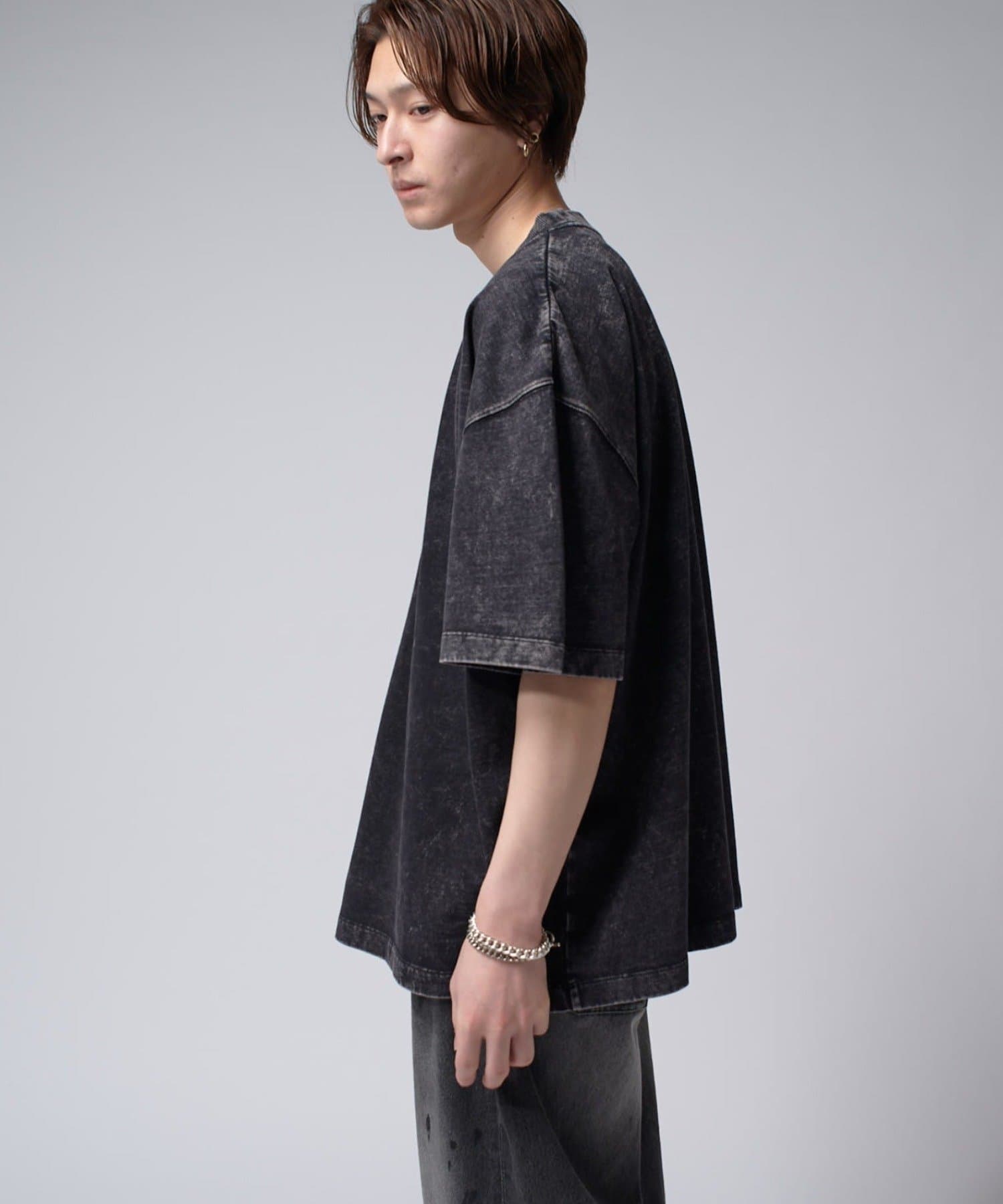 コットンにパウダーブリーチ加工を施すことで、グランジテイストな雰囲気のある見た目に仕上がりました。着丈と身幅を広く取ったオーバーサイズで一枚で存在感のあるシルエットに。