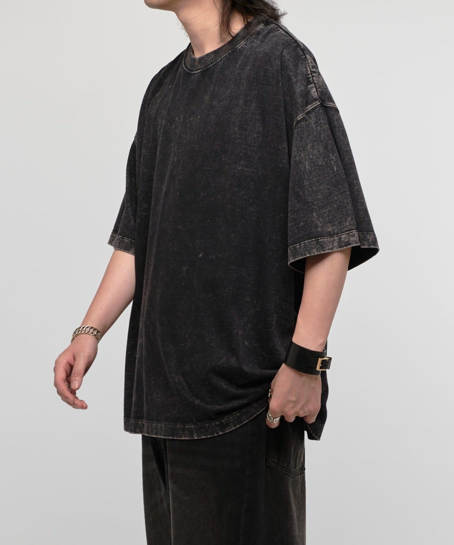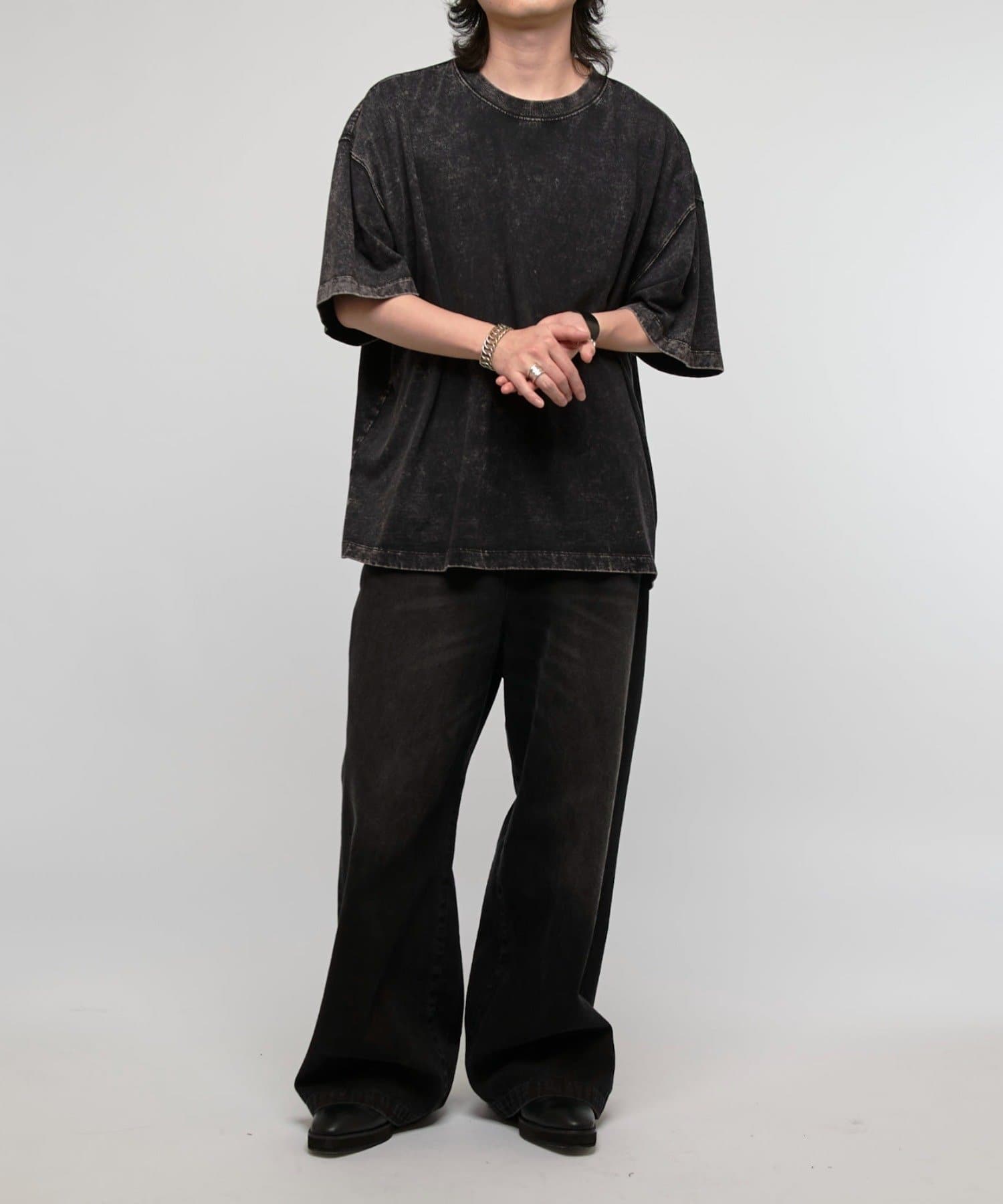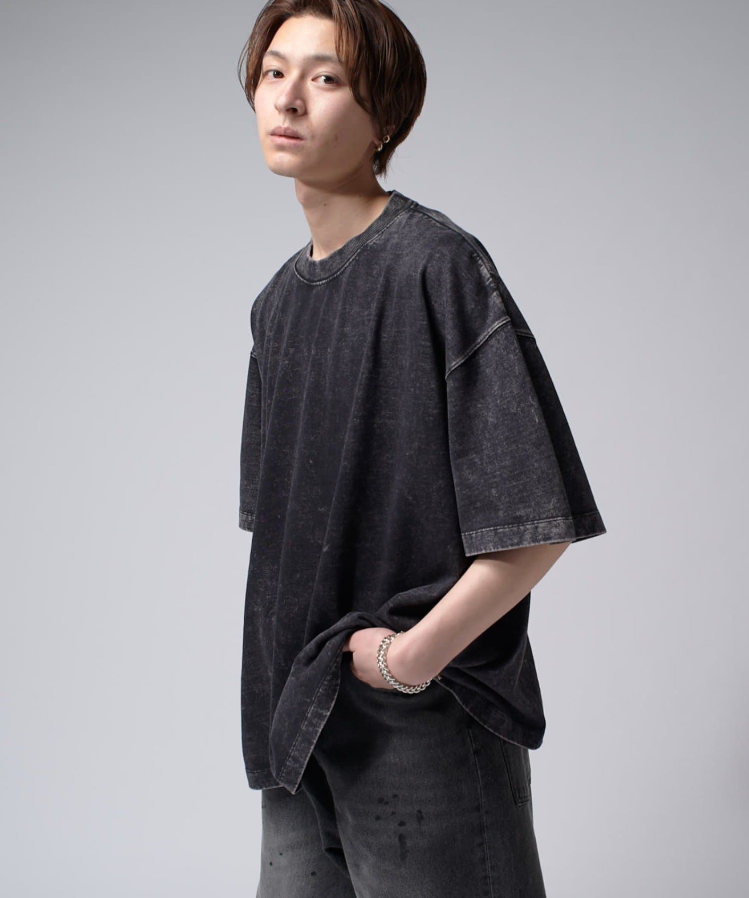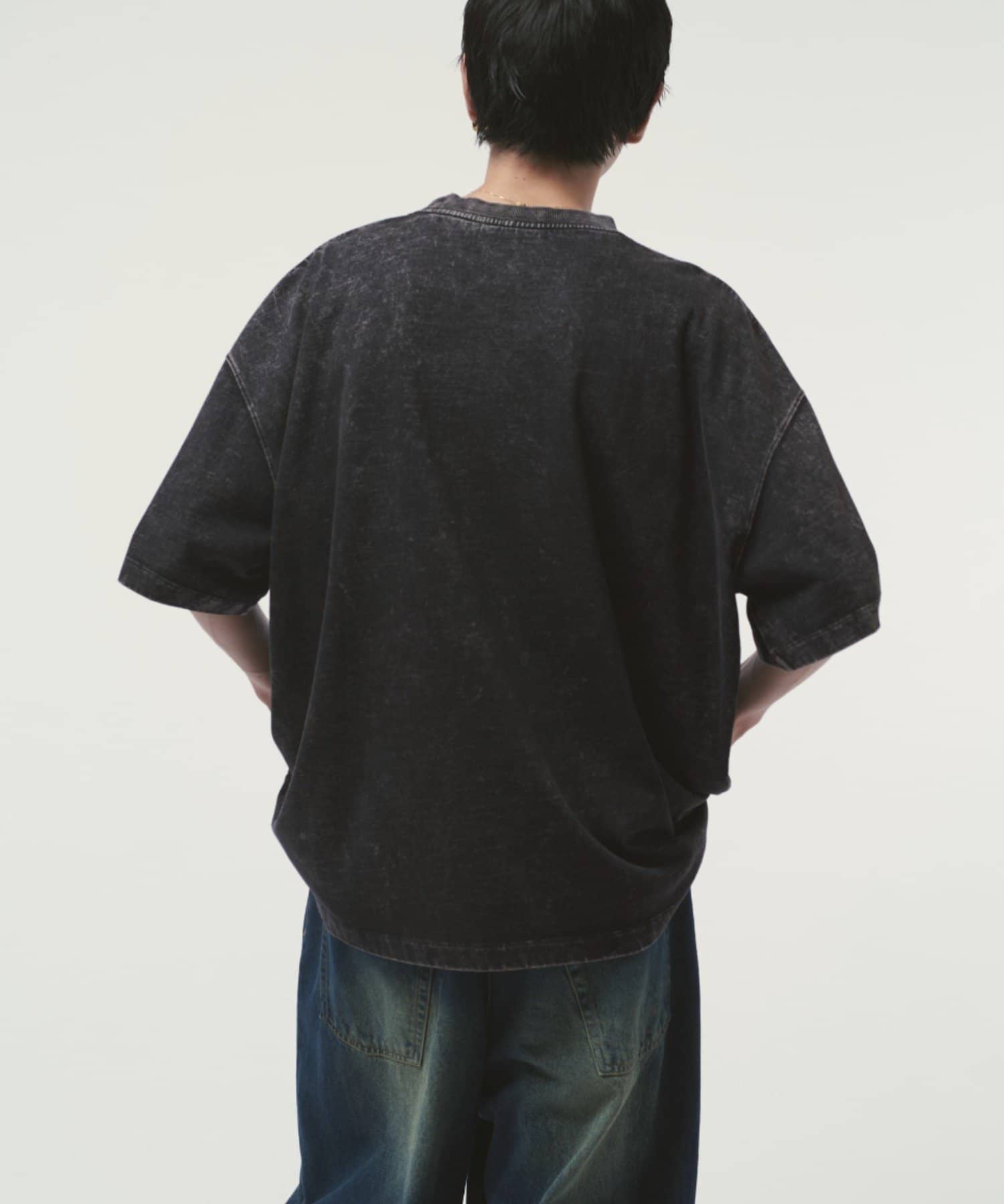 コットンにパウダーブリーチ加工を施すことで、グランジテイストな雰囲気のある見た目に仕上がりました。着丈と身幅を広く取ったオーバーサイズで一枚で存在感のあるシルエットに。