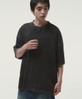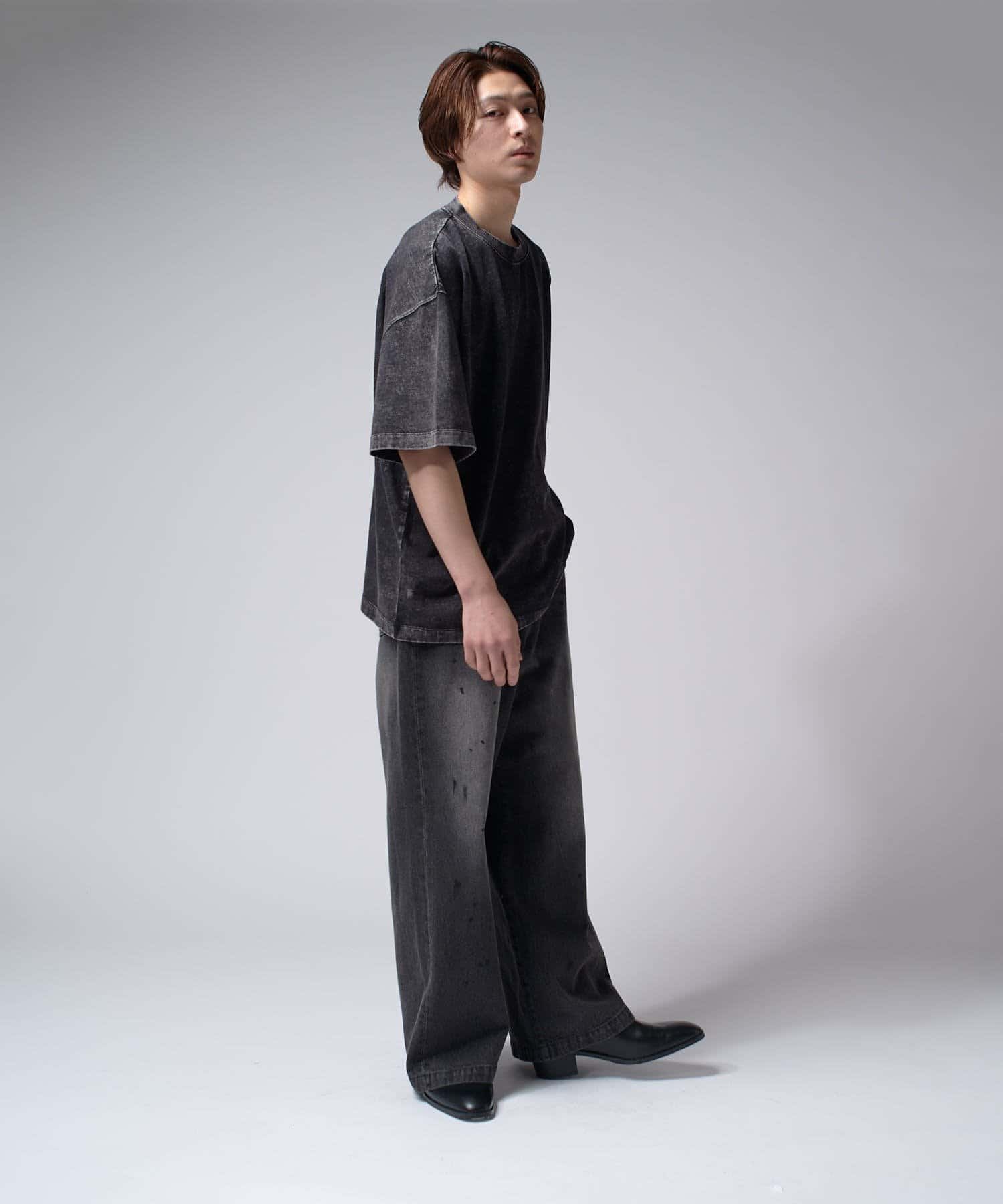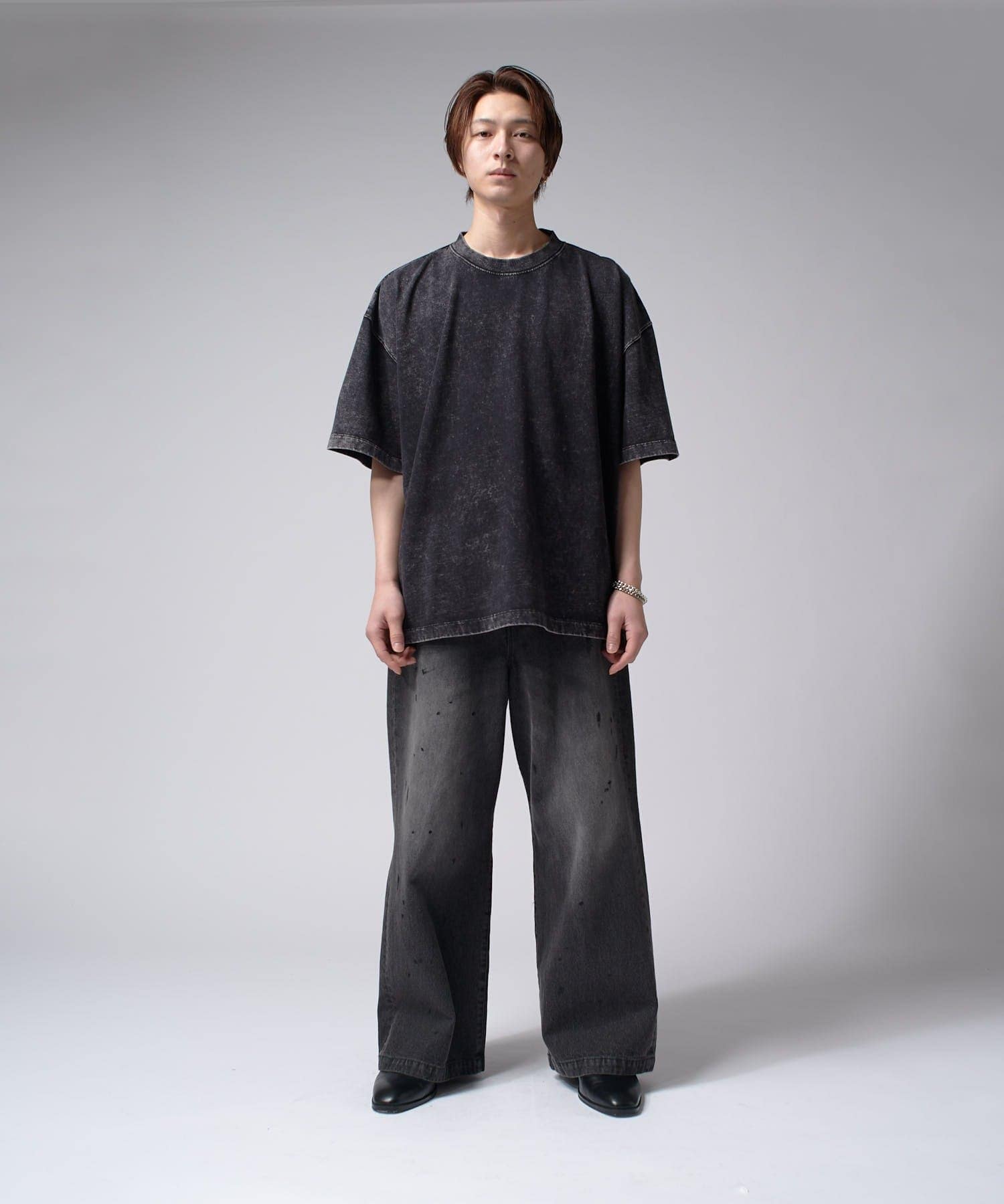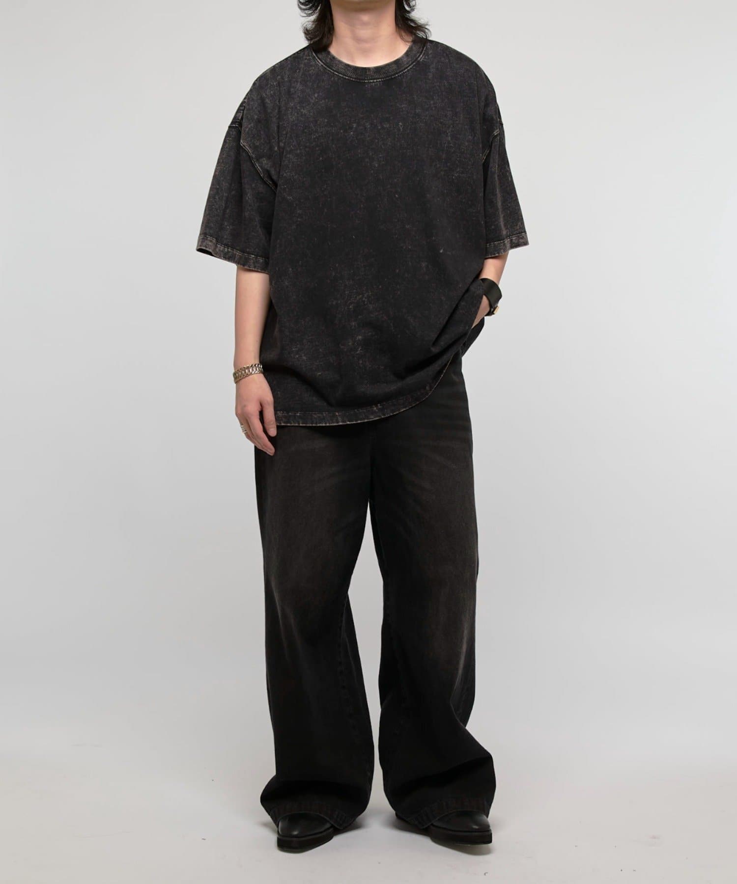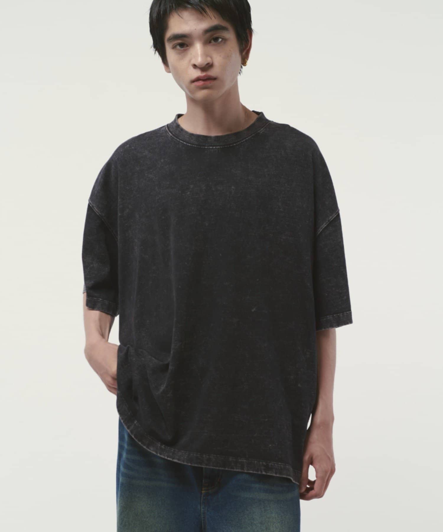 コットンにパウダーブリーチ加工を施すことで、グランジテイストな雰囲気のある見た目に仕上がりました。着丈と身幅を広く取ったオーバーサイズで一枚で存在感のあるシルエットに。