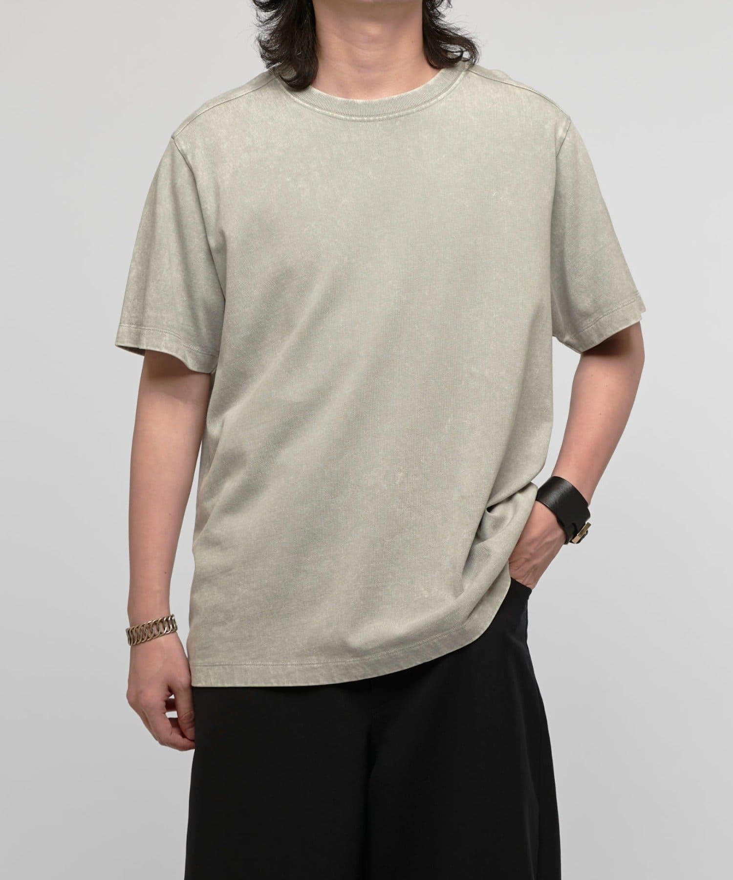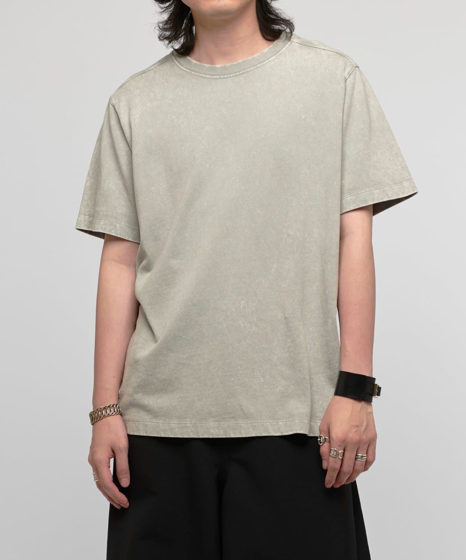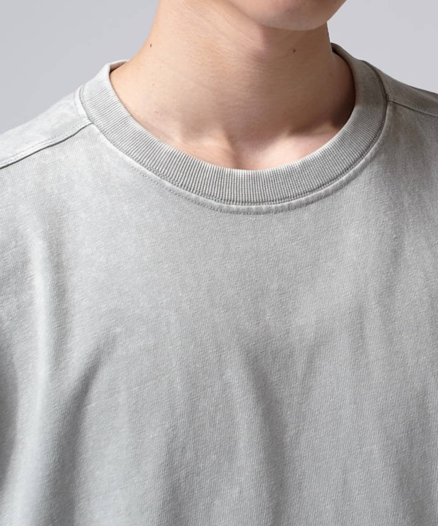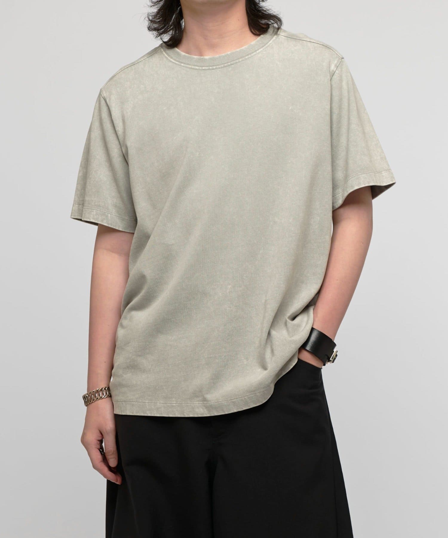 コットンにパウダーブリーチ加工を施すことで、グランジテイストな雰囲気のある見た目に仕上がりました。肩はセットインでミニマルに仕上げたベーシックかつコンパクトなサイズ感に。