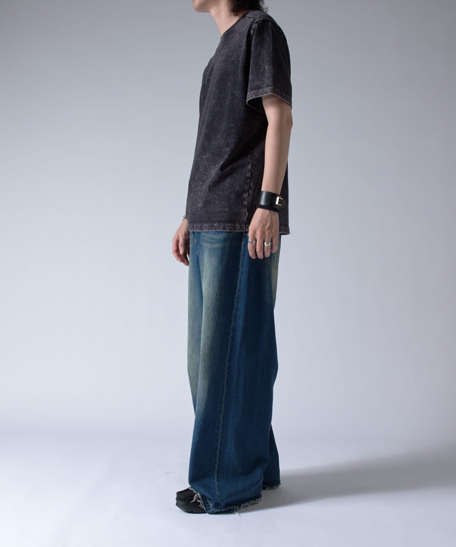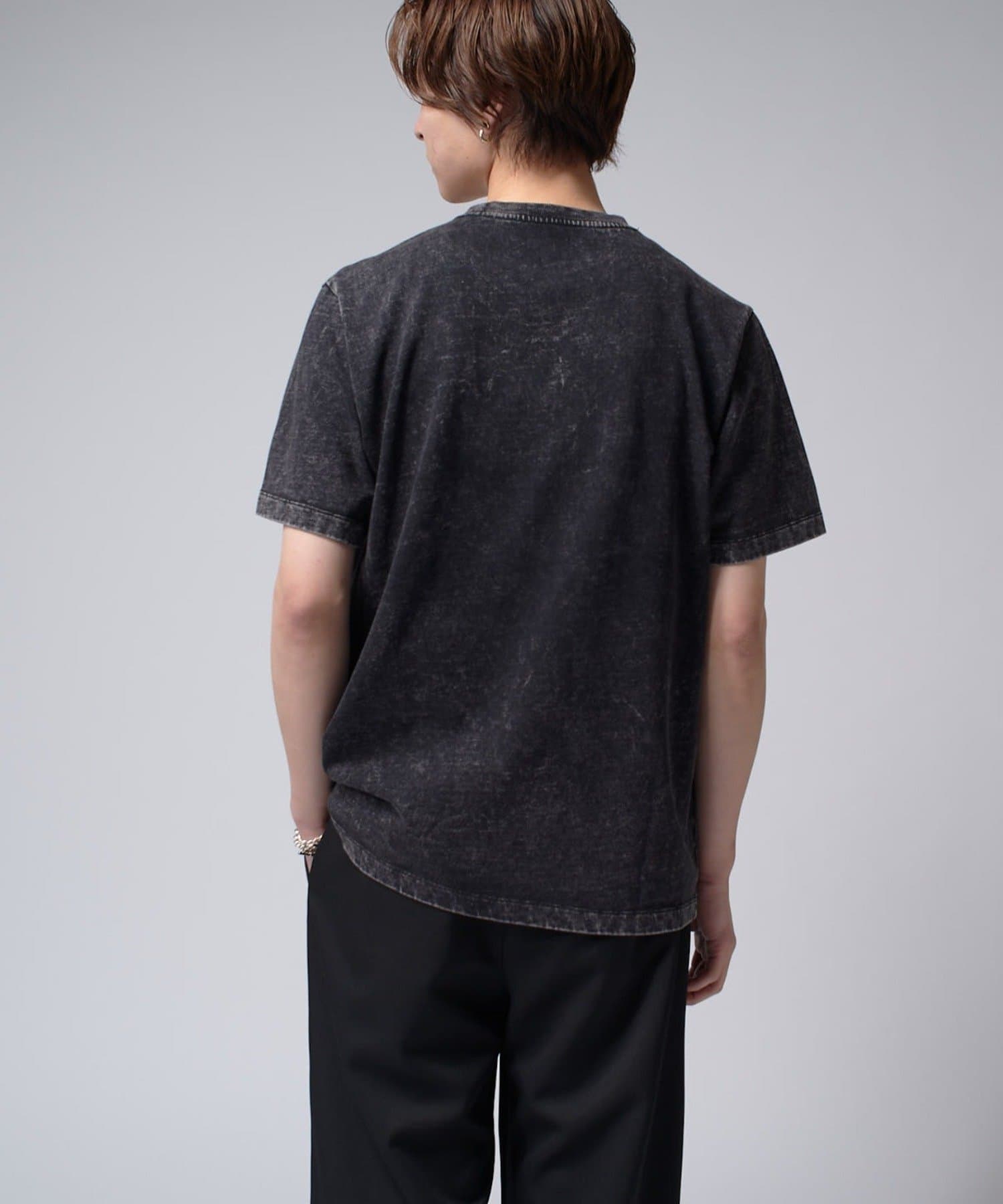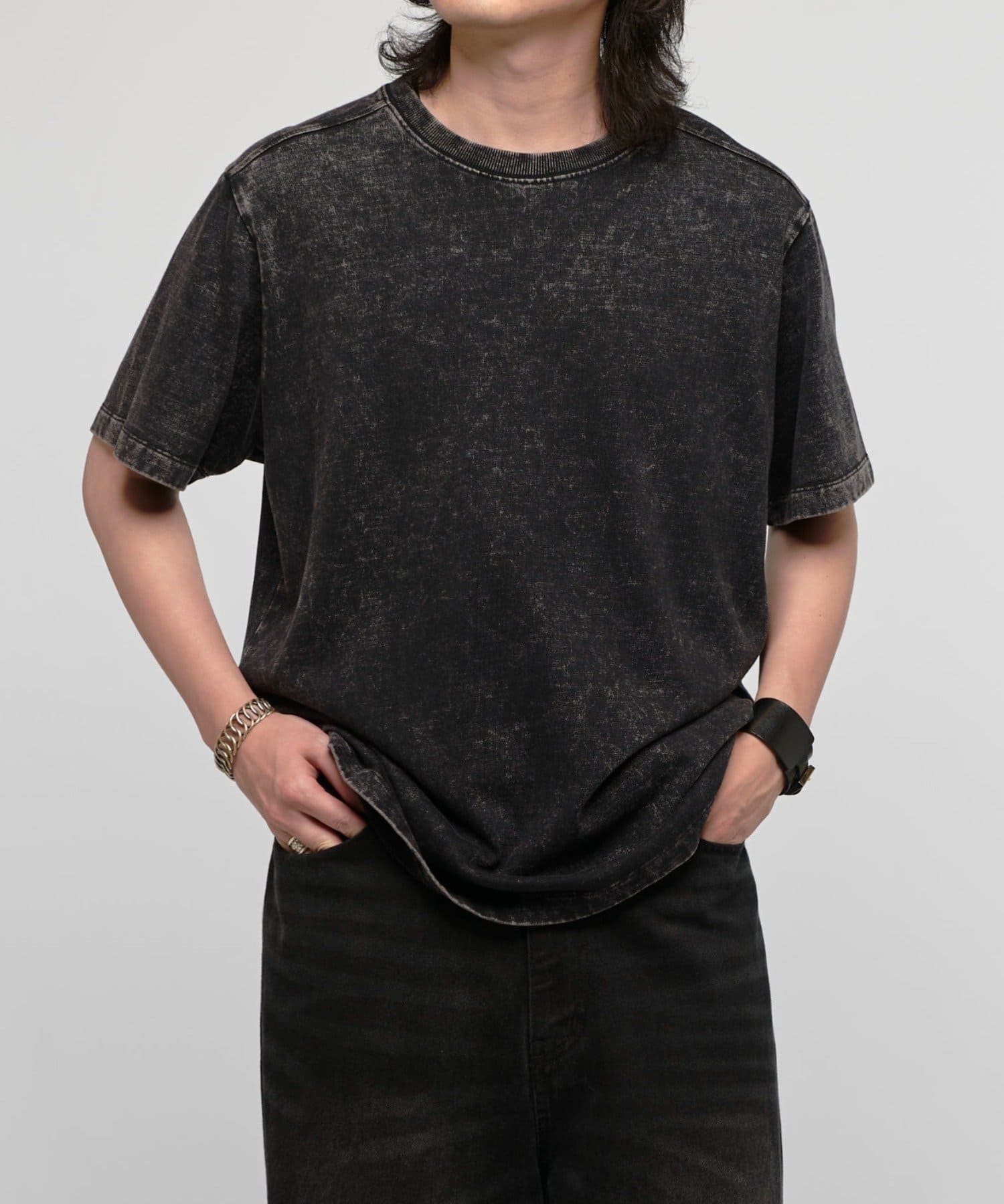 コットンにパウダーブリーチ加工を施すことで、グランジテイストな雰囲気のある見た目に仕上がりました。肩はセットインでミニマルに仕上げたベーシックかつコンパクトなサイズ感に。