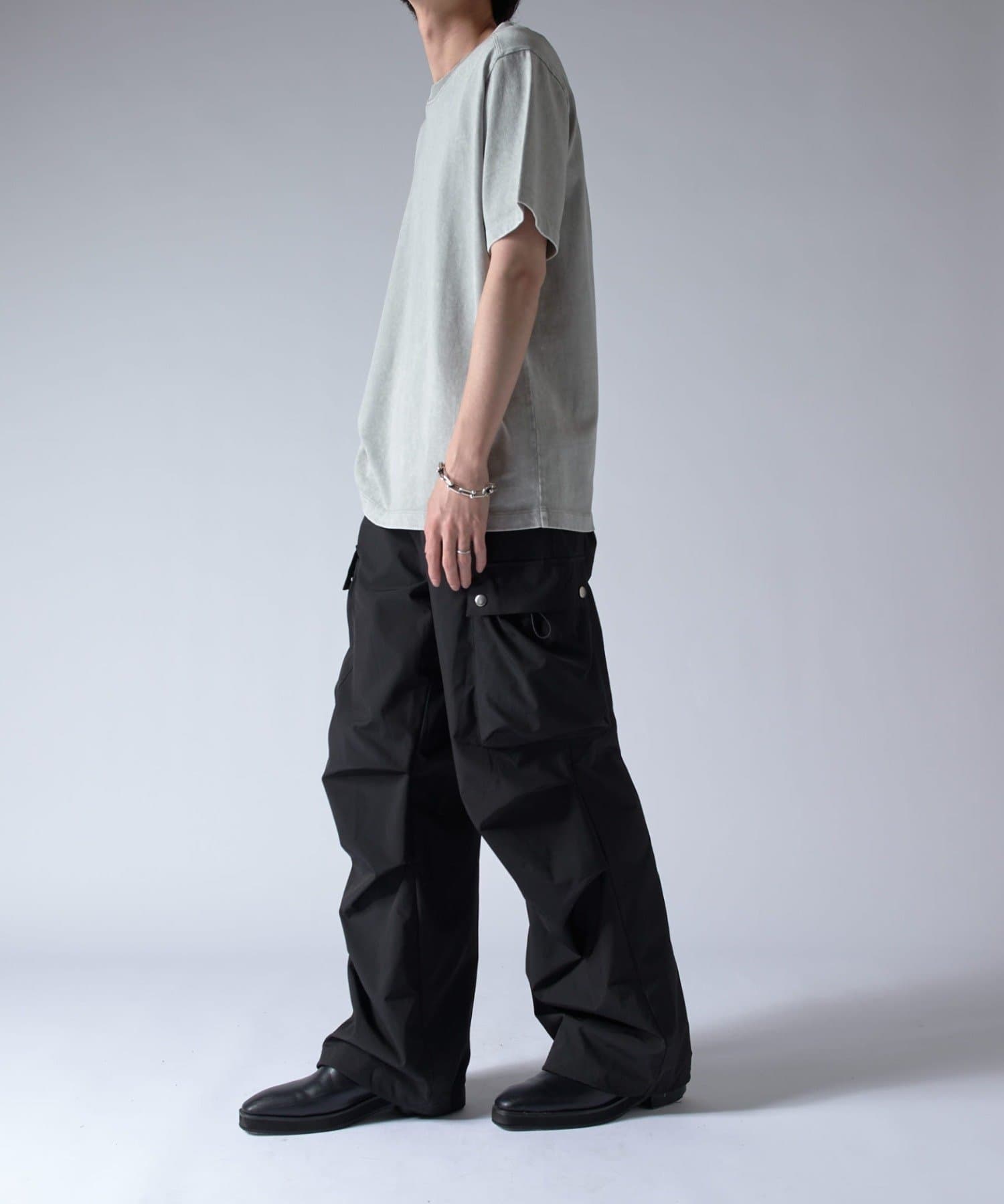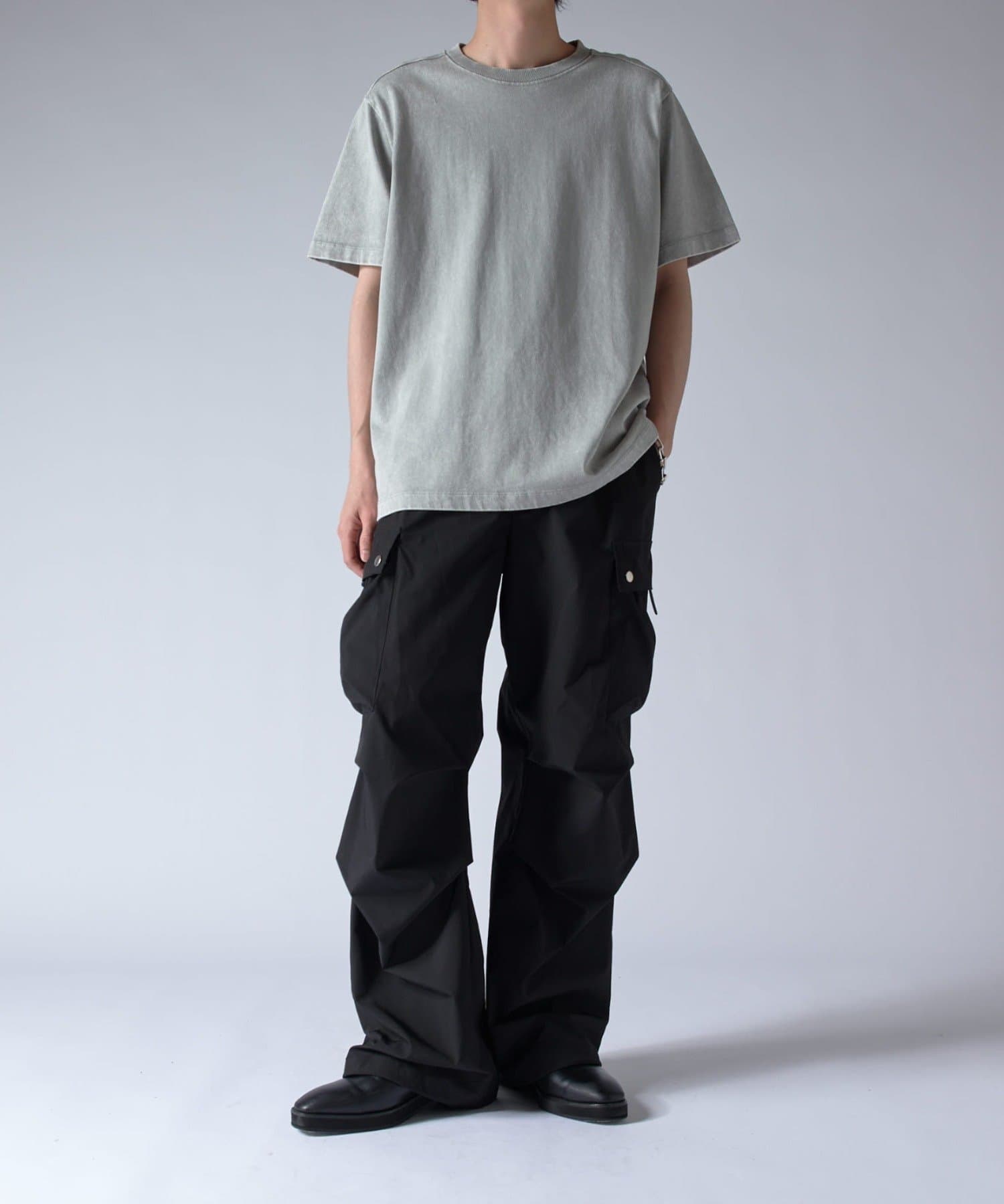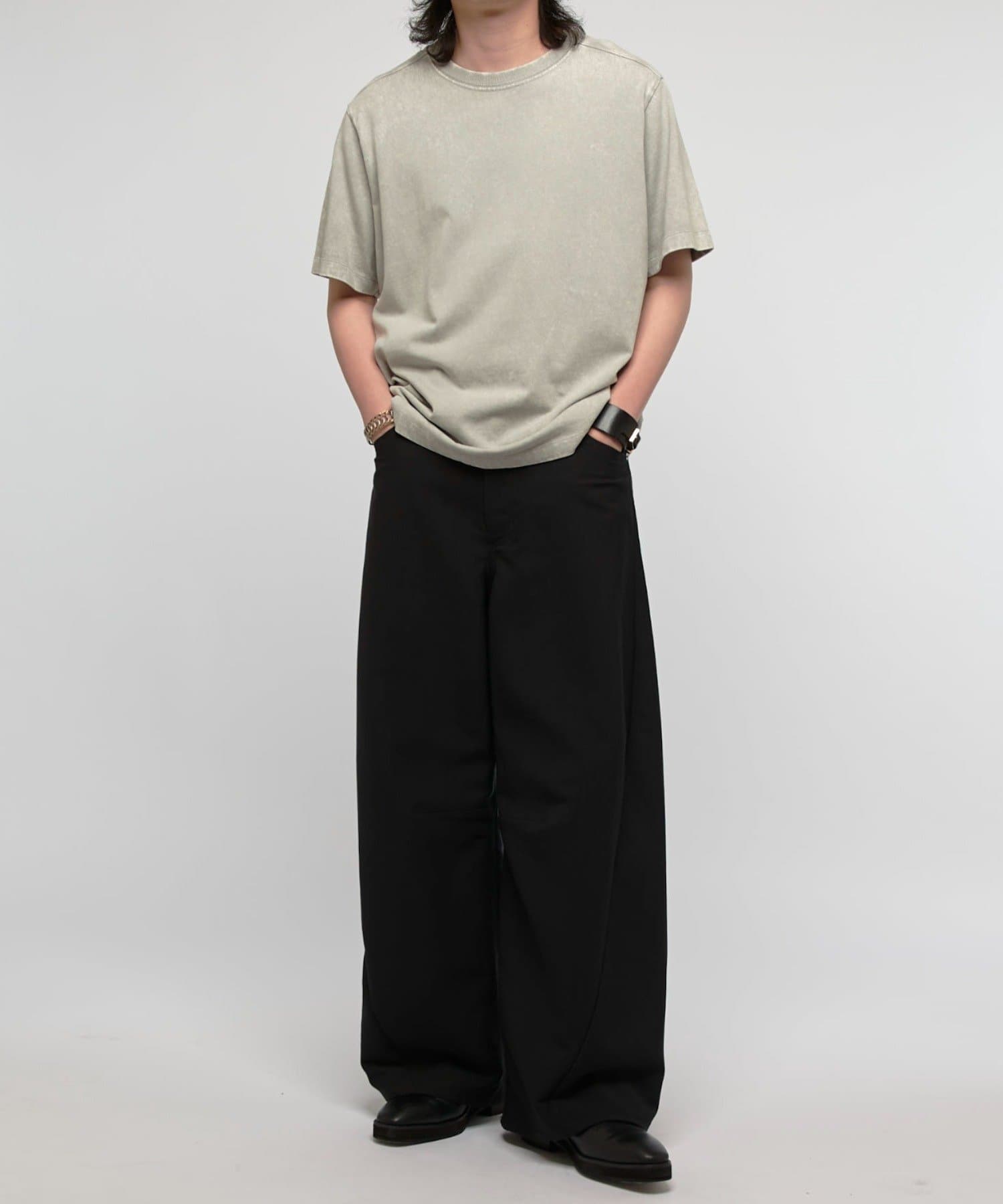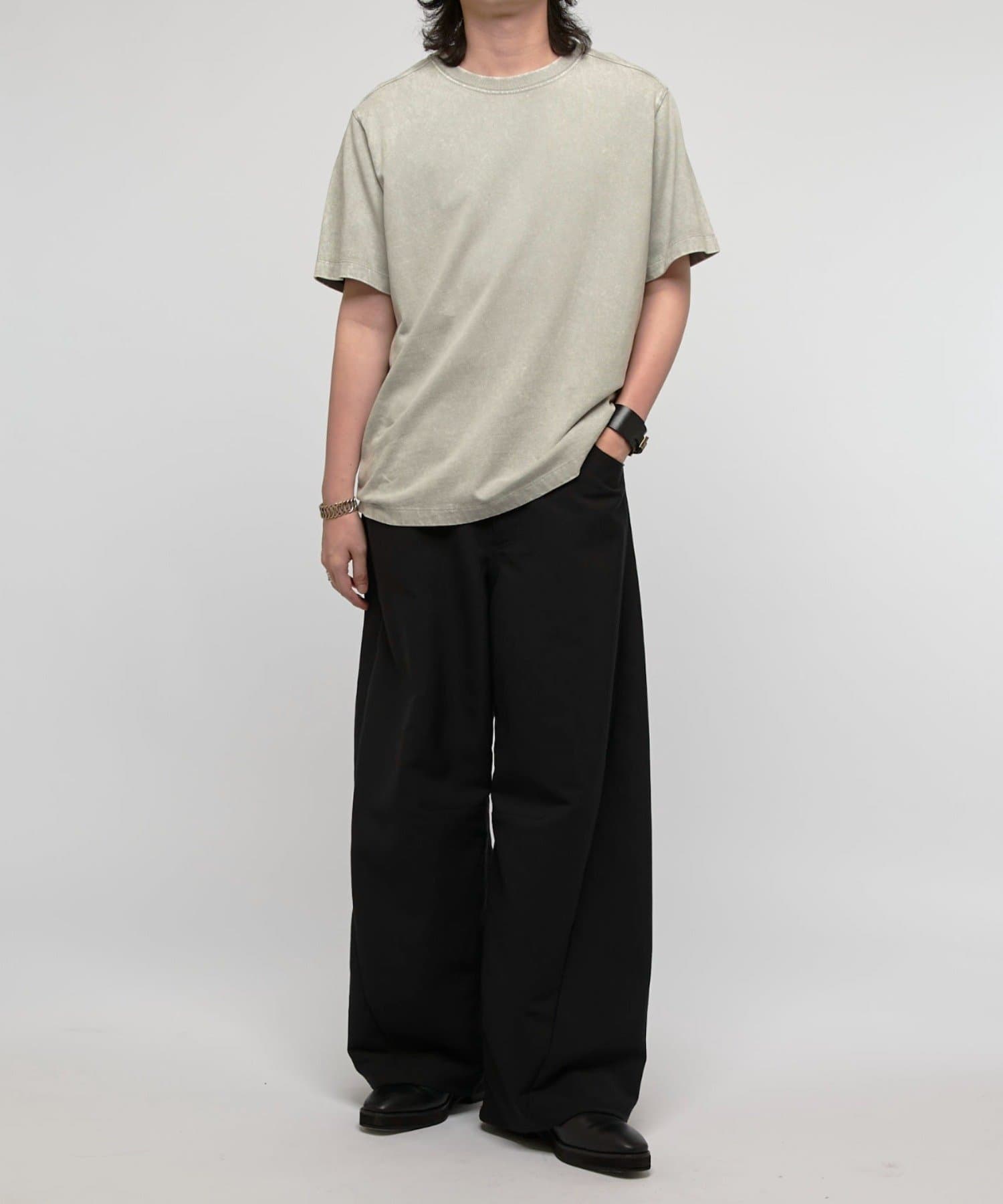 コットンにパウダーブリーチ加工を施すことで、グランジテイストな雰囲気のある見た目に仕上がりました。肩はセットインでミニマルに仕上げたベーシックかつコンパクトなサイズ感に。
