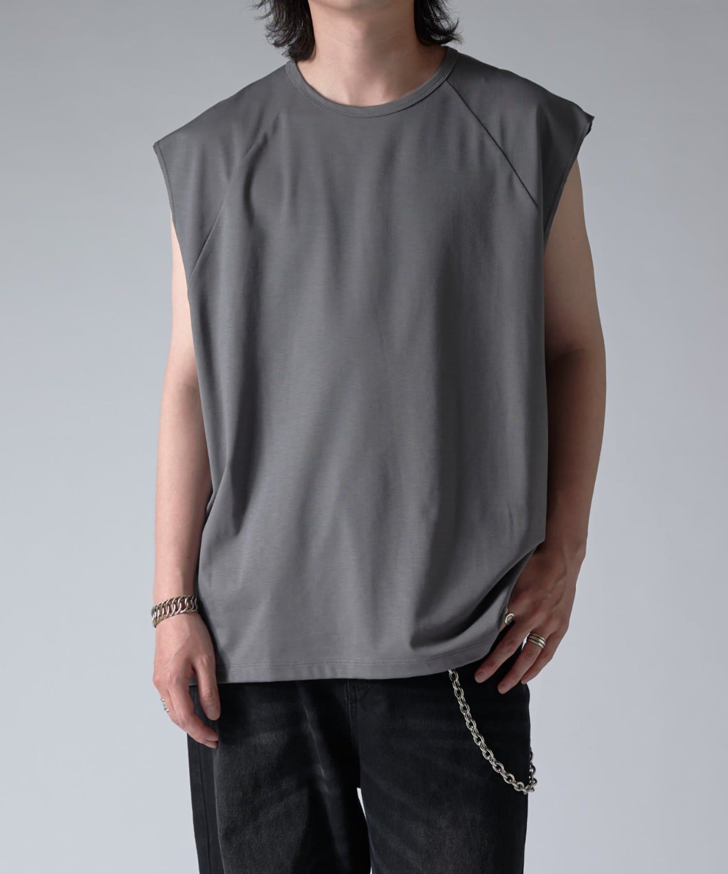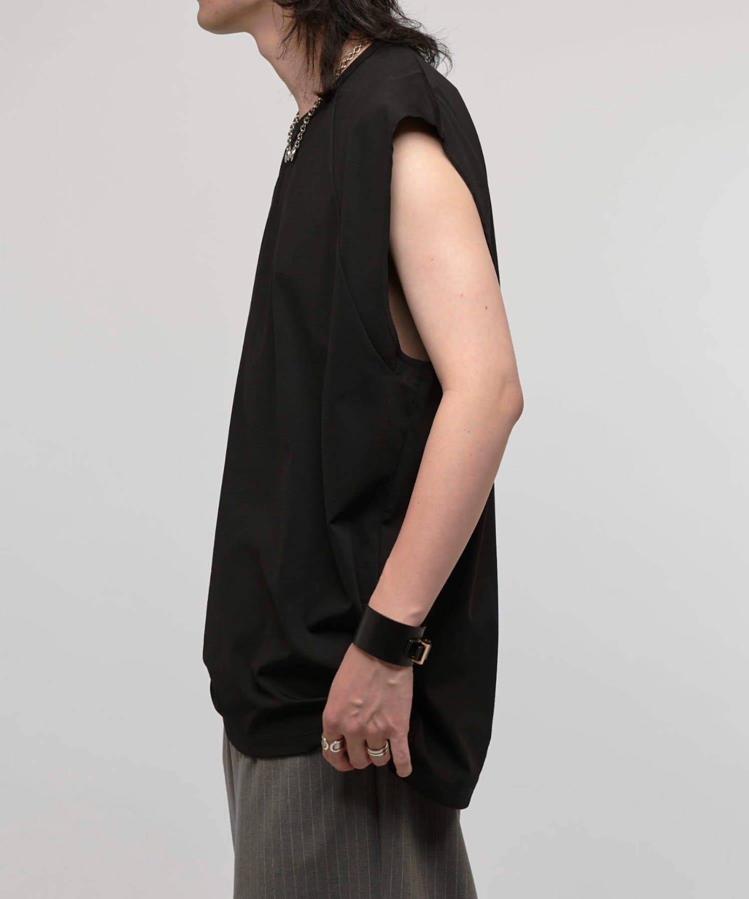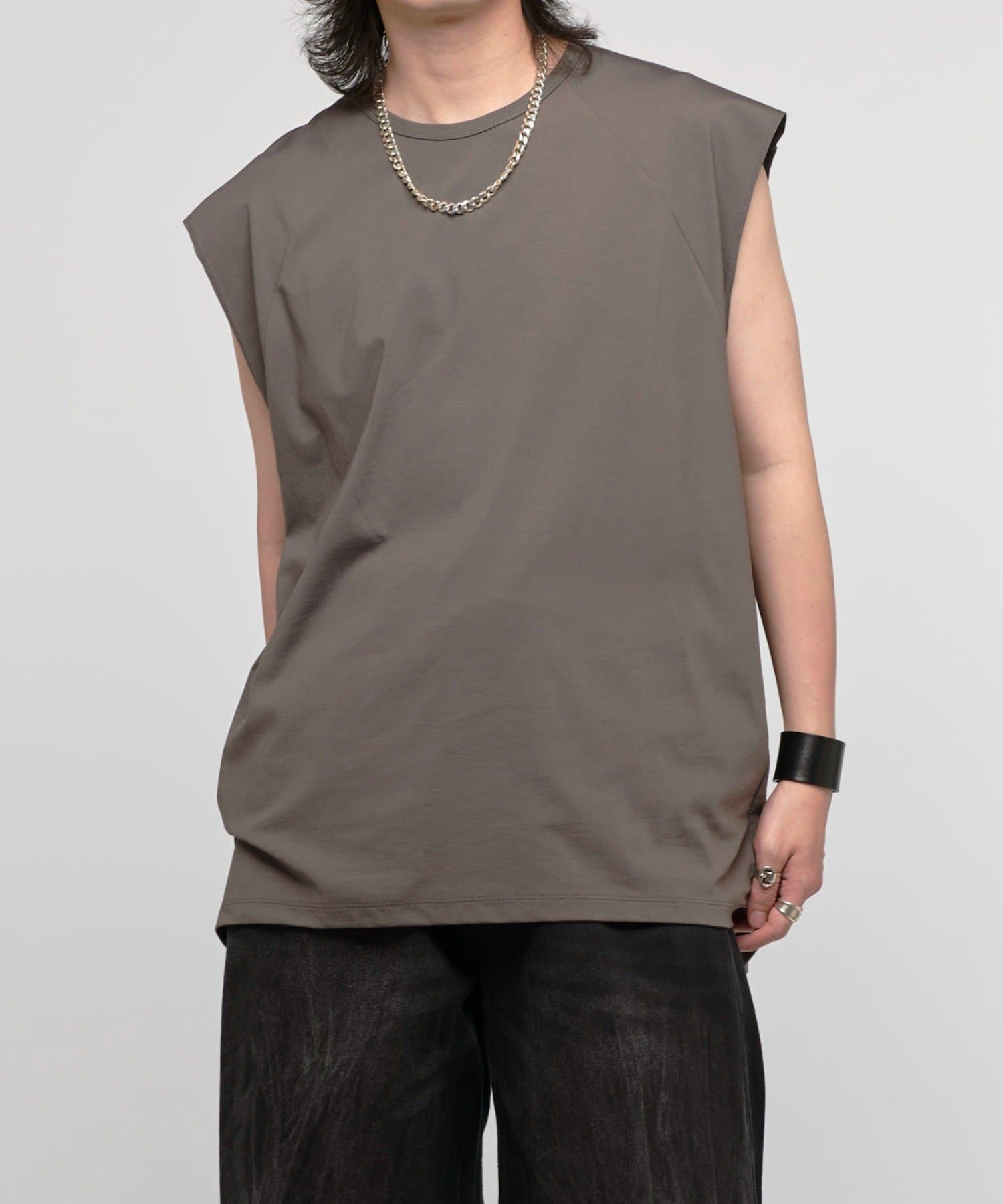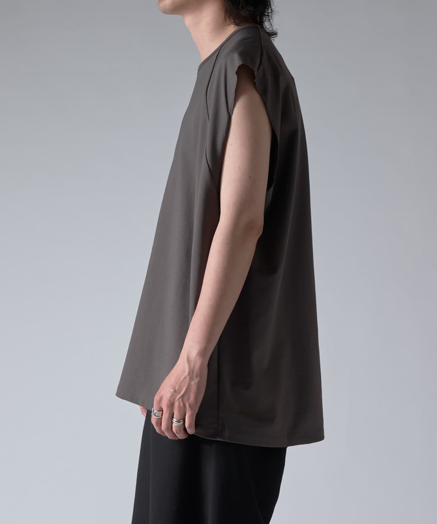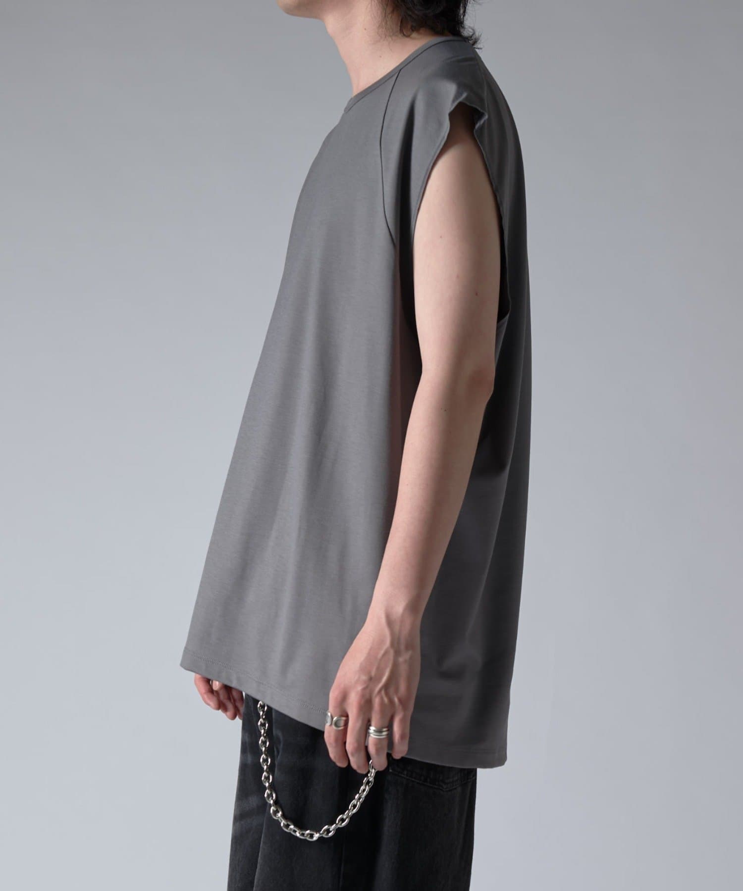 片線が落ちるドロップショルダー仕様で、袖を無くしたノースリーブ仕様のカットソー。