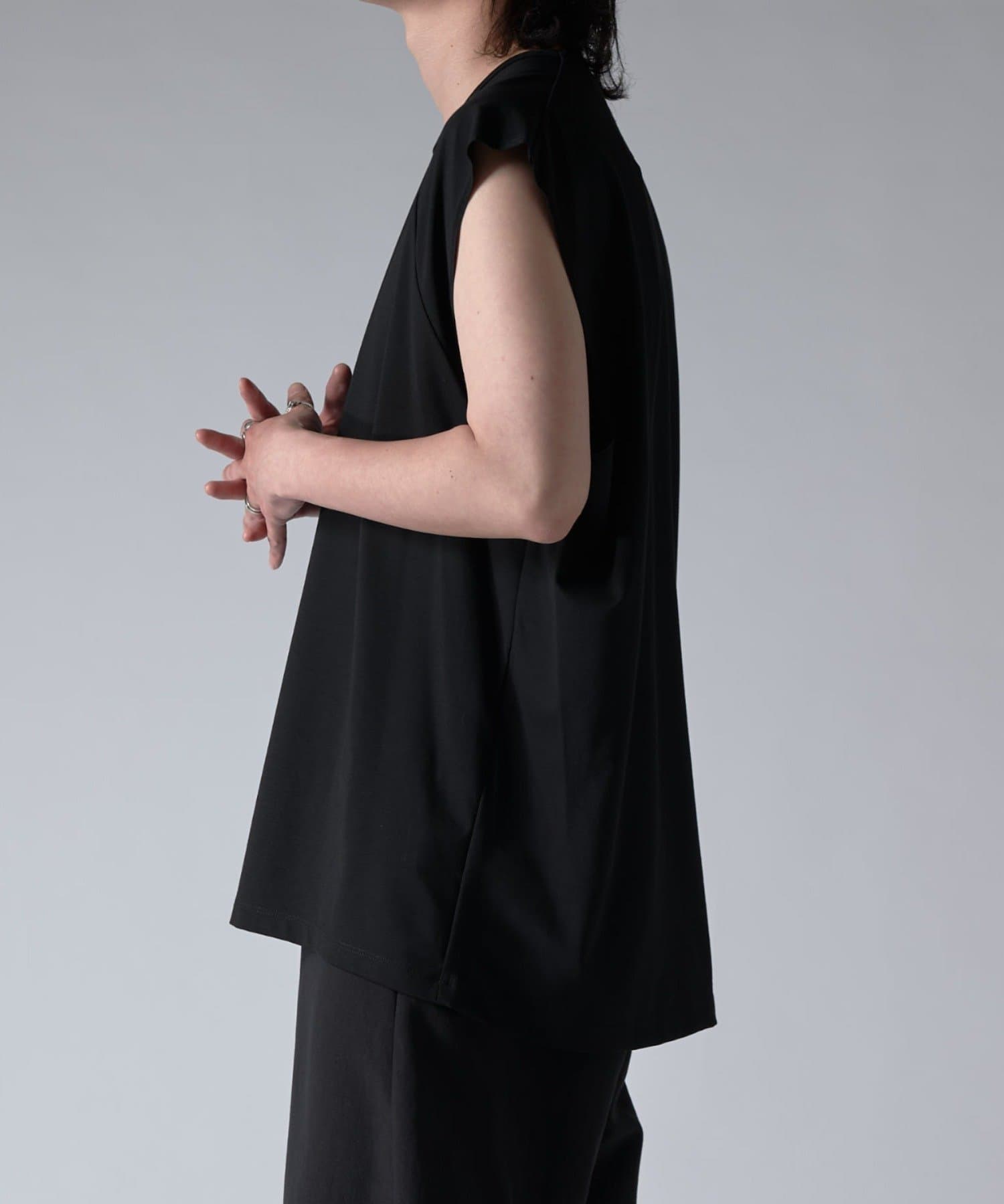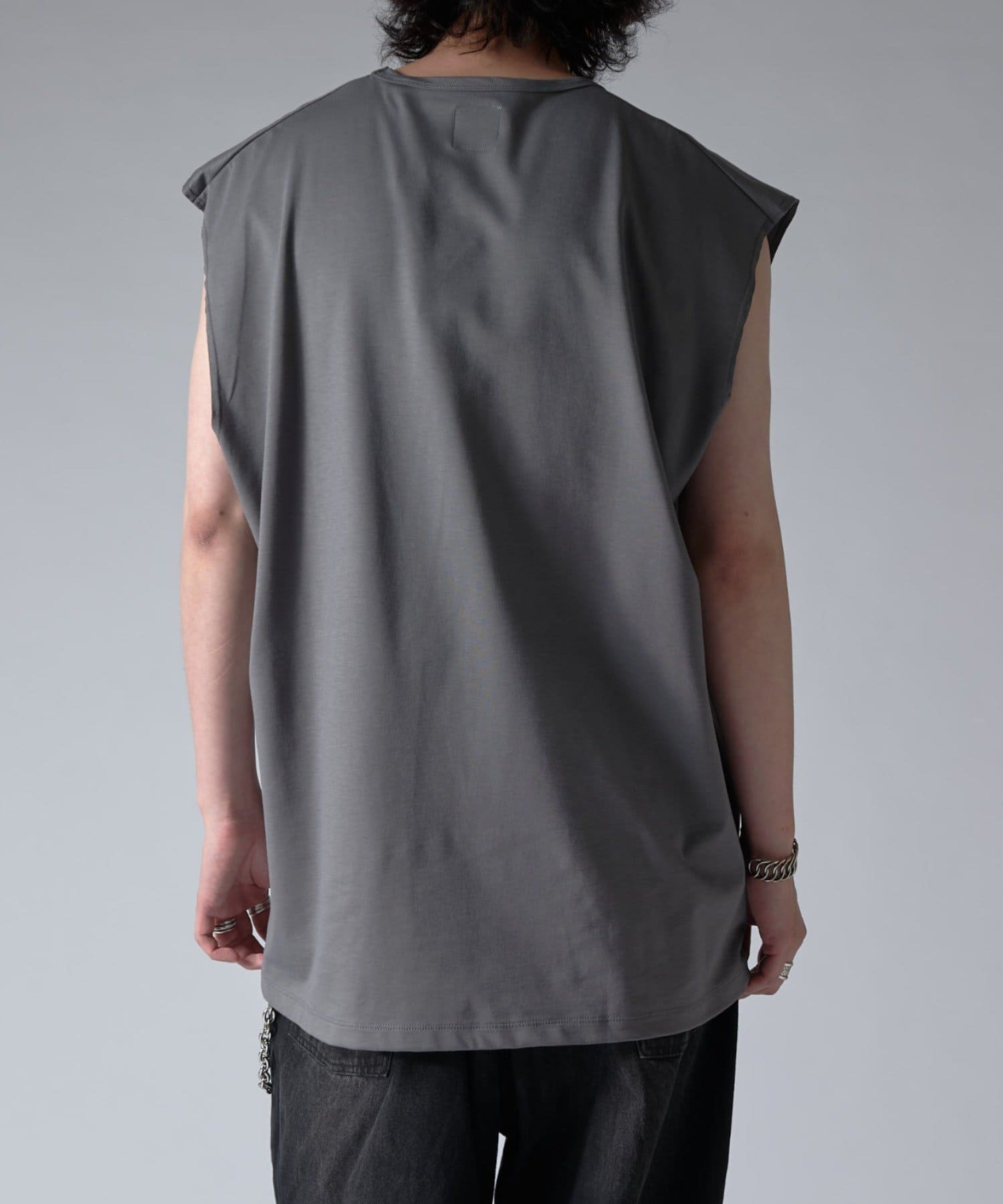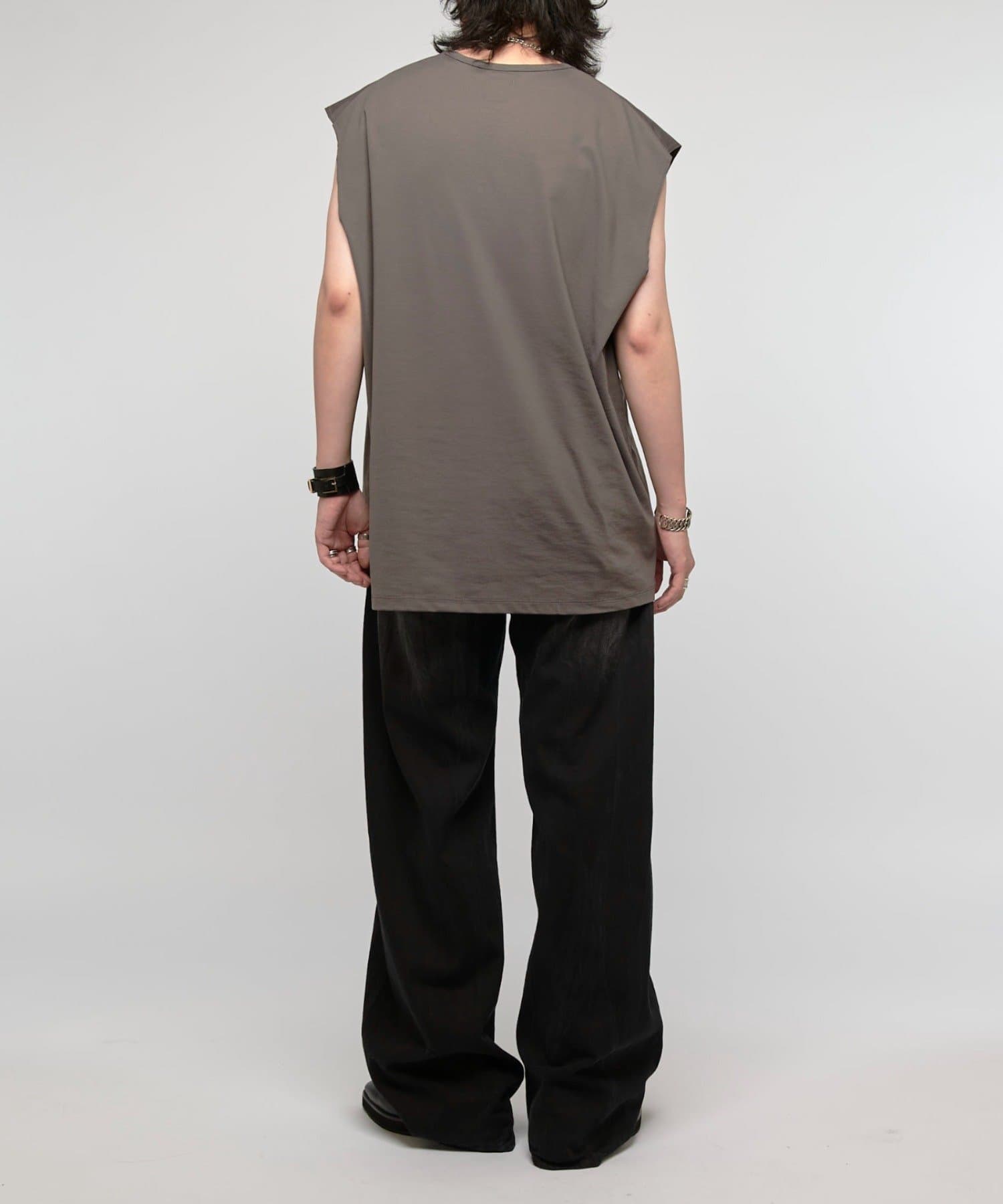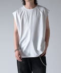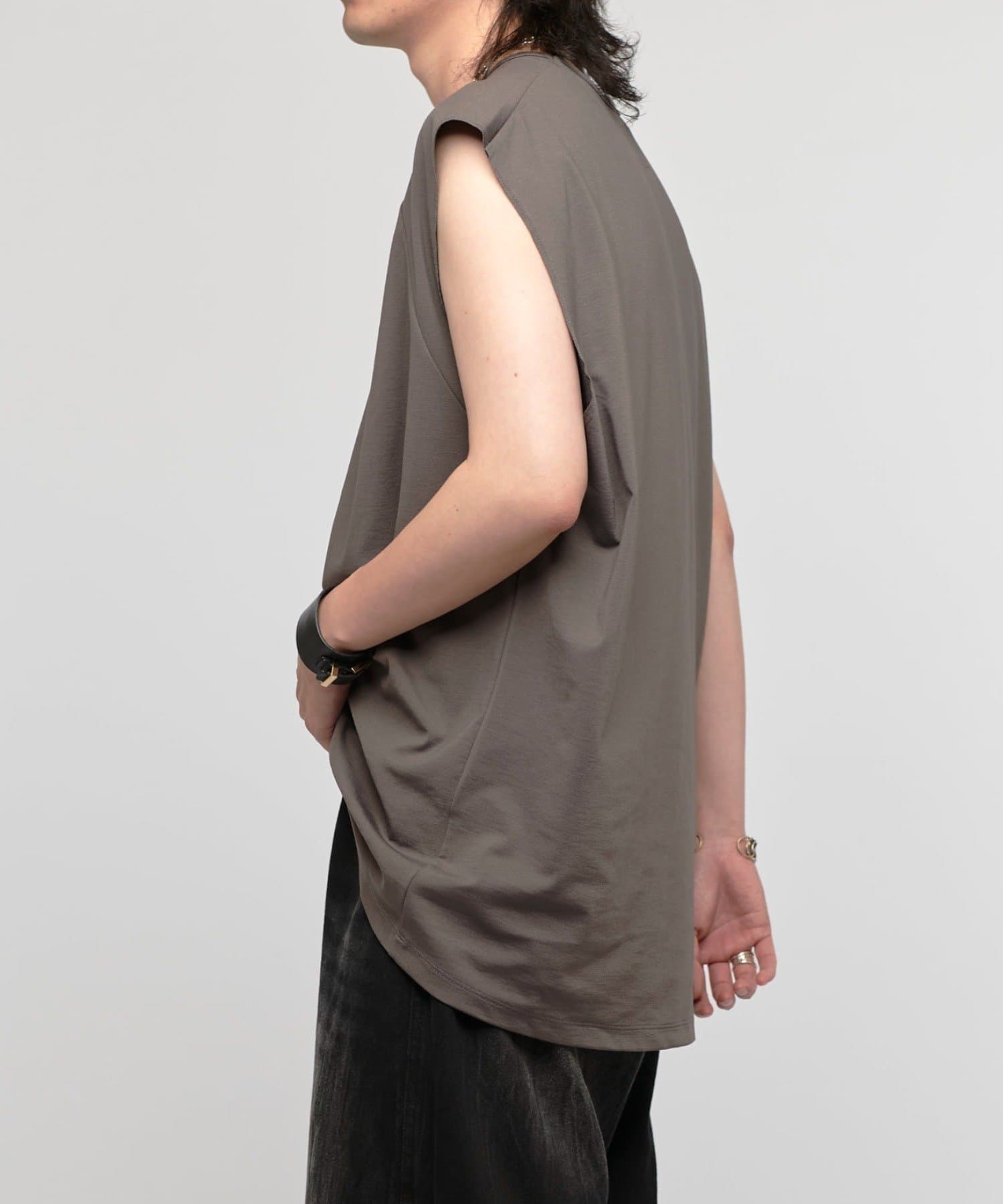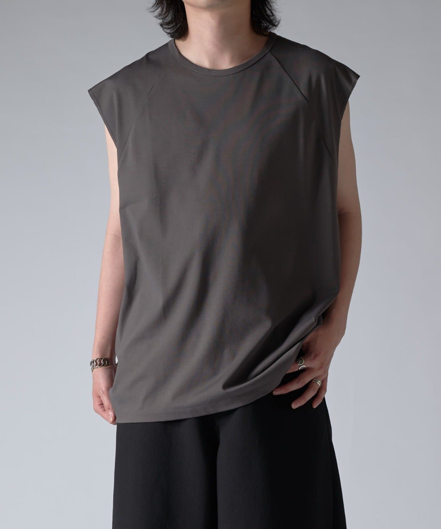 片線が落ちるドロップショルダー仕様で、袖を無くしたノースリーブ仕様のカットソー。