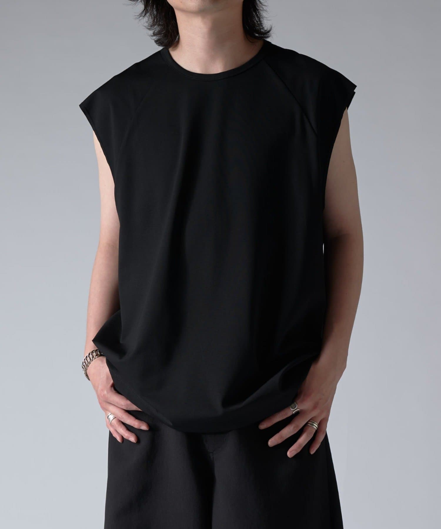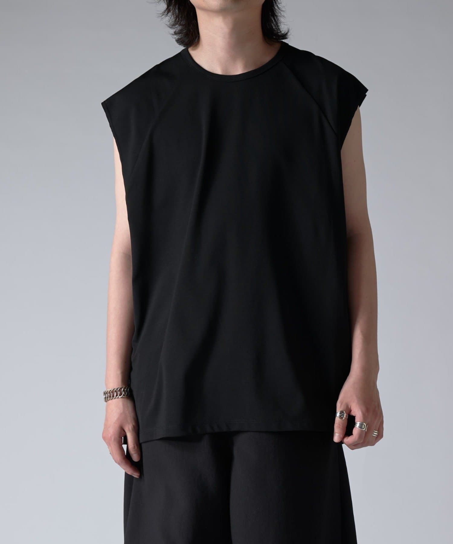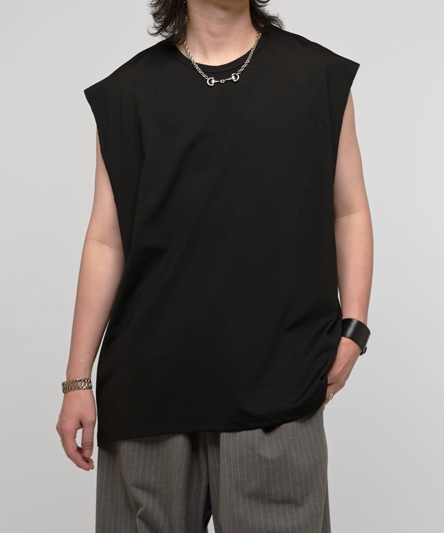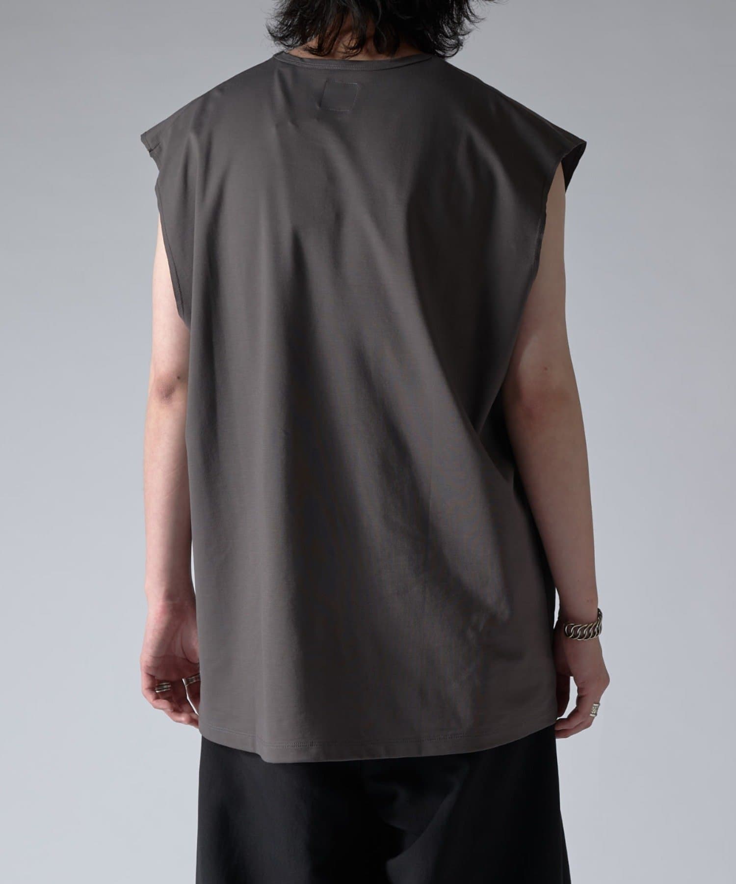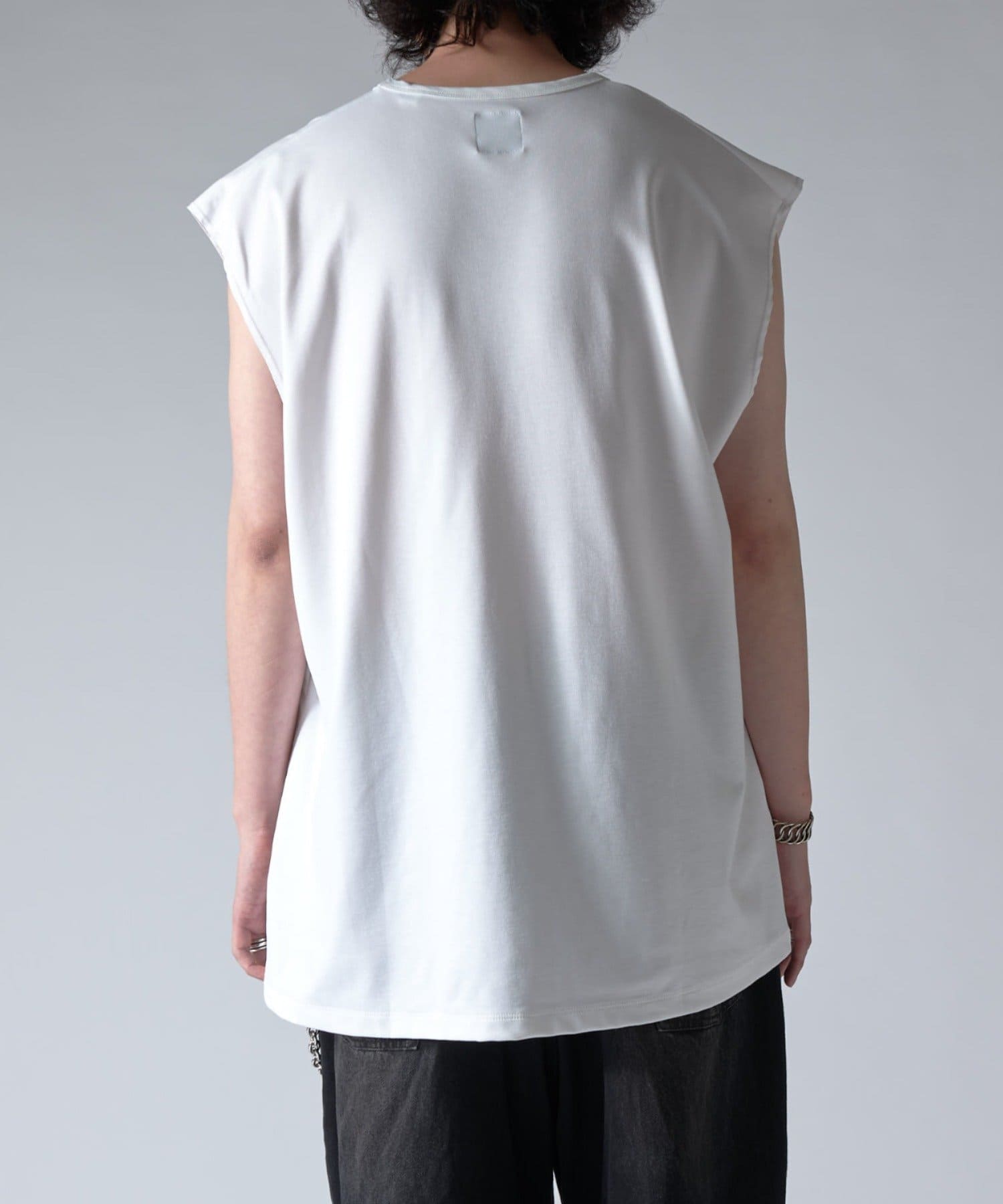 片線が落ちるドロップショルダー仕様で、袖を無くしたノースリーブ仕様のカットソー。