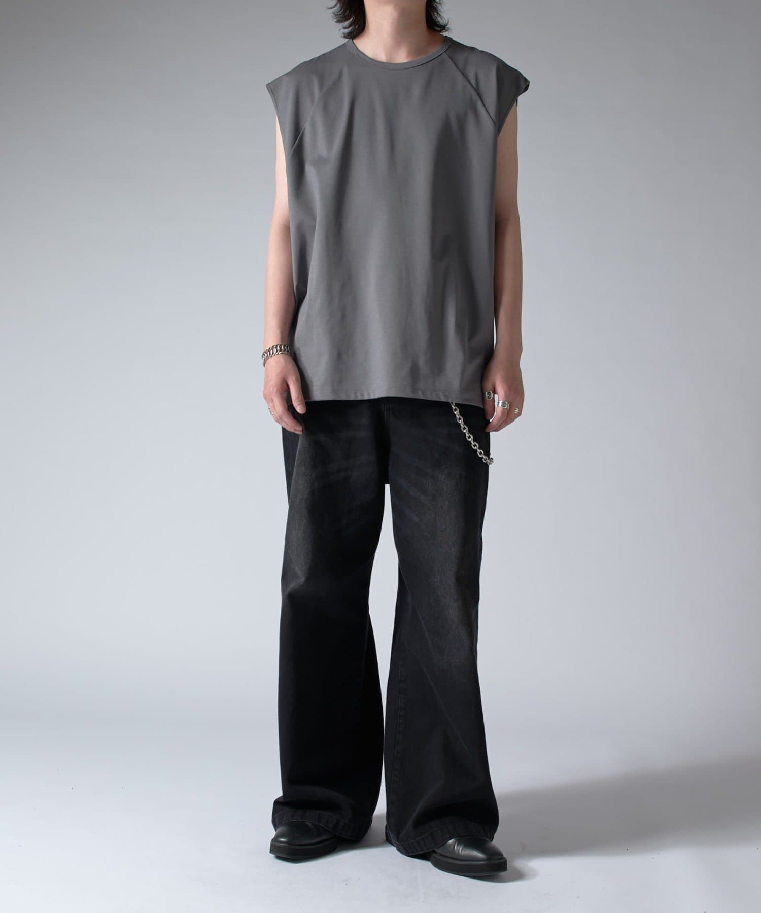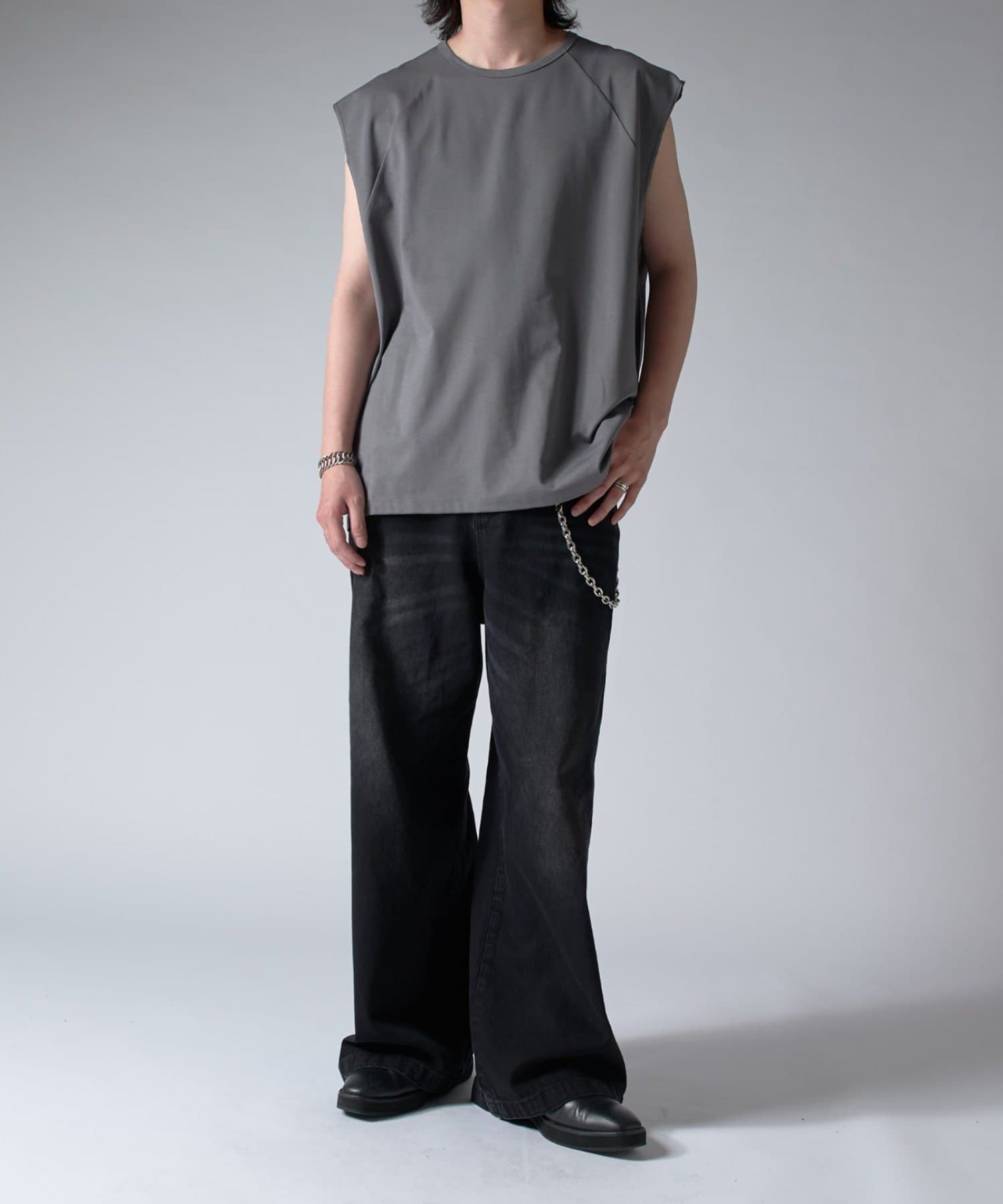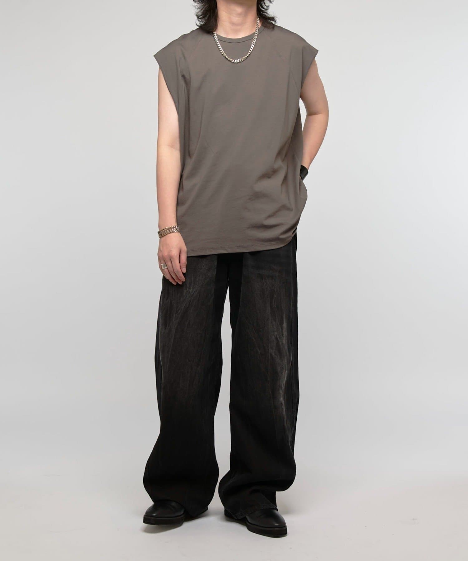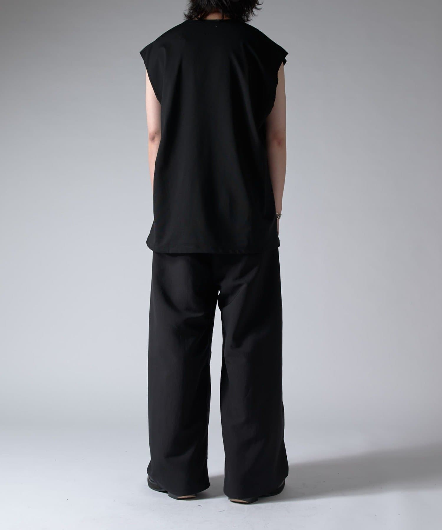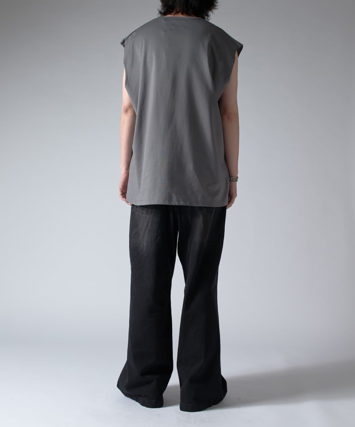 片線が落ちるドロップショルダー仕様で、袖を無くしたノースリーブ仕様のカットソー。