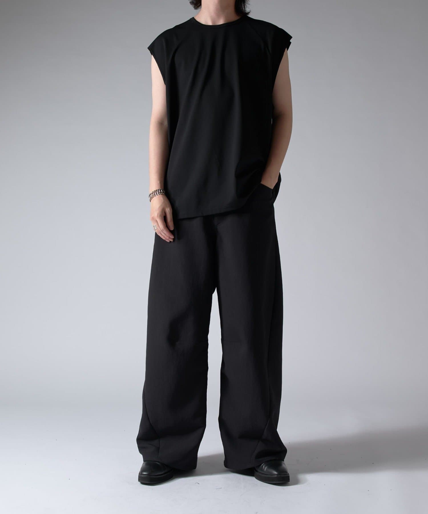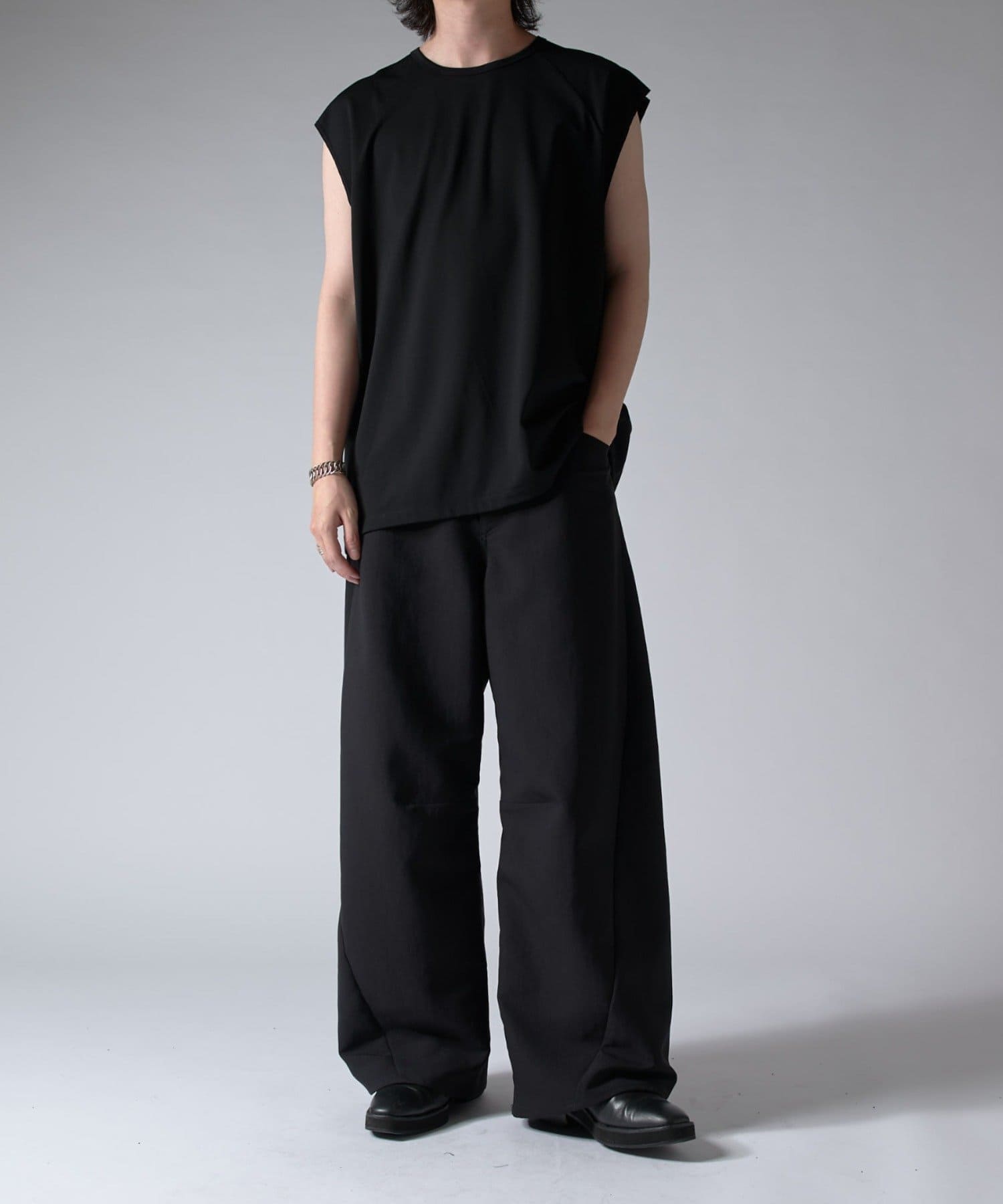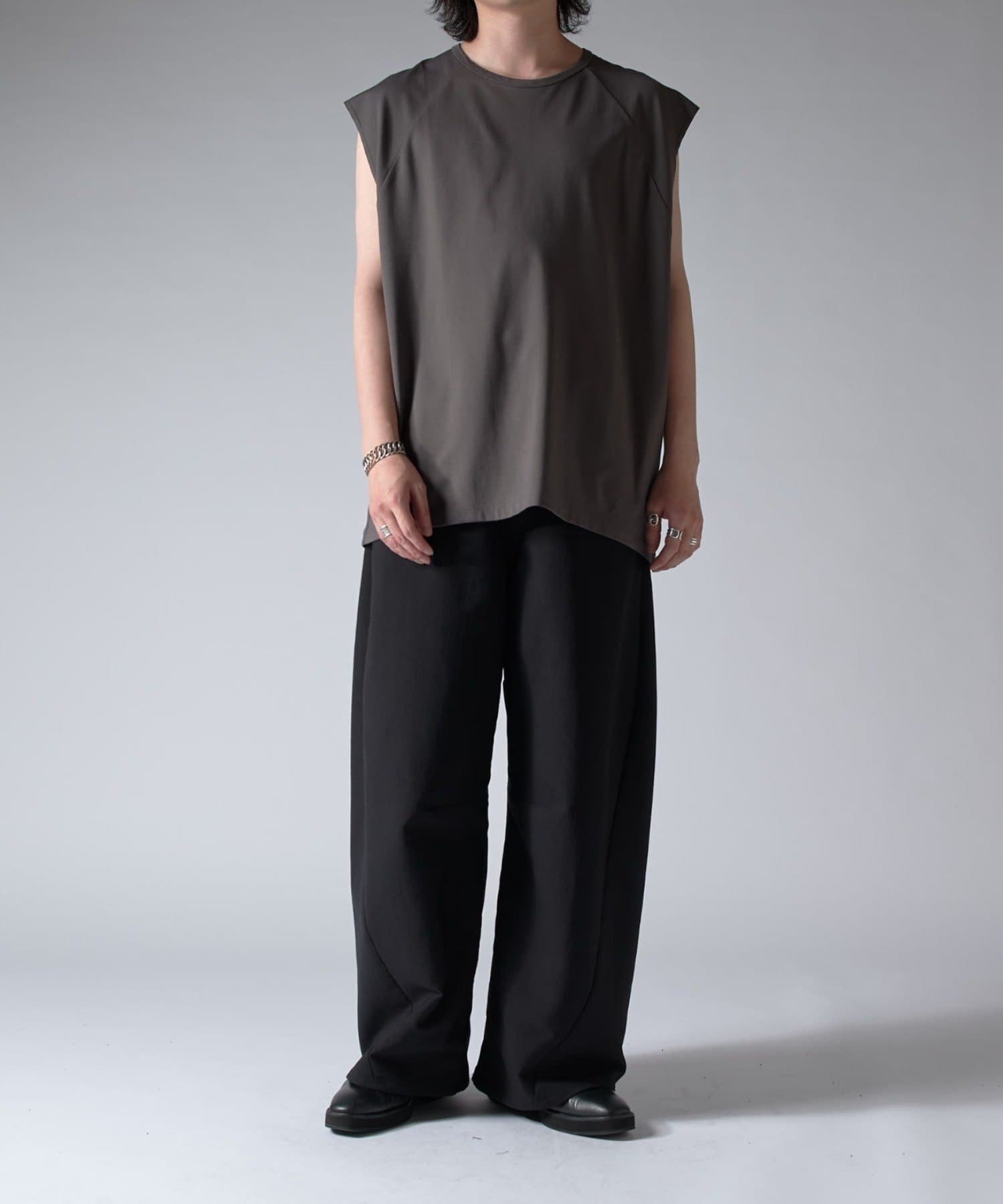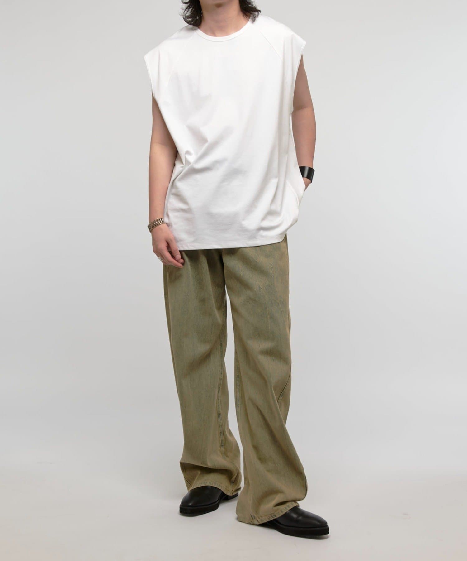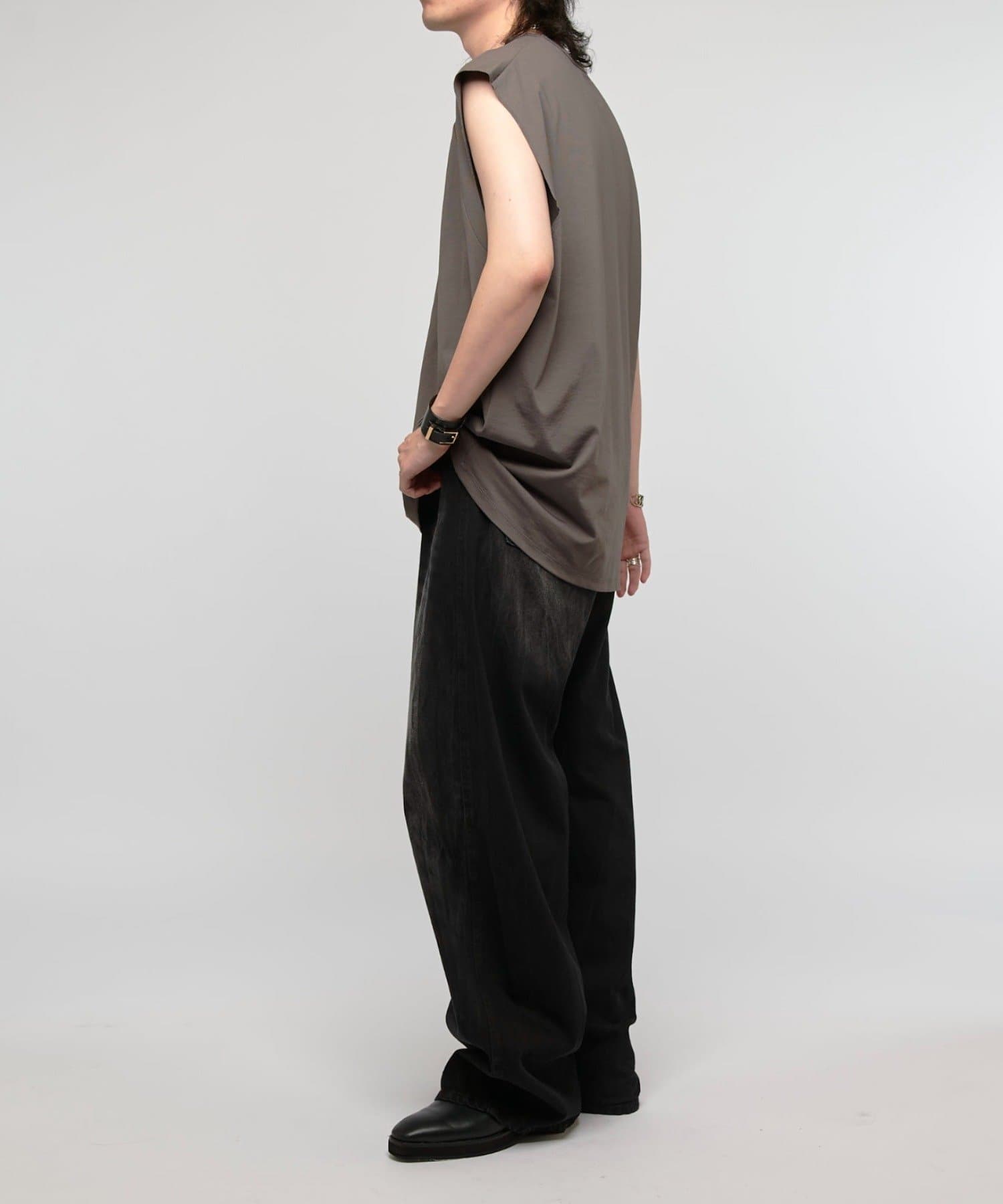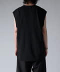 片線が落ちるドロップショルダー仕様で、袖を無くしたノースリーブ仕様のカットソー。