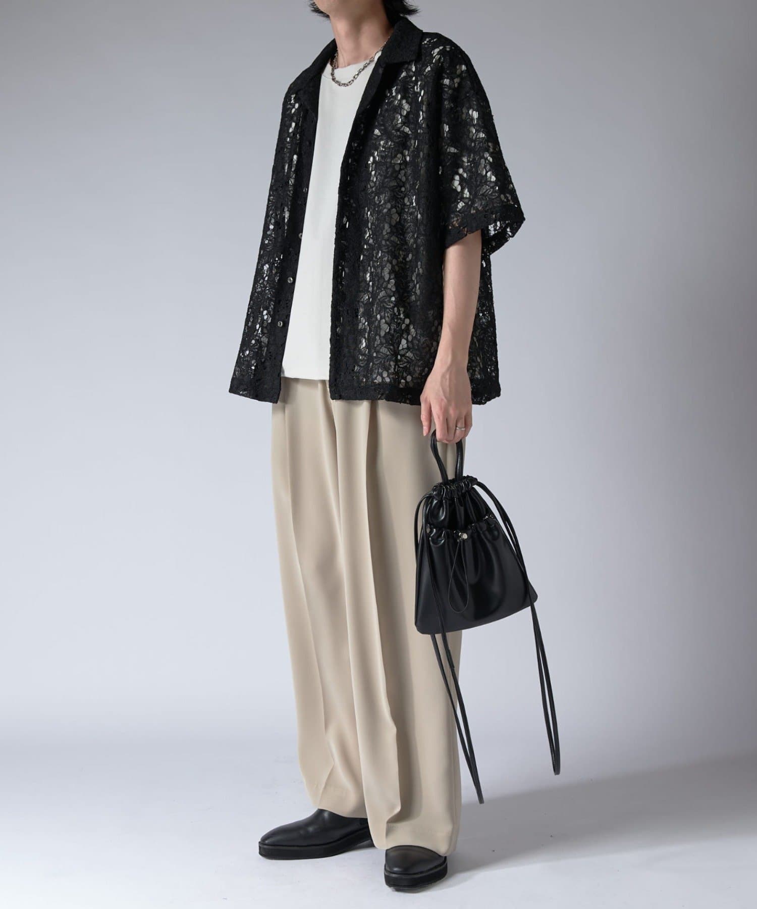 通気性の良いリーフ柄レースシャツなのでTシャツやノースリーブのカットソーの上にレイヤードで着て頂くのがオススメです。