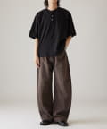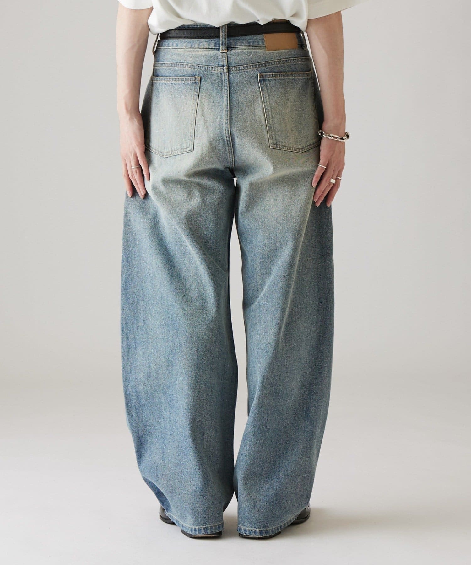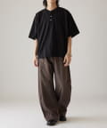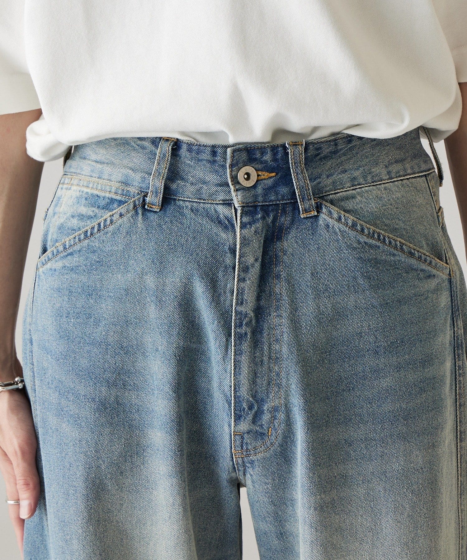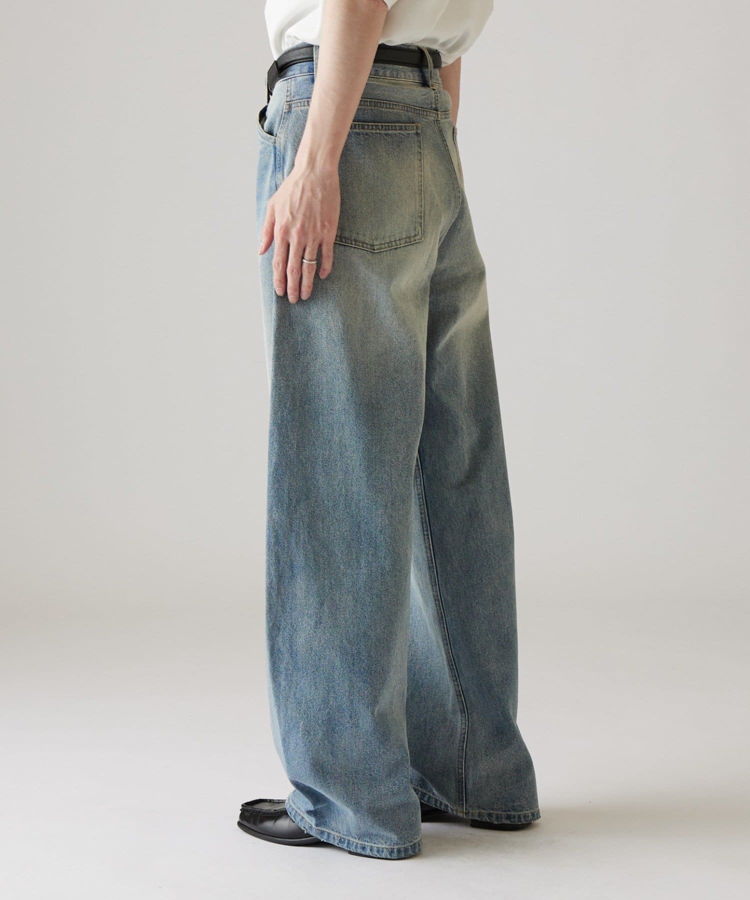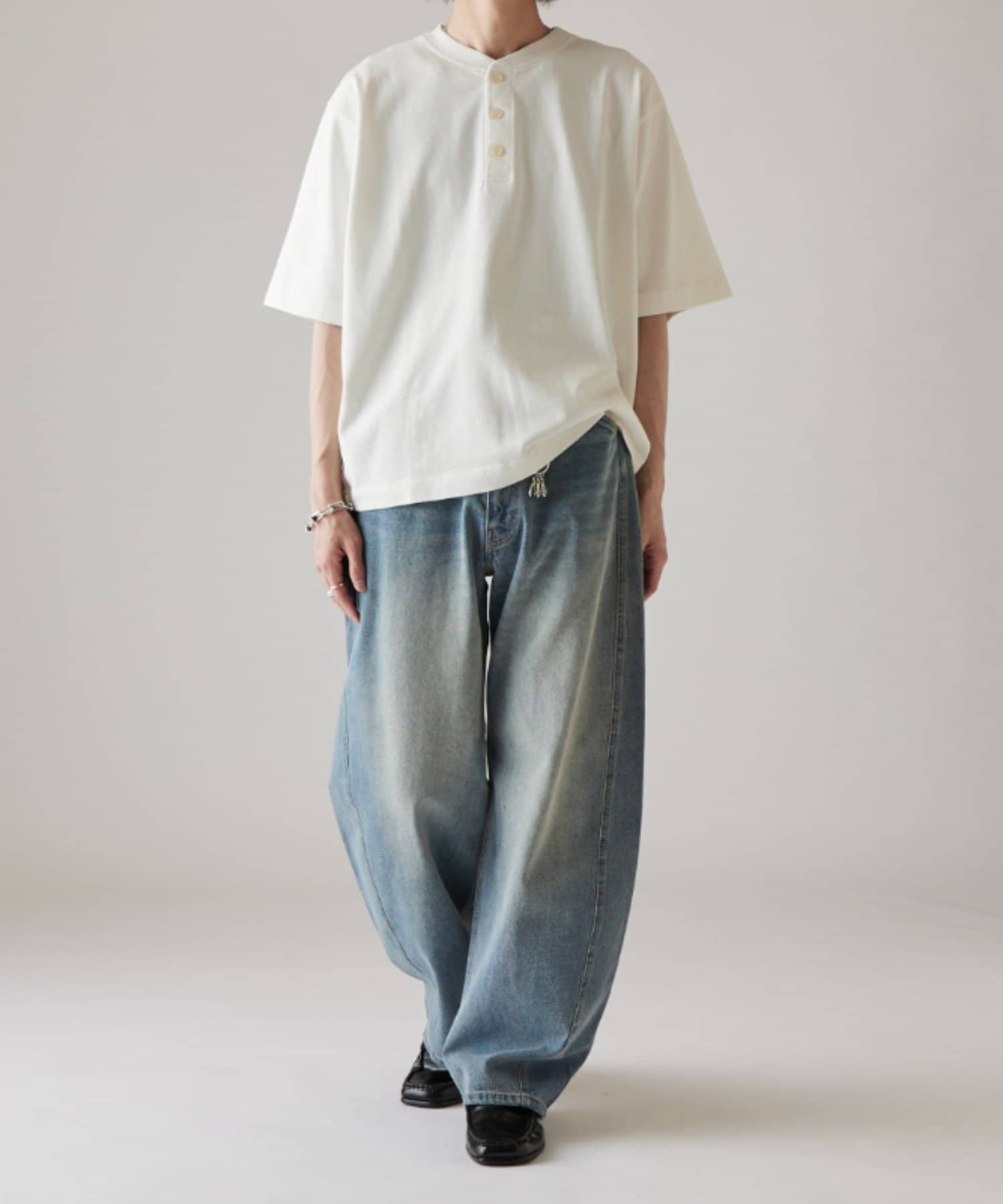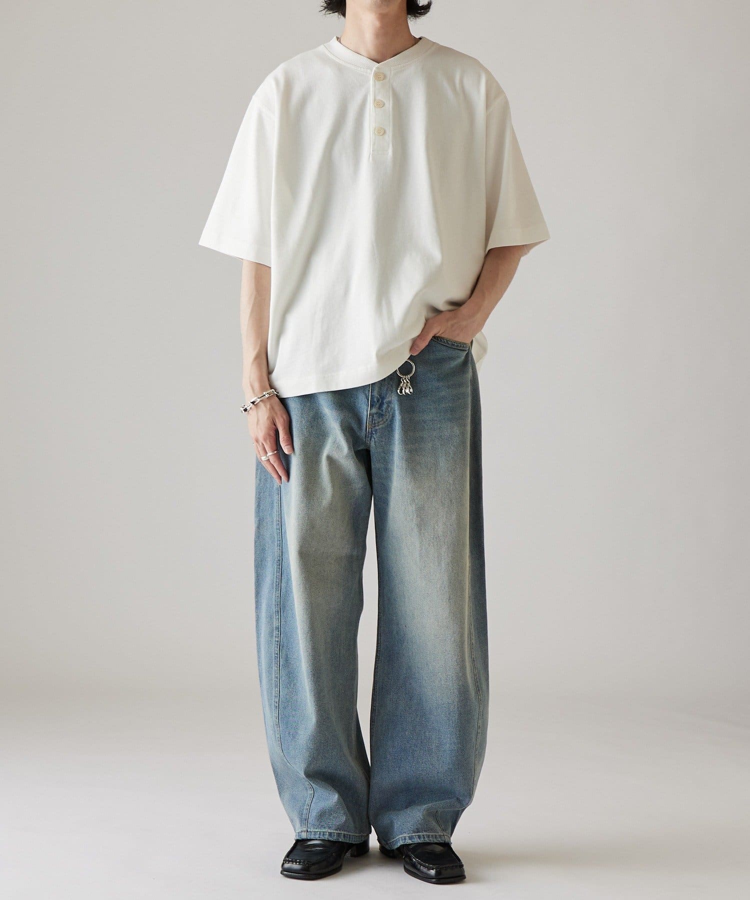カーブシルエットが特徴的なデニムパンツなので、ベーシックなTシャツや、シャツに組み合わせたキレイめカジュアルなスタイルがオススメです。