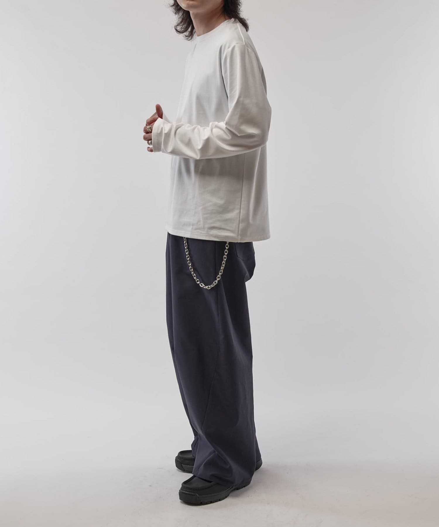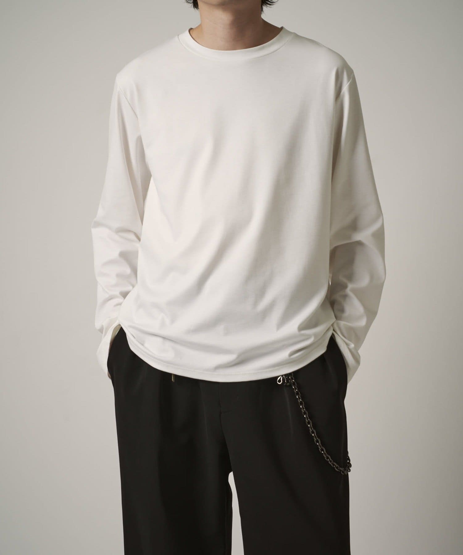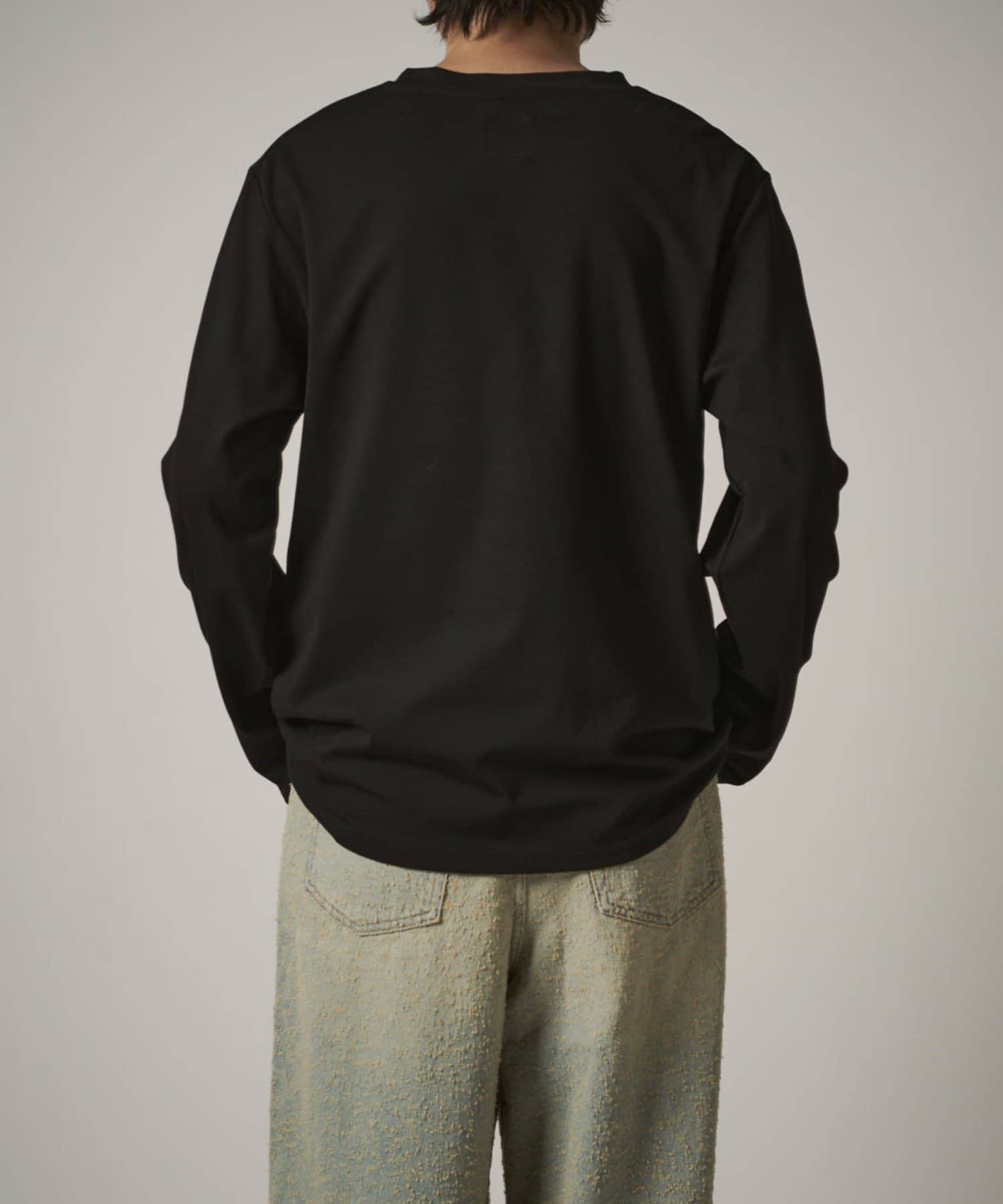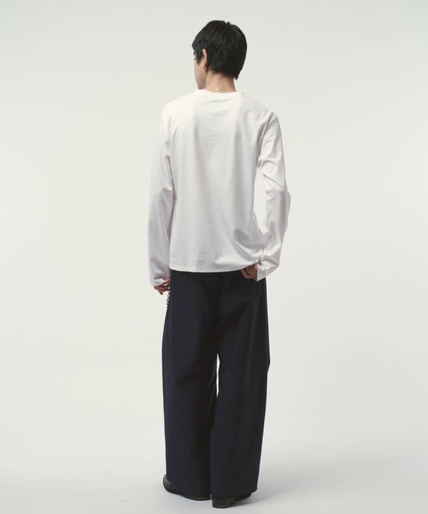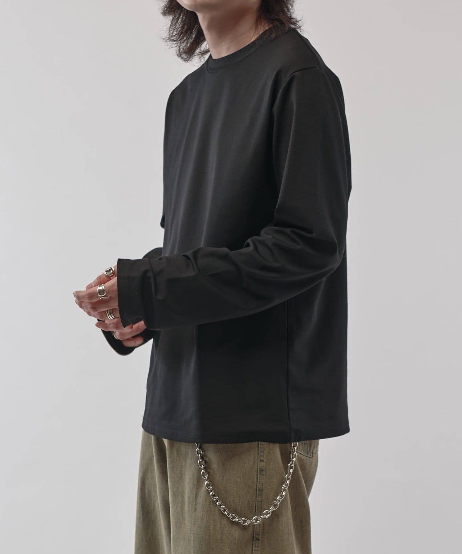 袖をやや長めに設定しており、無地Tでも一味違った見え方、シルエットを感じていただけます。