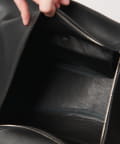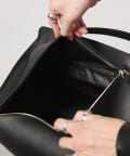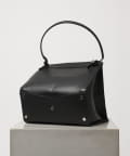 ボックス型のフォルムに対し、斜めに走るファスナーと、結ぶことで留めるハンドル構造が、他にない大胆なディテールとして印象を残します。Dカンに通したハンドルは、クッション性にもこだわり、機能と造形の美しさを両立。