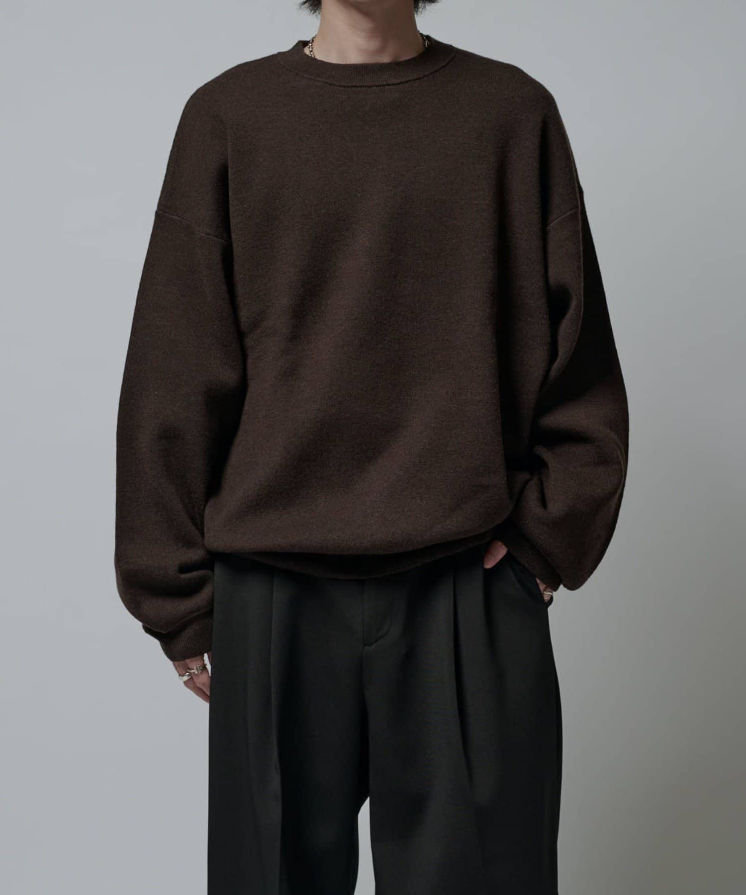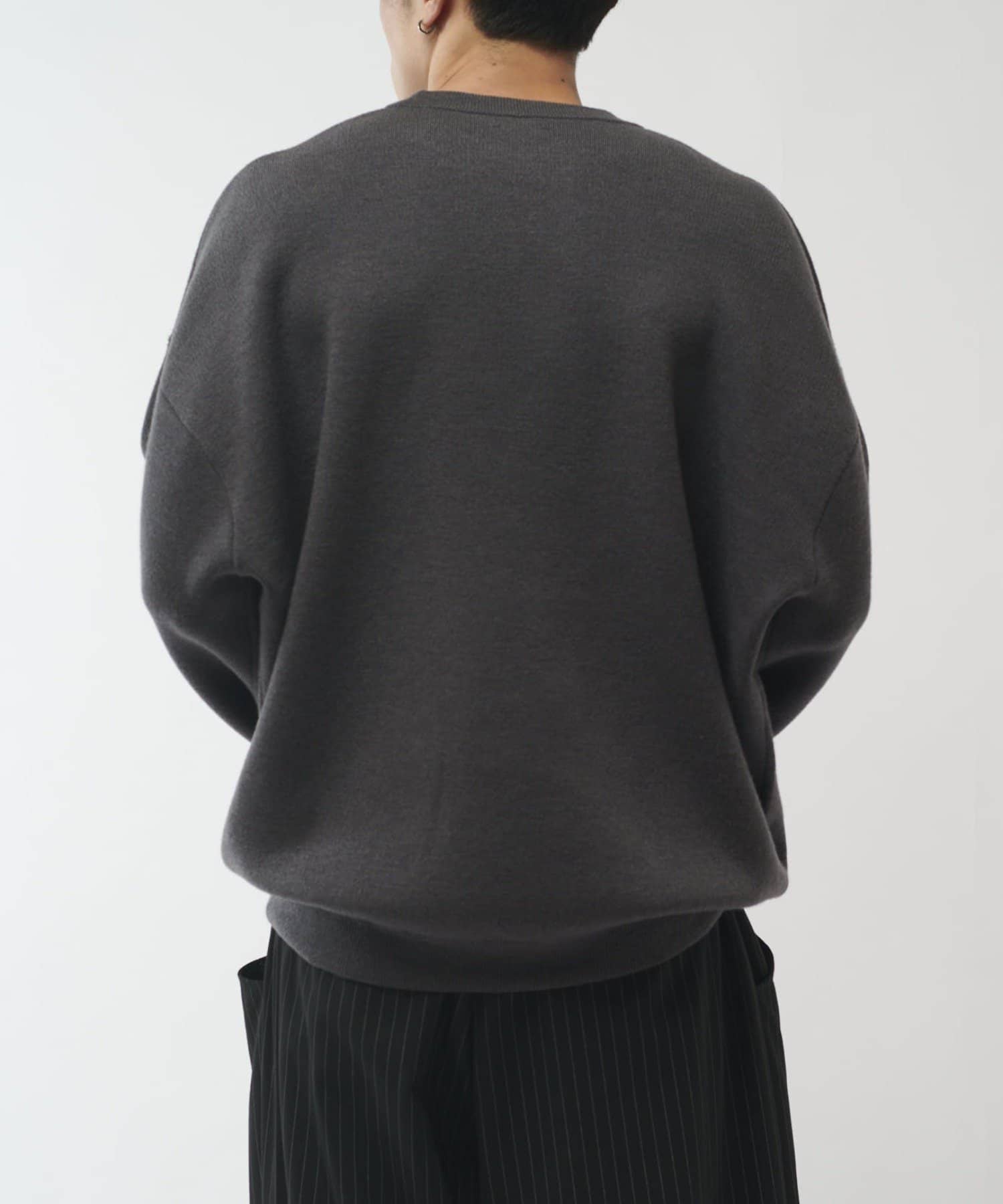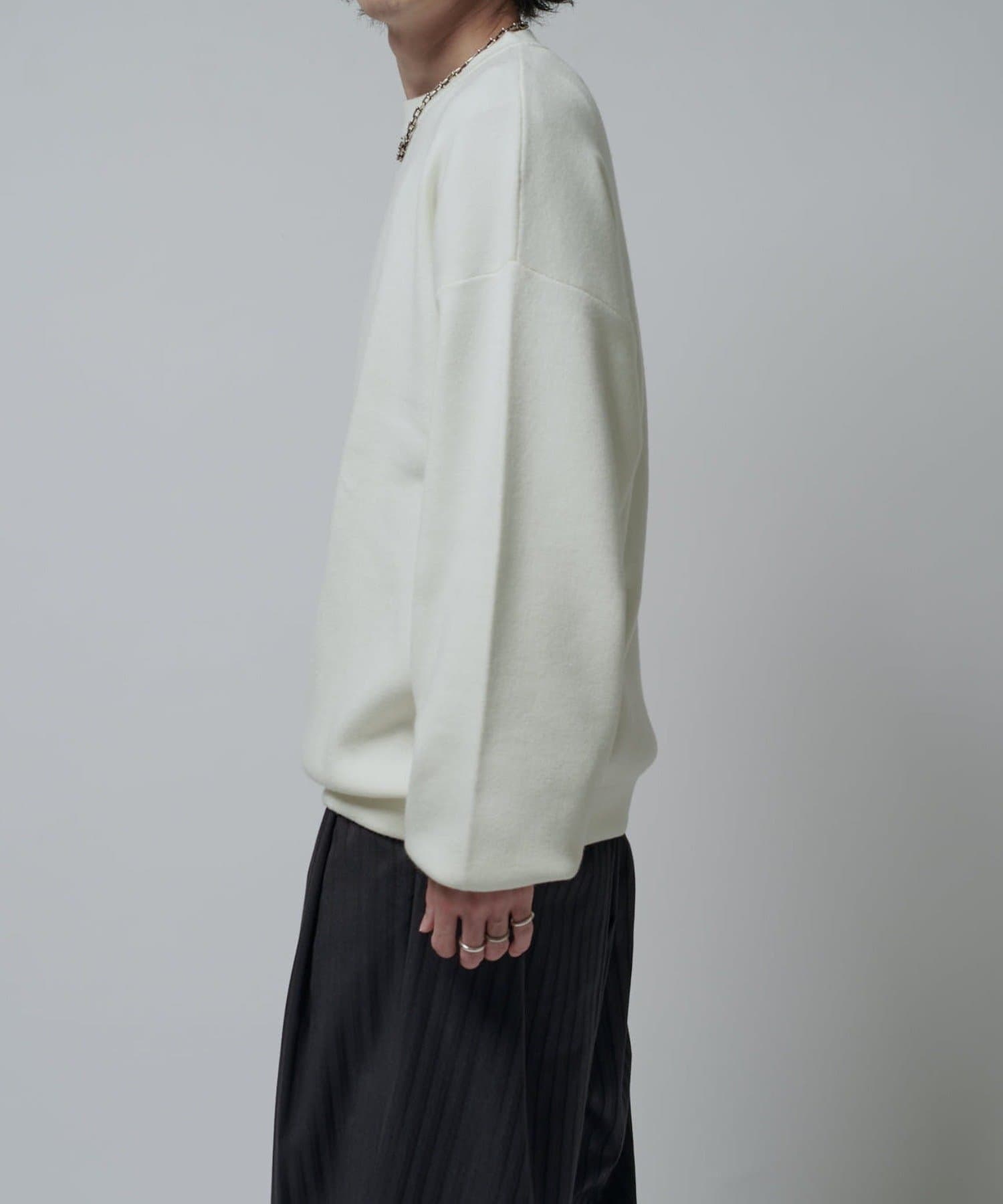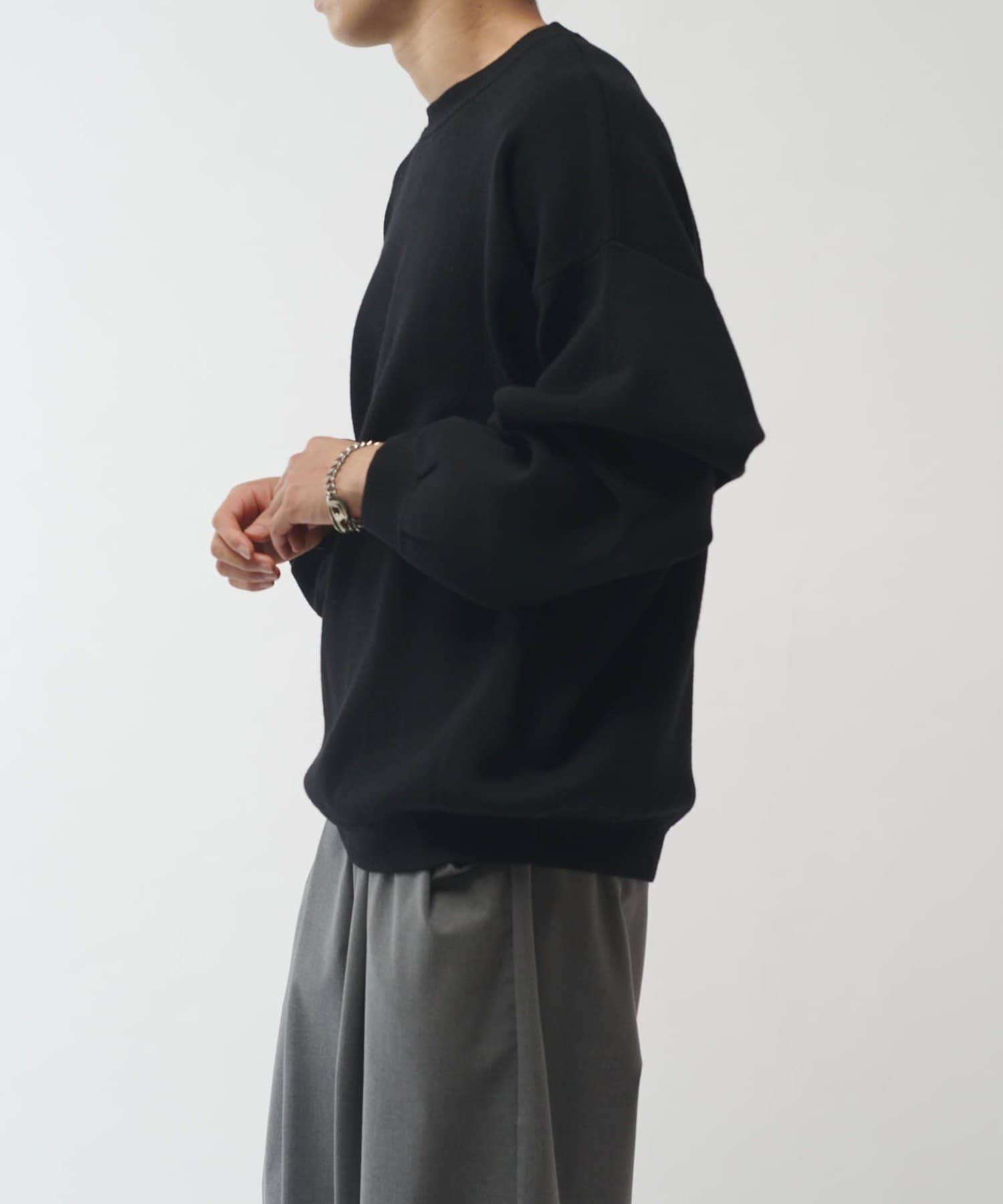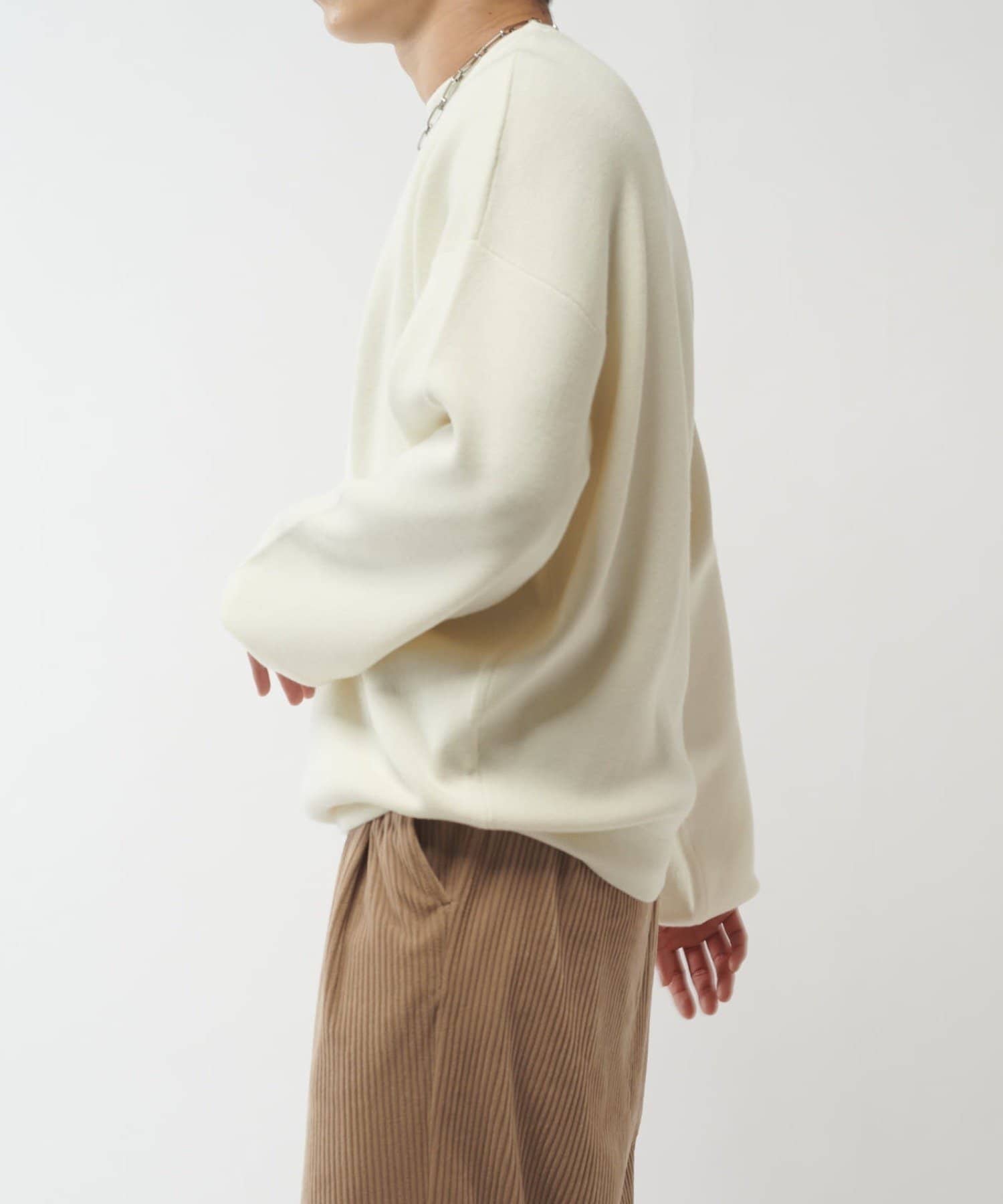 素材には、ポリエステル×ナイロン×アクリル×ウールの混紡素材を使用。もちっとした質感と、スウェットライクに着られる程よい肉感がポイント。クリーンで上品な見た目と、ウォッシャブルでイージーケアなのもポイント。