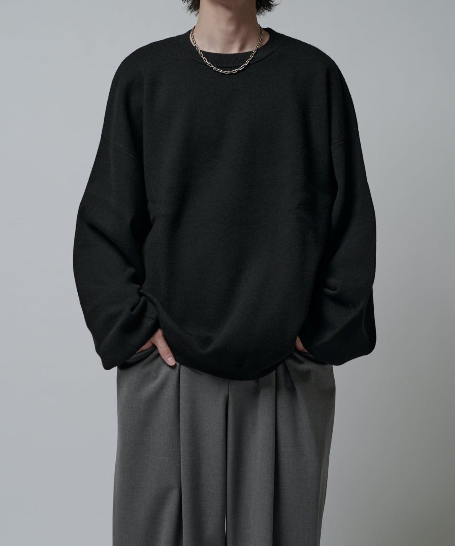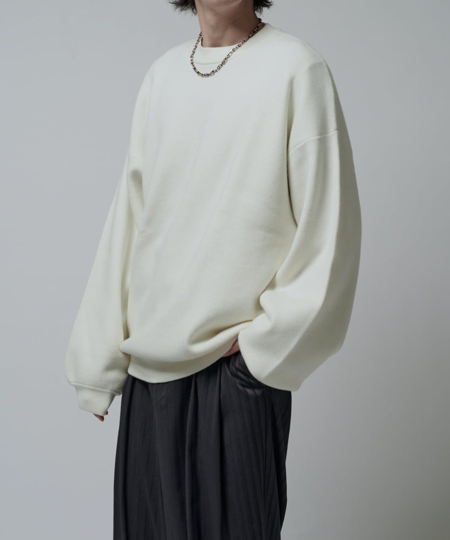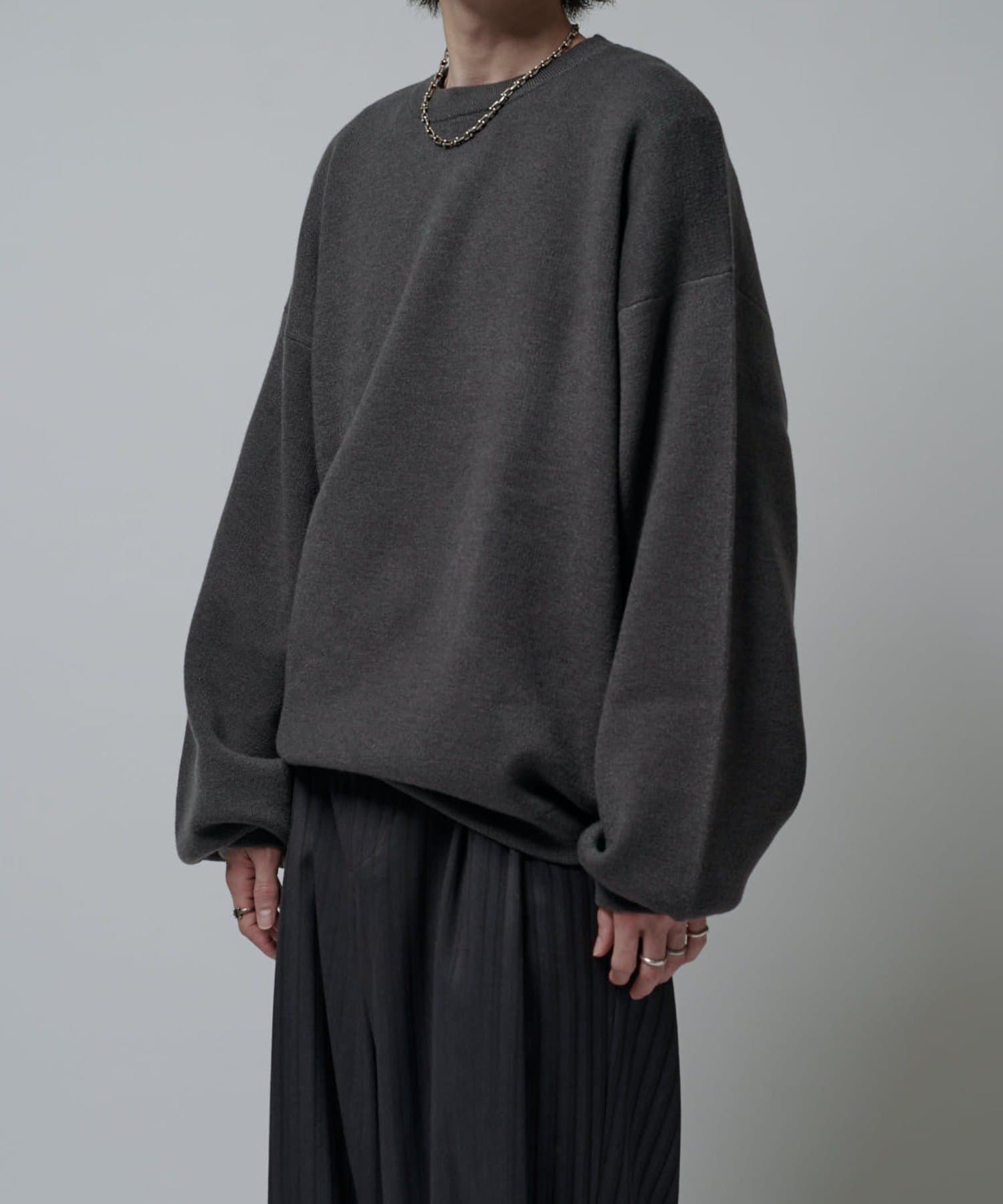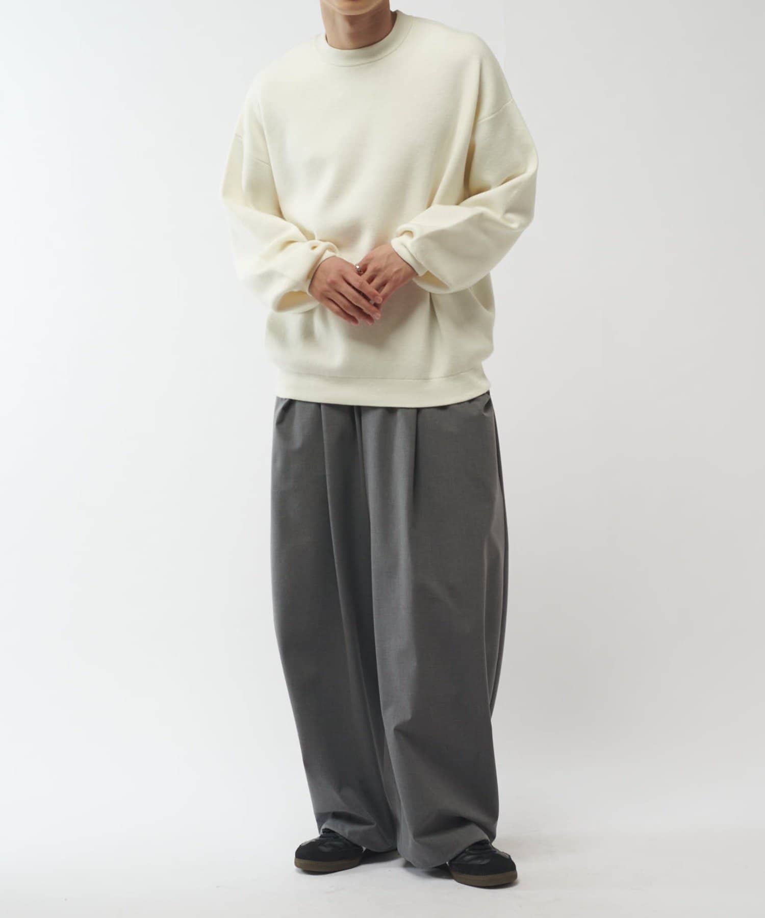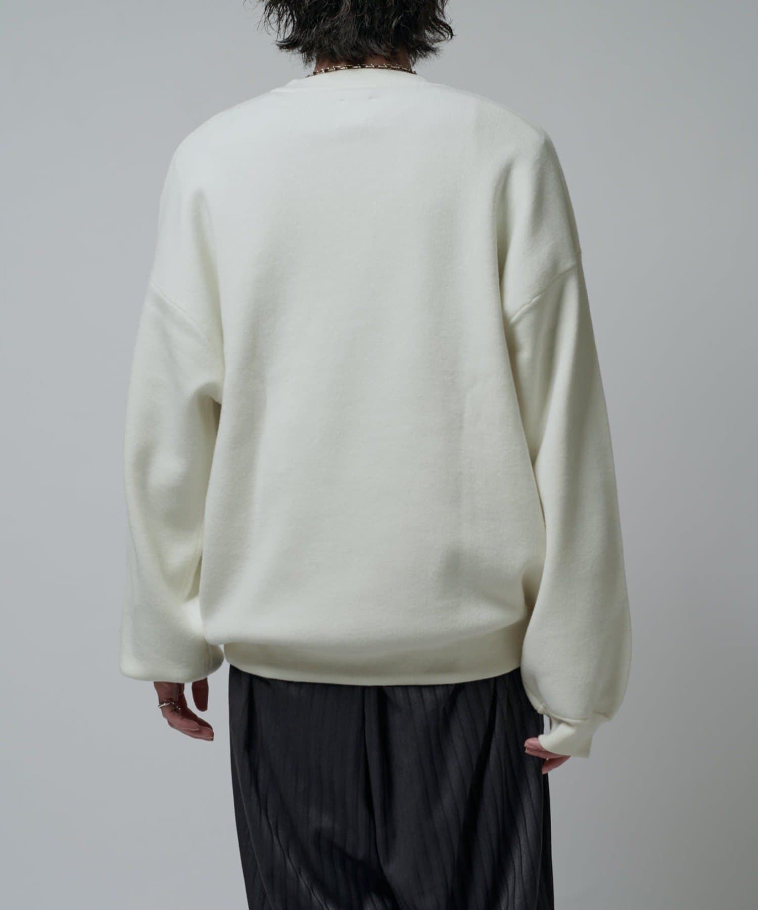 素材には、ポリエステル×ナイロン×アクリル×ウールの混紡素材を使用。もちっとした質感と、スウェットライクに着られる程よい肉感がポイント。クリーンで上品な見た目と、ウォッシャブルでイージーケアなのもポイント。