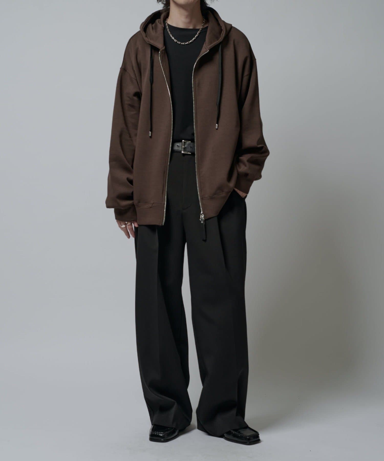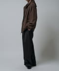 やや光沢感のあるきれいめな生地なので、ワイドスラックスに足元は革靴のスタイリングがおすすめです。