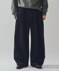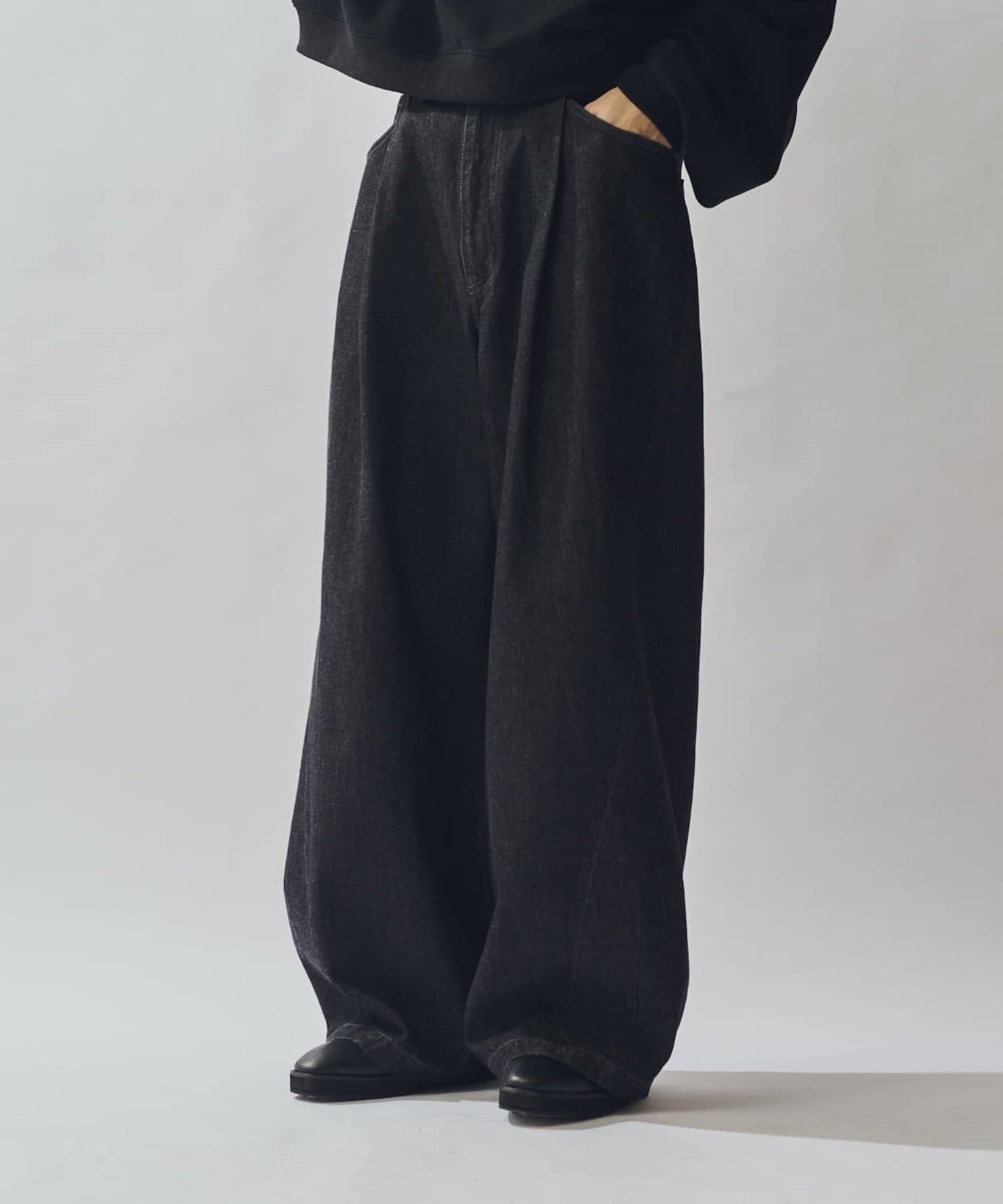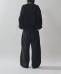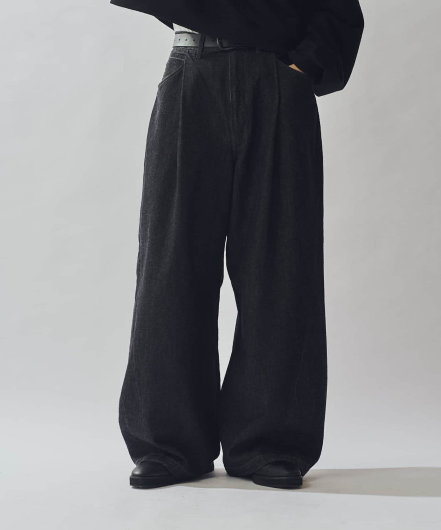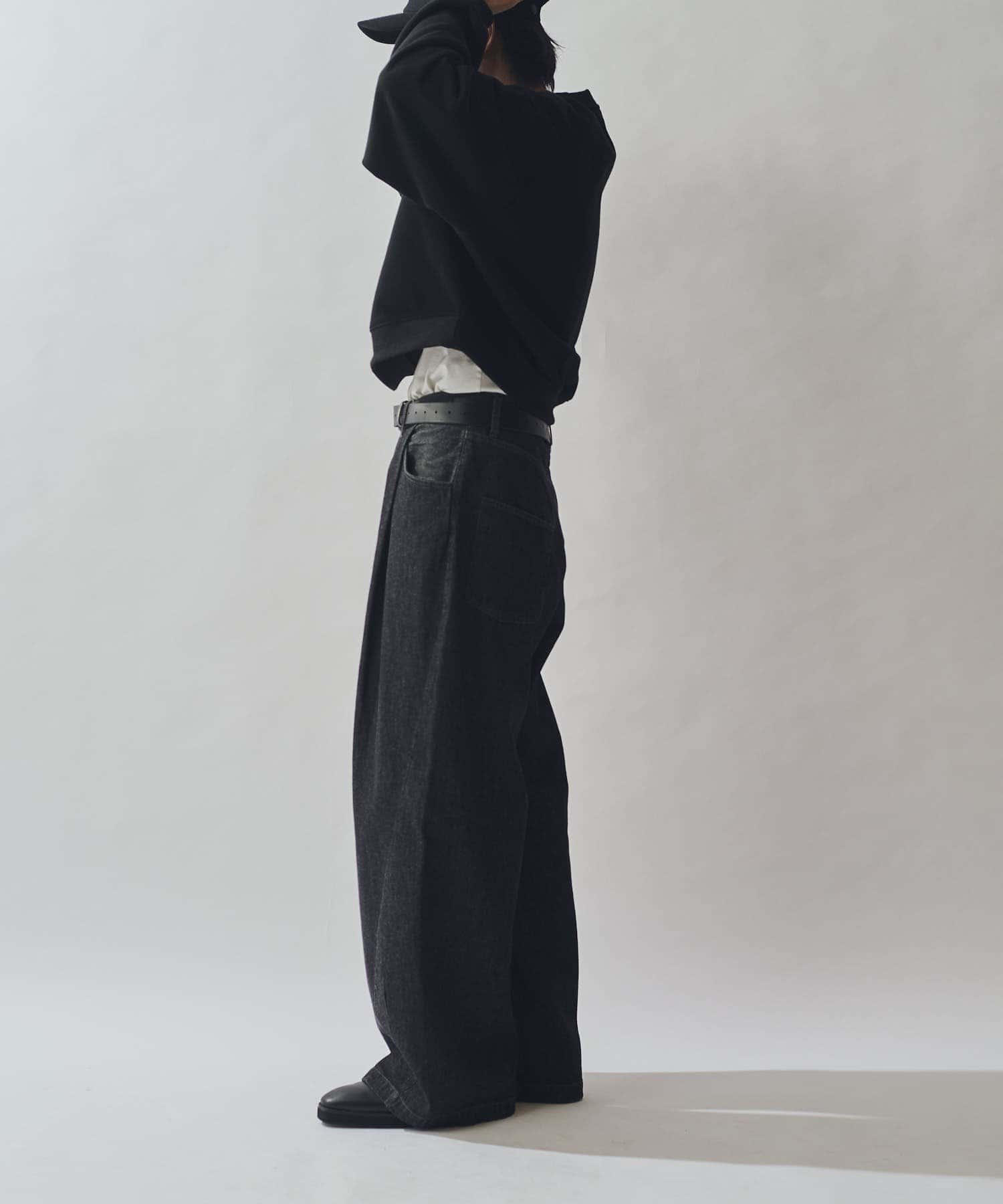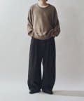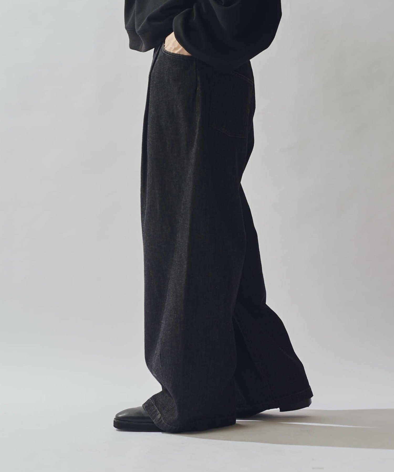 ウエストから、裾にかけてやや広がるバギーシルエット。着用した際に立体感が出るようにフロントには深めのタックをとり、サイドシームがフロントに流れるように工夫。