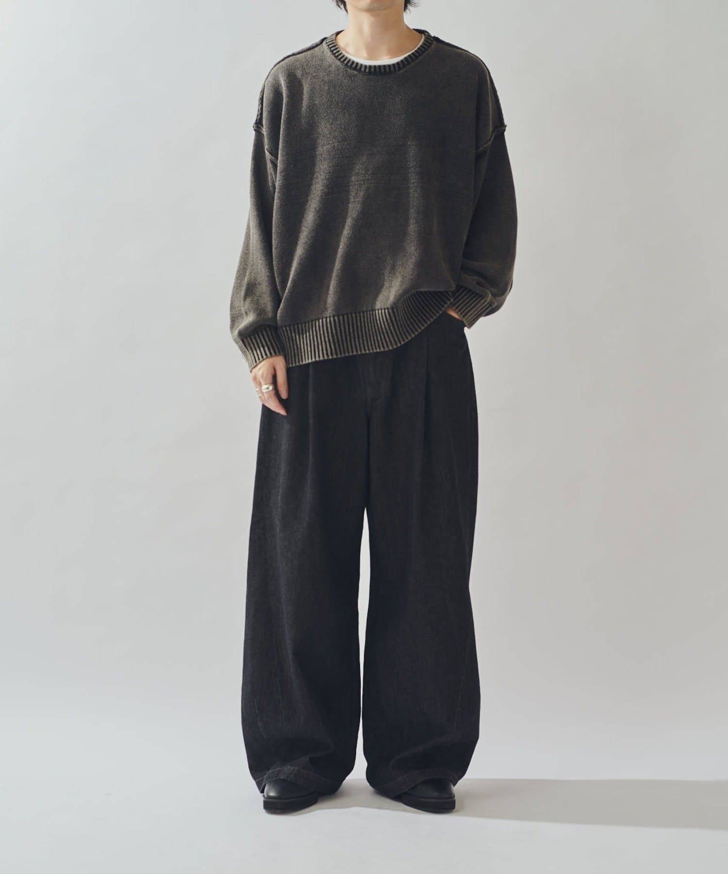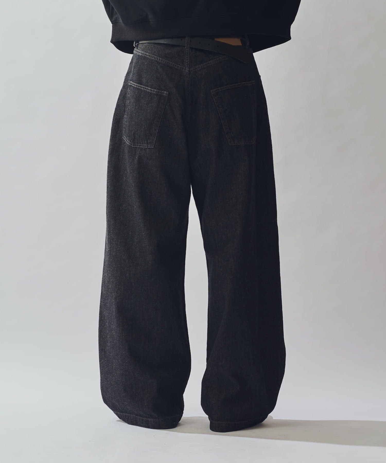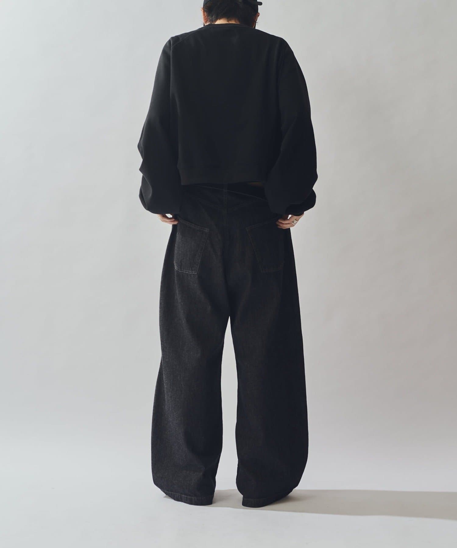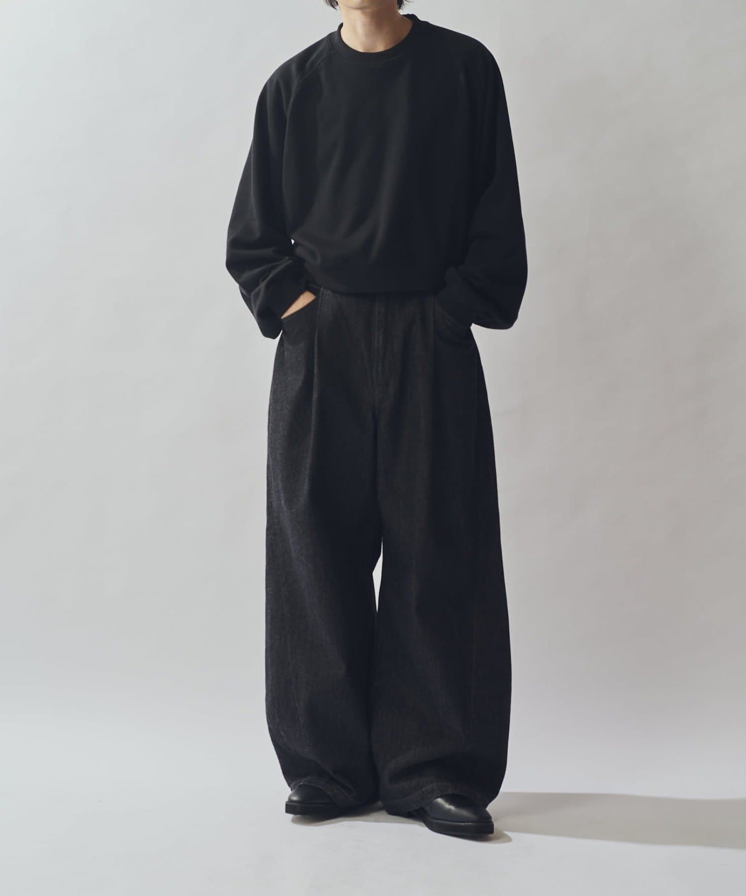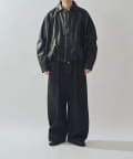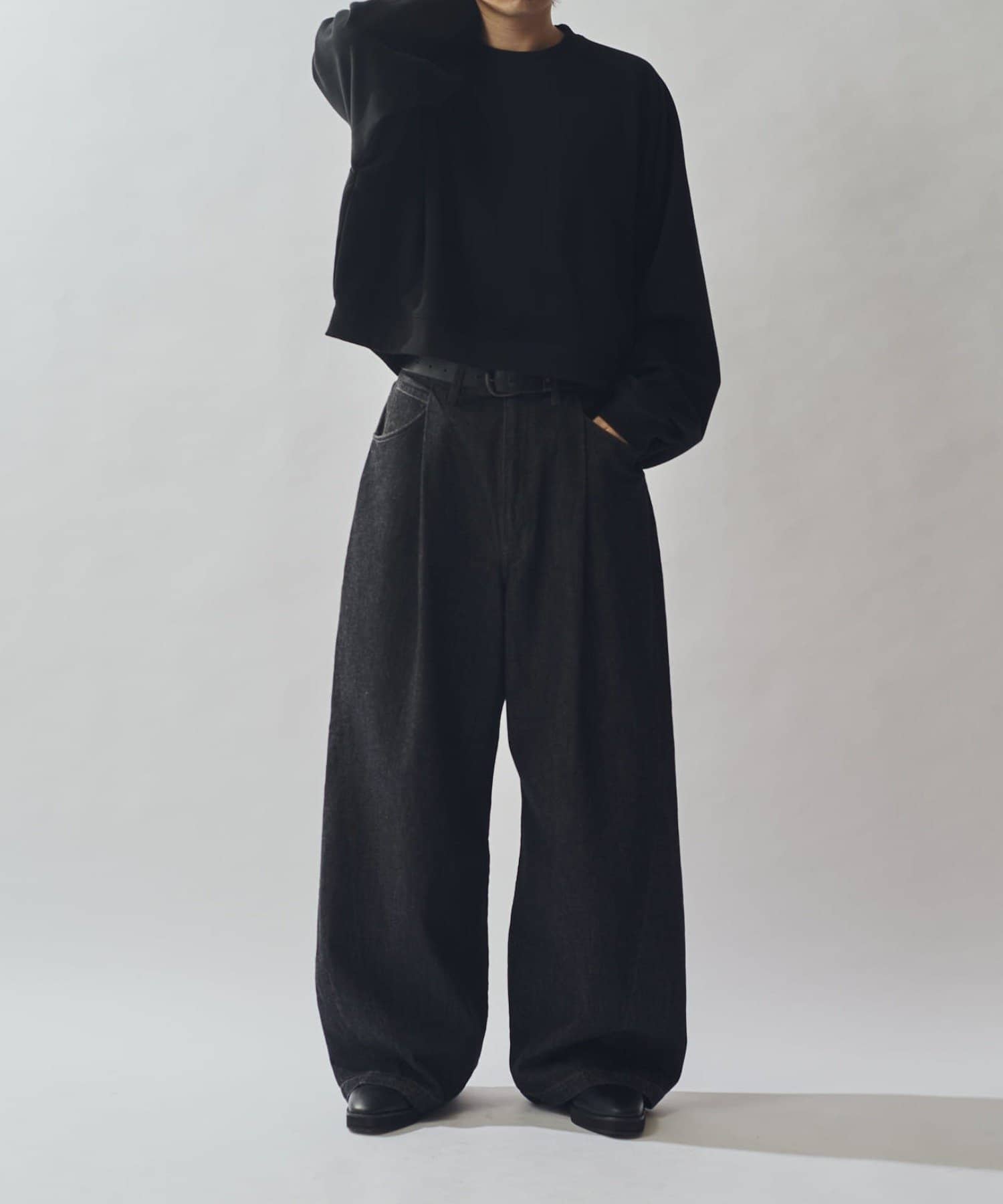 ウエストから、裾にかけてやや広がるバギーシルエット。着用した際に立体感が出るようにフロントには深めのタックをとり、サイドシームがフロントに流れるように工夫。