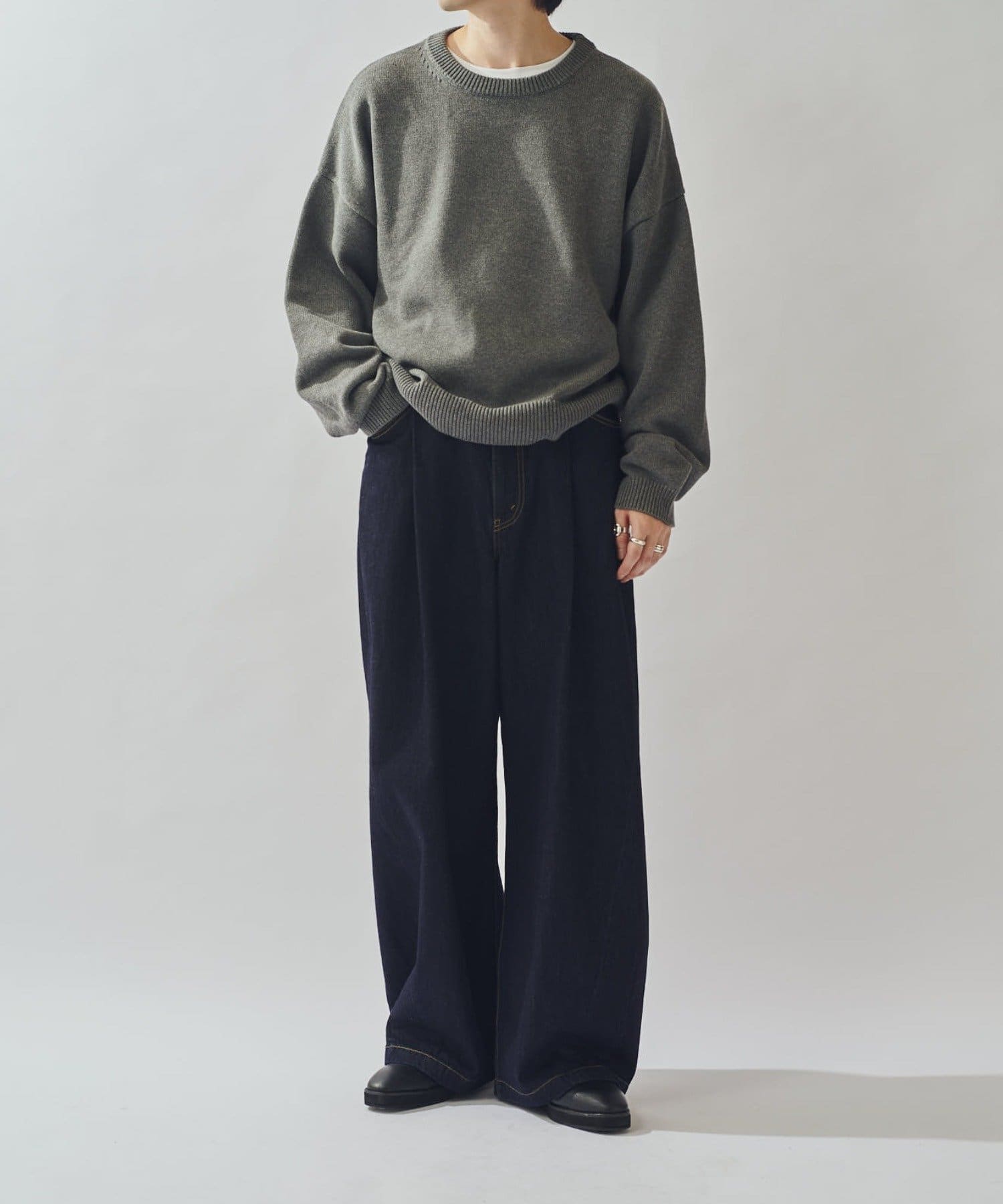 バギーシルエットのジーンズなので、コンパクトなニットプルオーバーや、ZIPブルゾンと組み合わせたキレイめカジュアルなスタイルがオススメ。