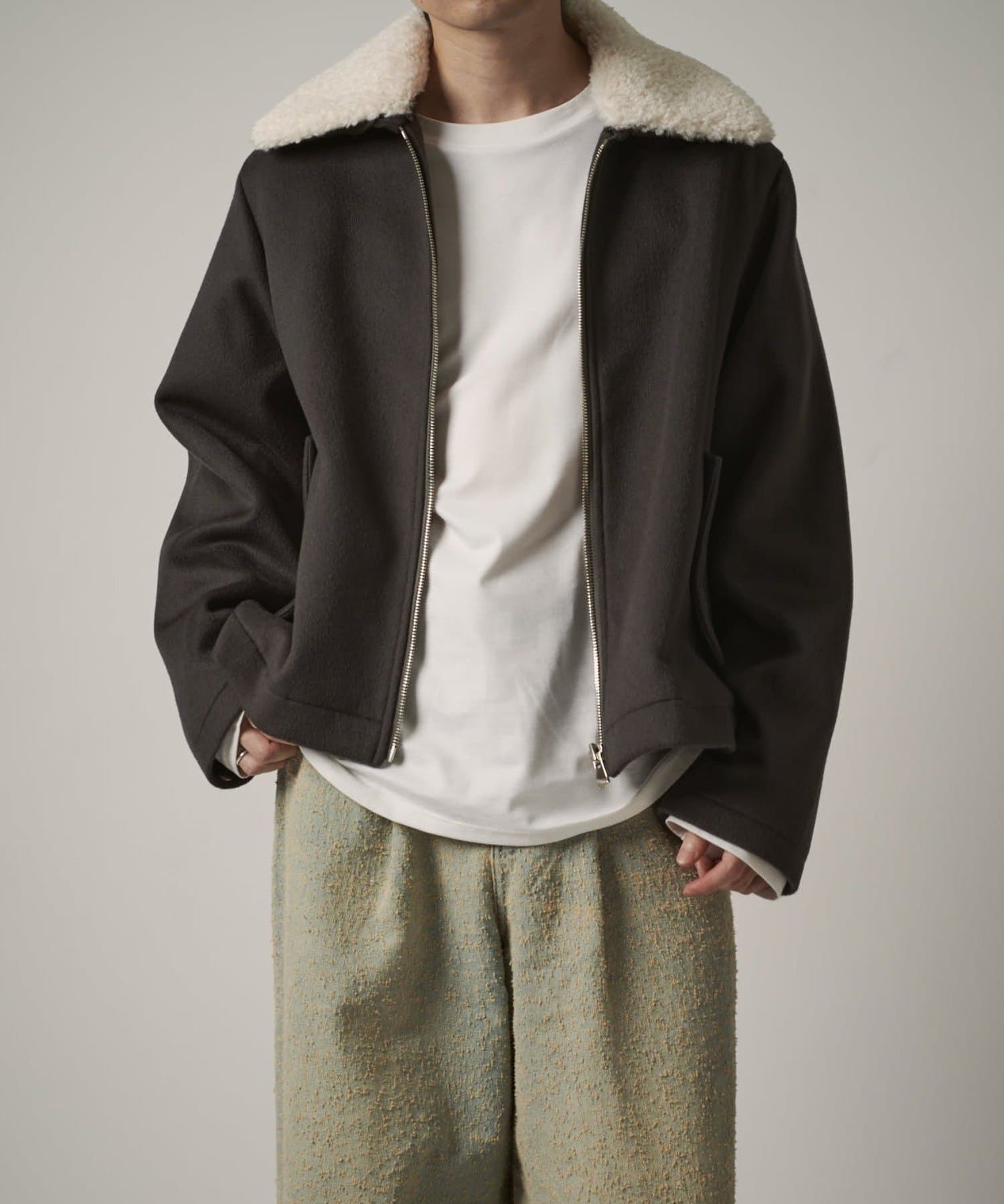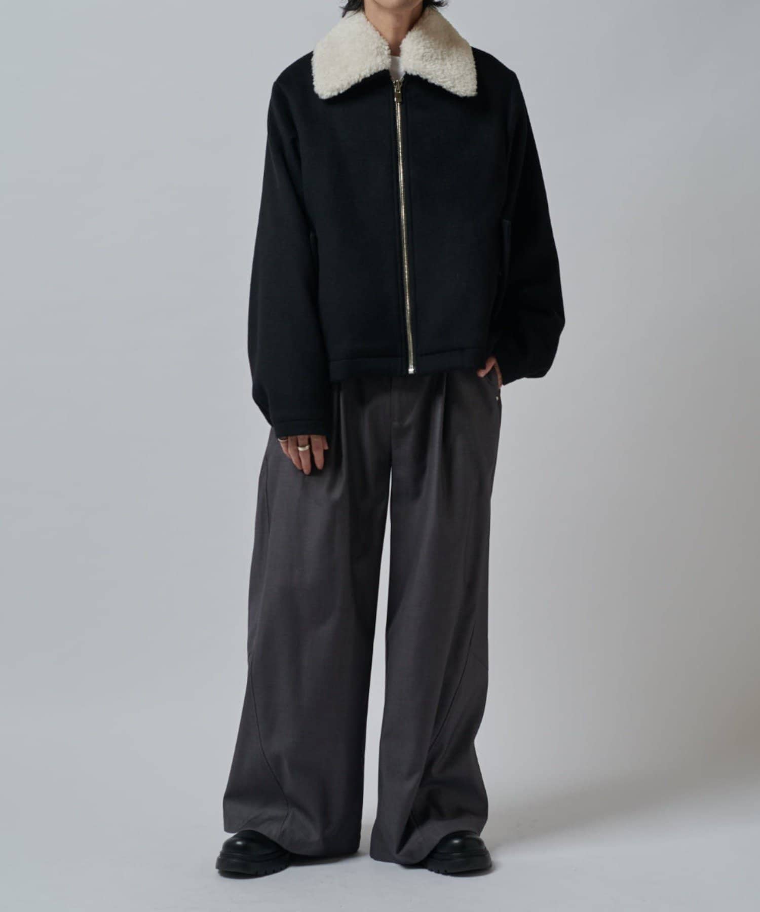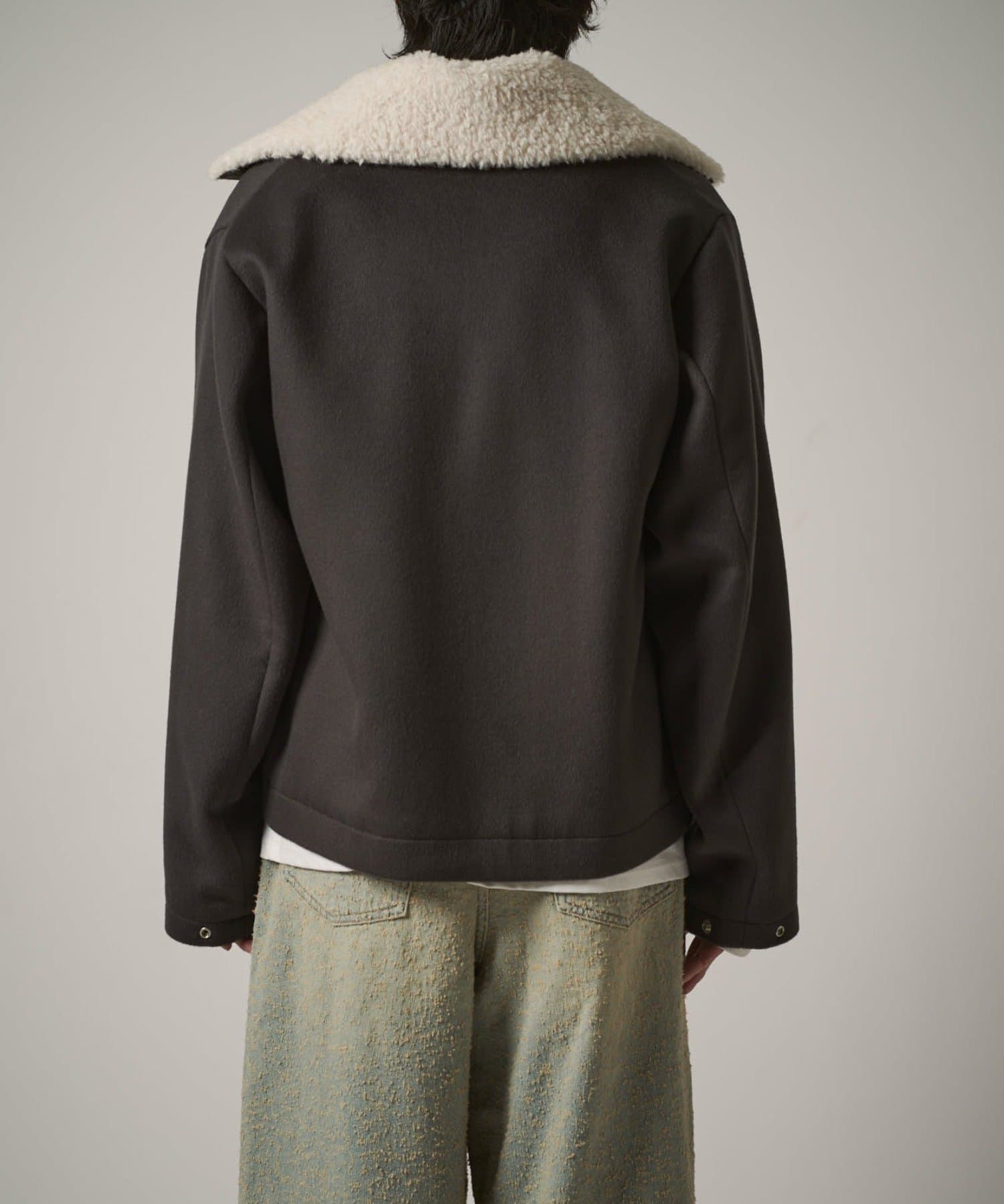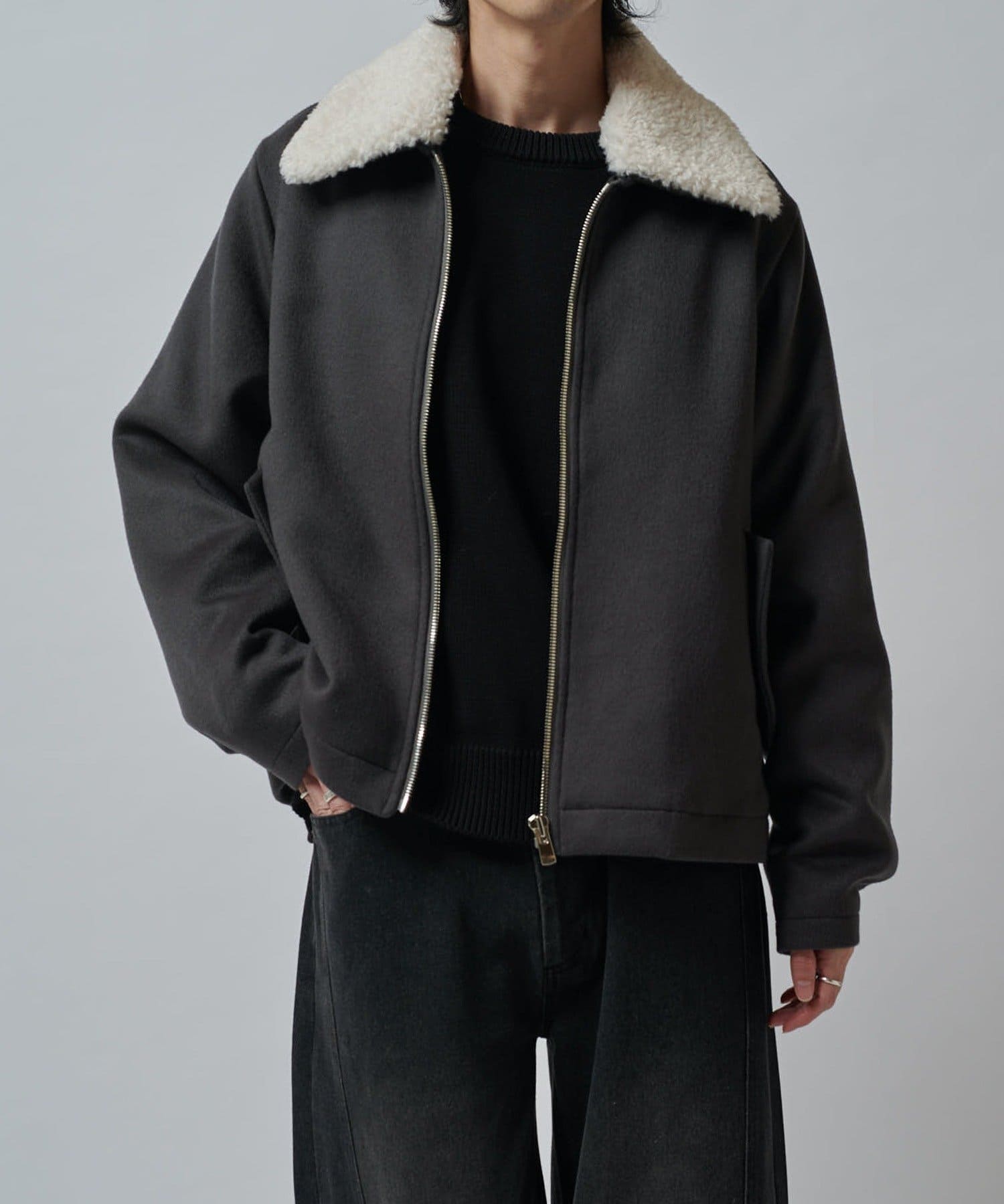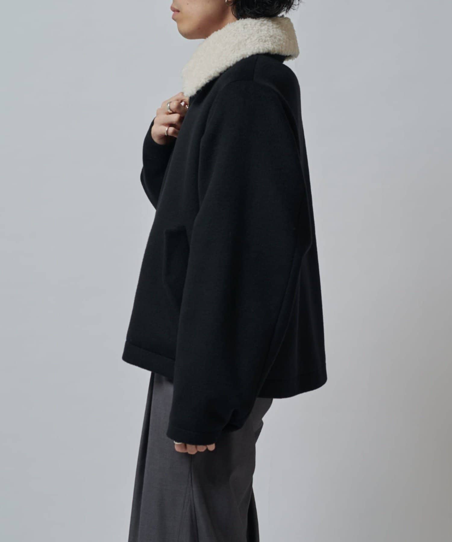 襟のボアが特徴的なブルゾン。