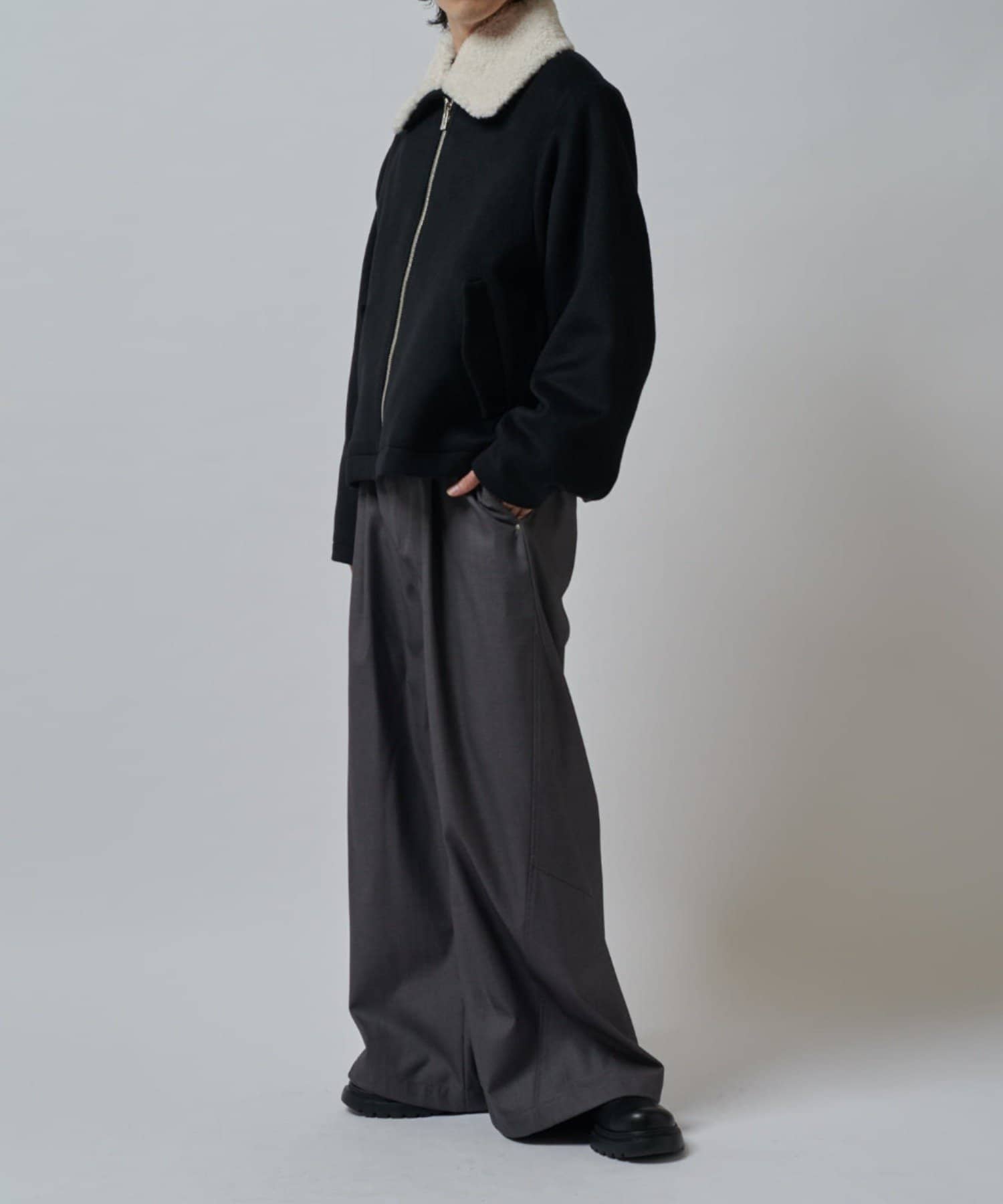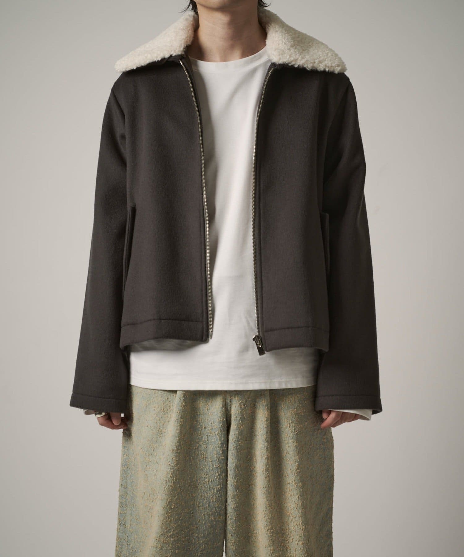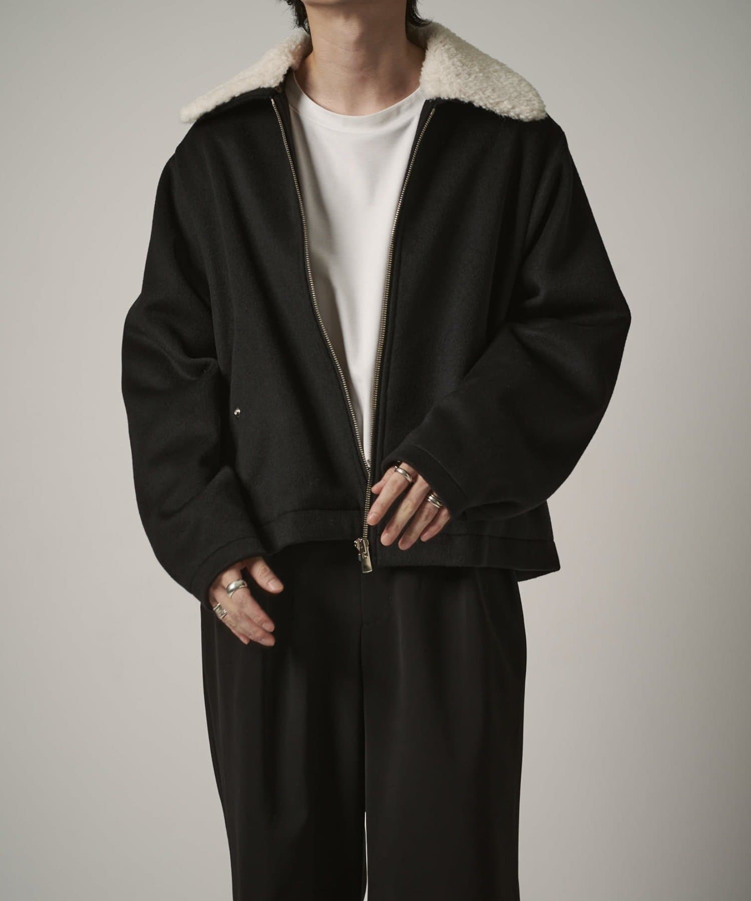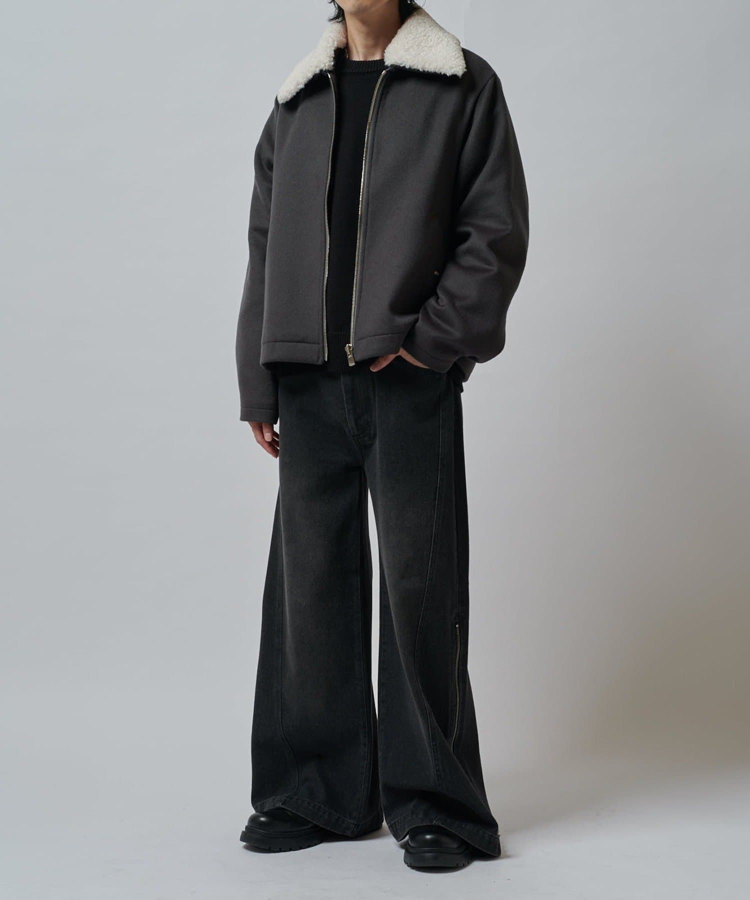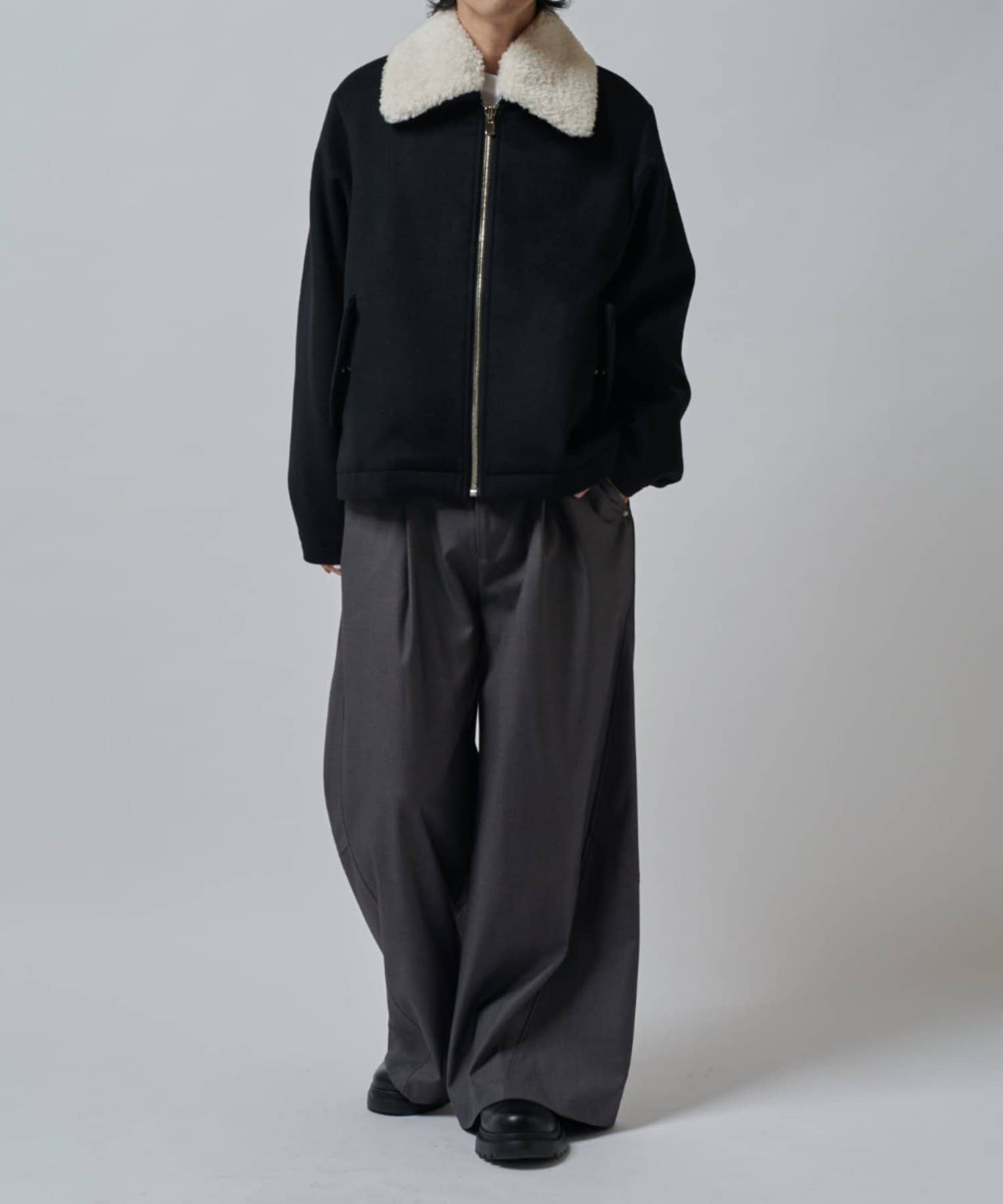襟のボアが特徴的なブルゾン。