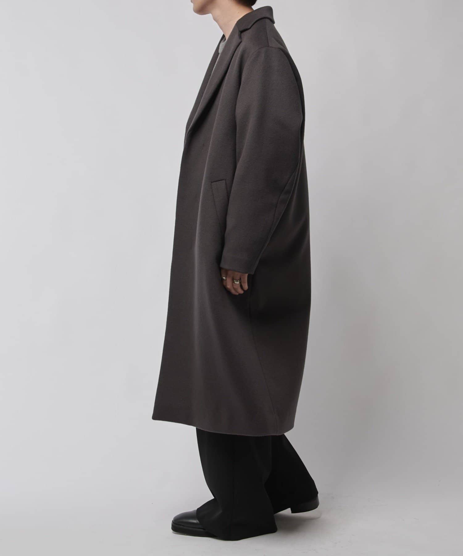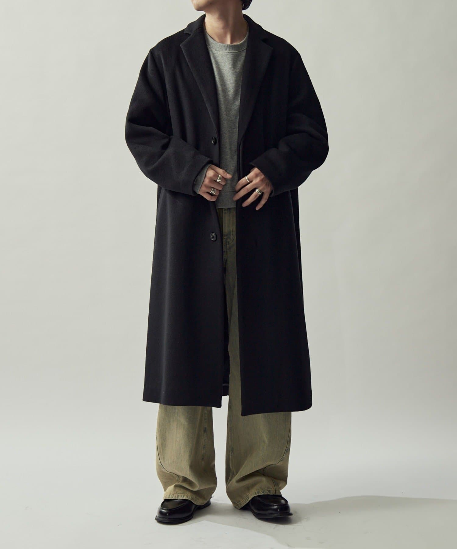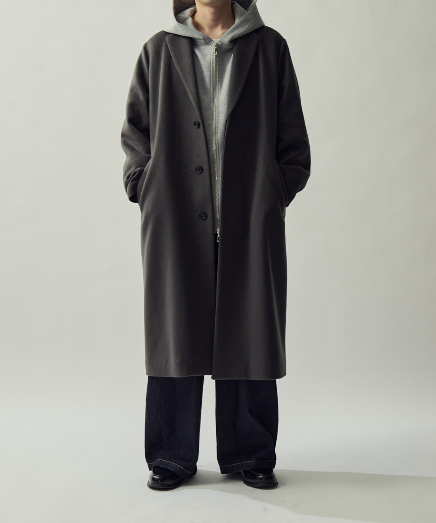 シルエットに特徴があるロングコートなのでデザインはシンプルに。カジュアルからきれいめまで幅広く合わせられる万能なコートです。