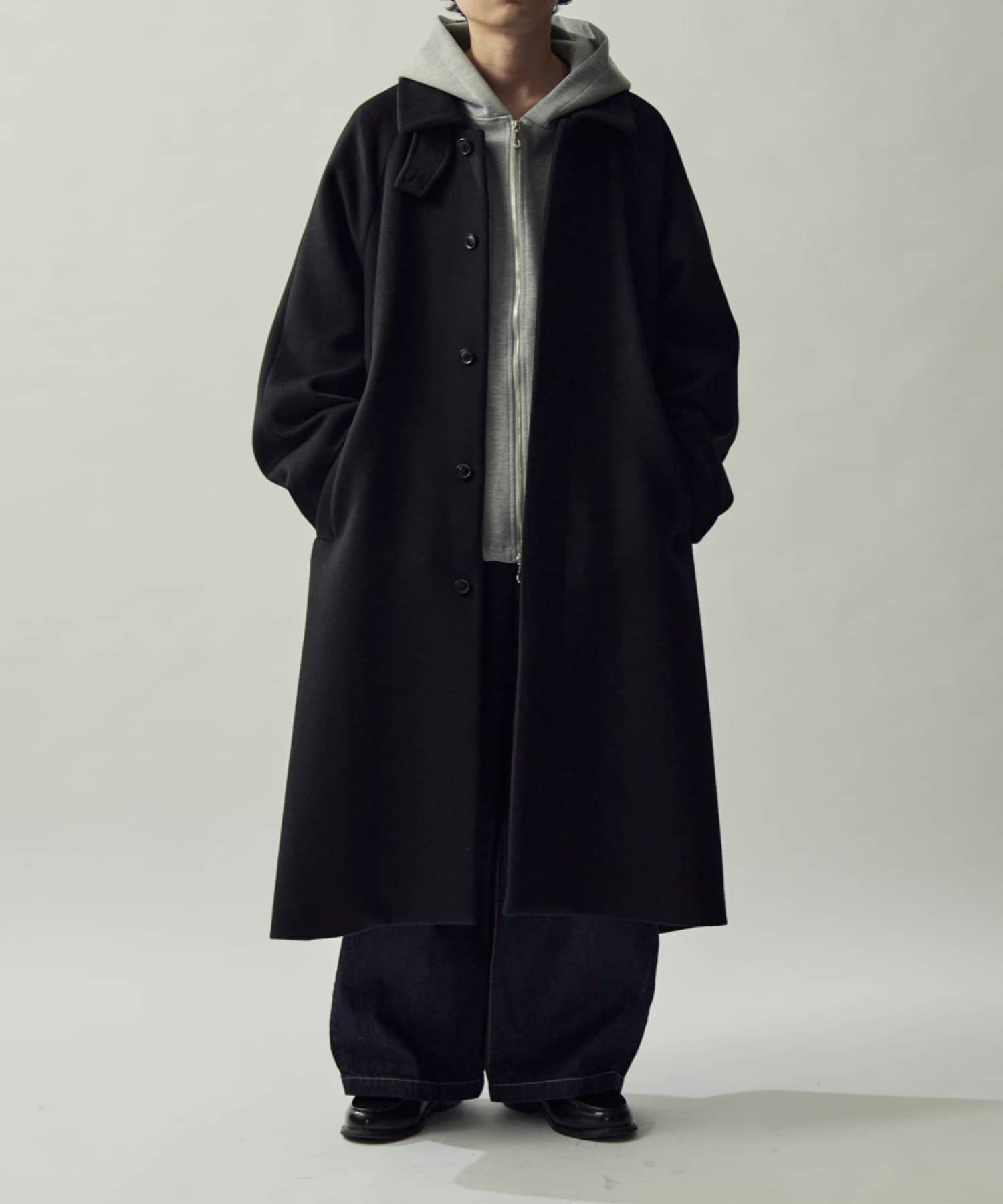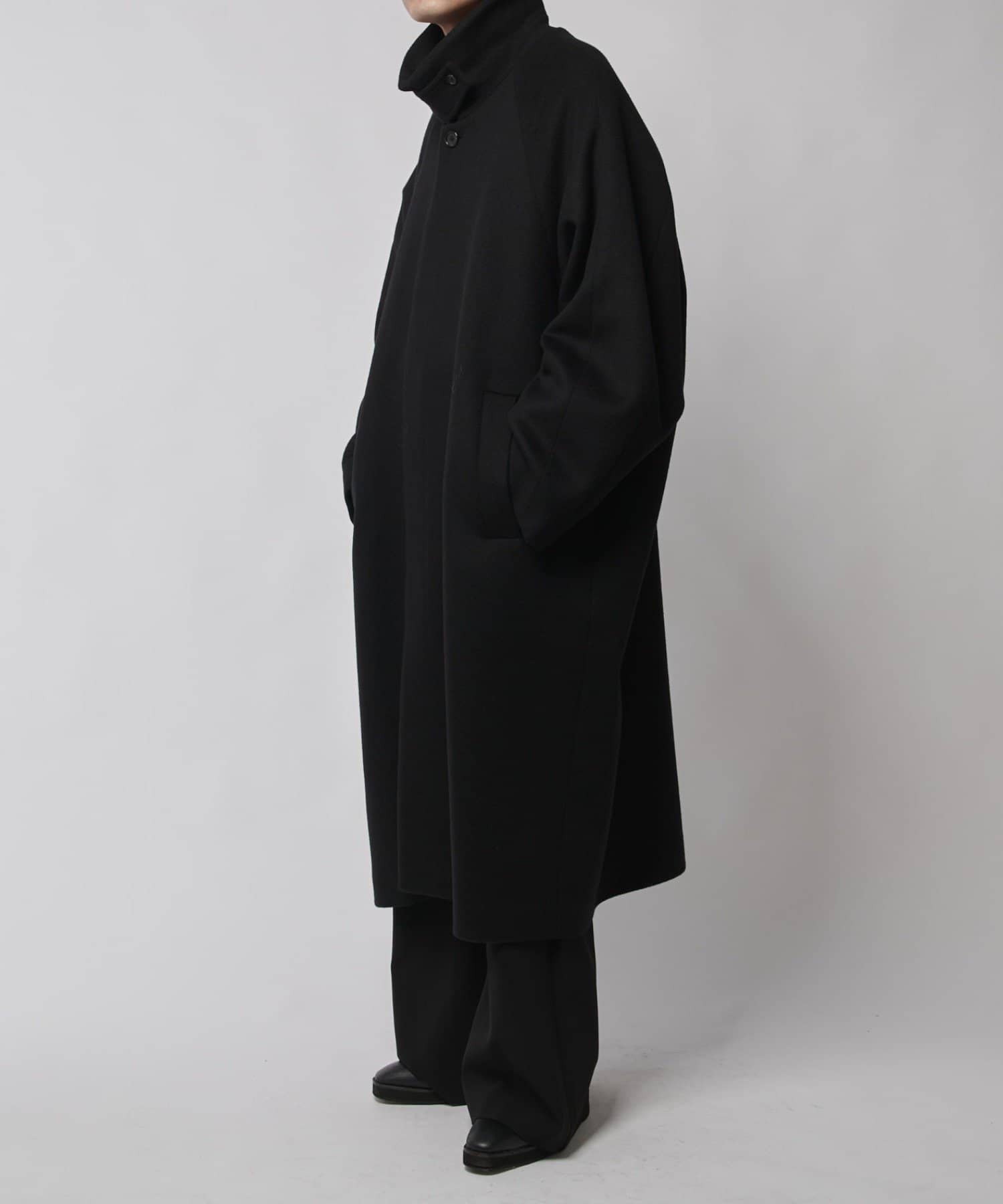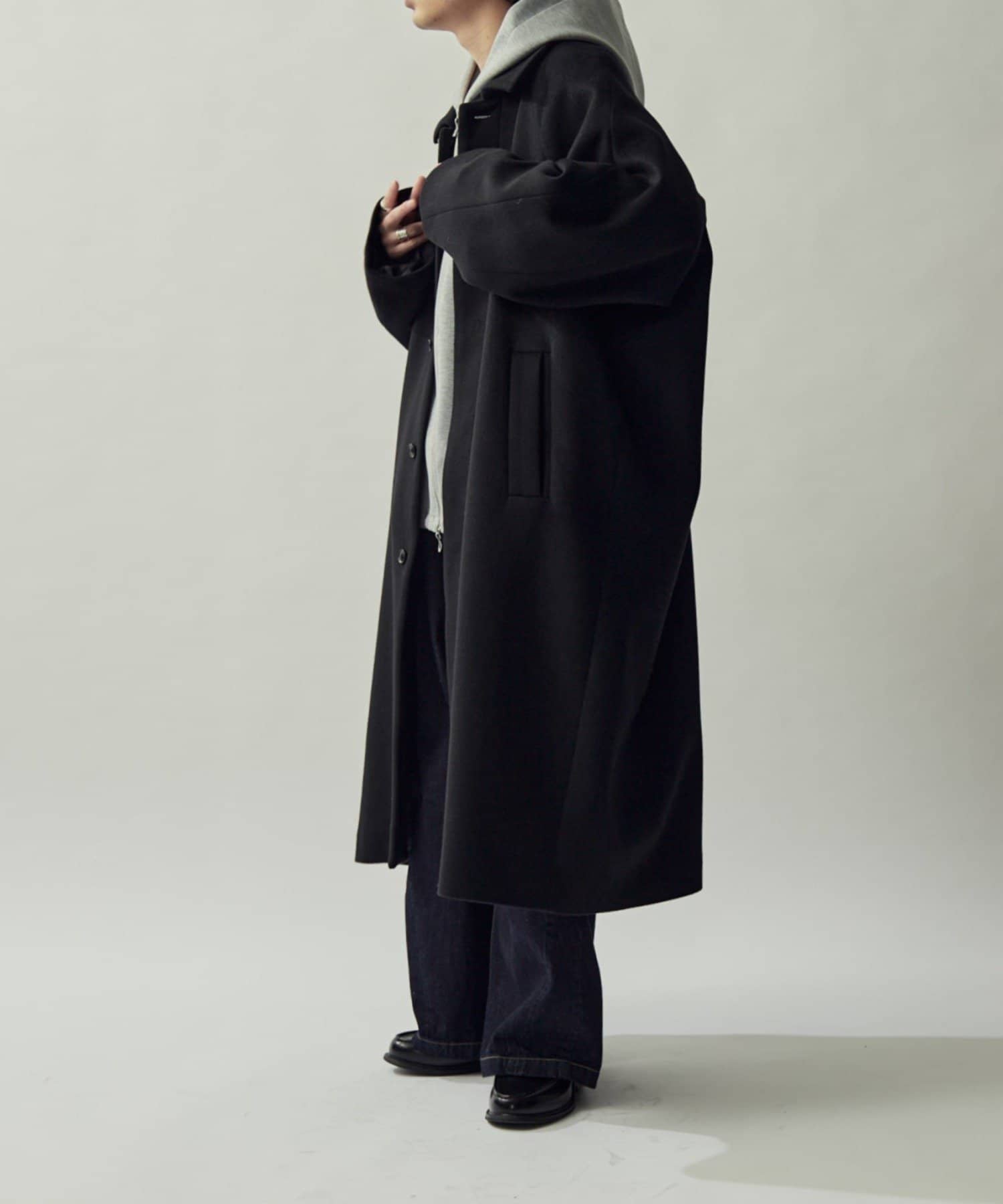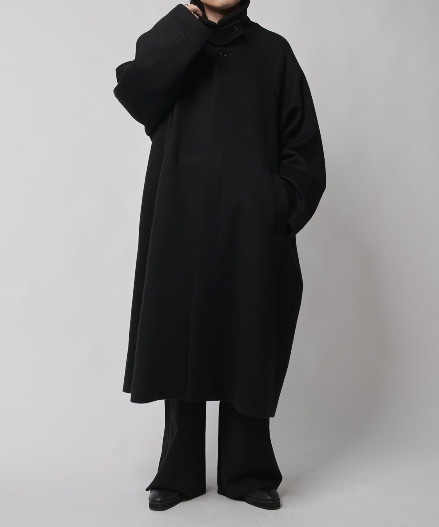 ステンカラーコートをベースに、アームホールから肘部分にかけてのワタリ(幅)を広くし、袖口にかけてはテーパードをかけ、ボリューミーな見た目に。