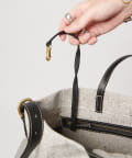 綿50%/植物繊維(ジュート)50% (付属)牛 縦糸に8号帆布クラスの太番手の「綿」を使用、そして横糸に「ジュート」を使用して織り上げた帆布。