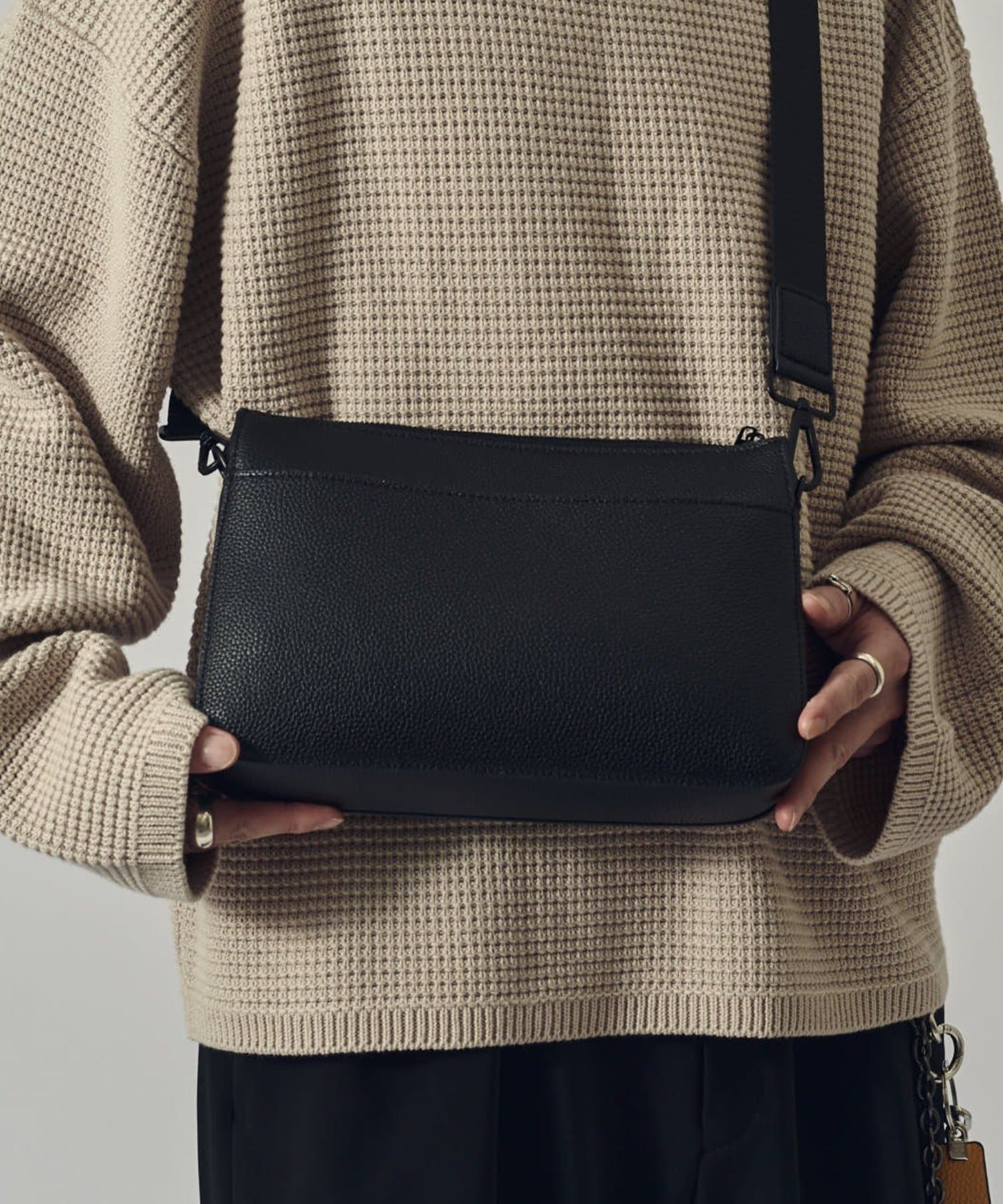 高級感のある見た目と少しクールな印象の素材感が、スタイリングのまとめ役にも。