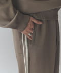 光沢と滑らかな手触りが特徴的な素材を使用したワイドのシルエットのトラックパンツ。