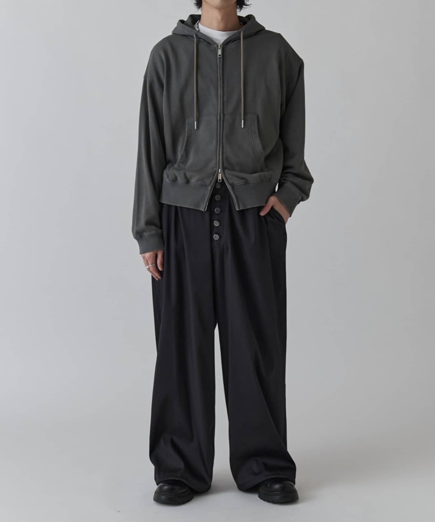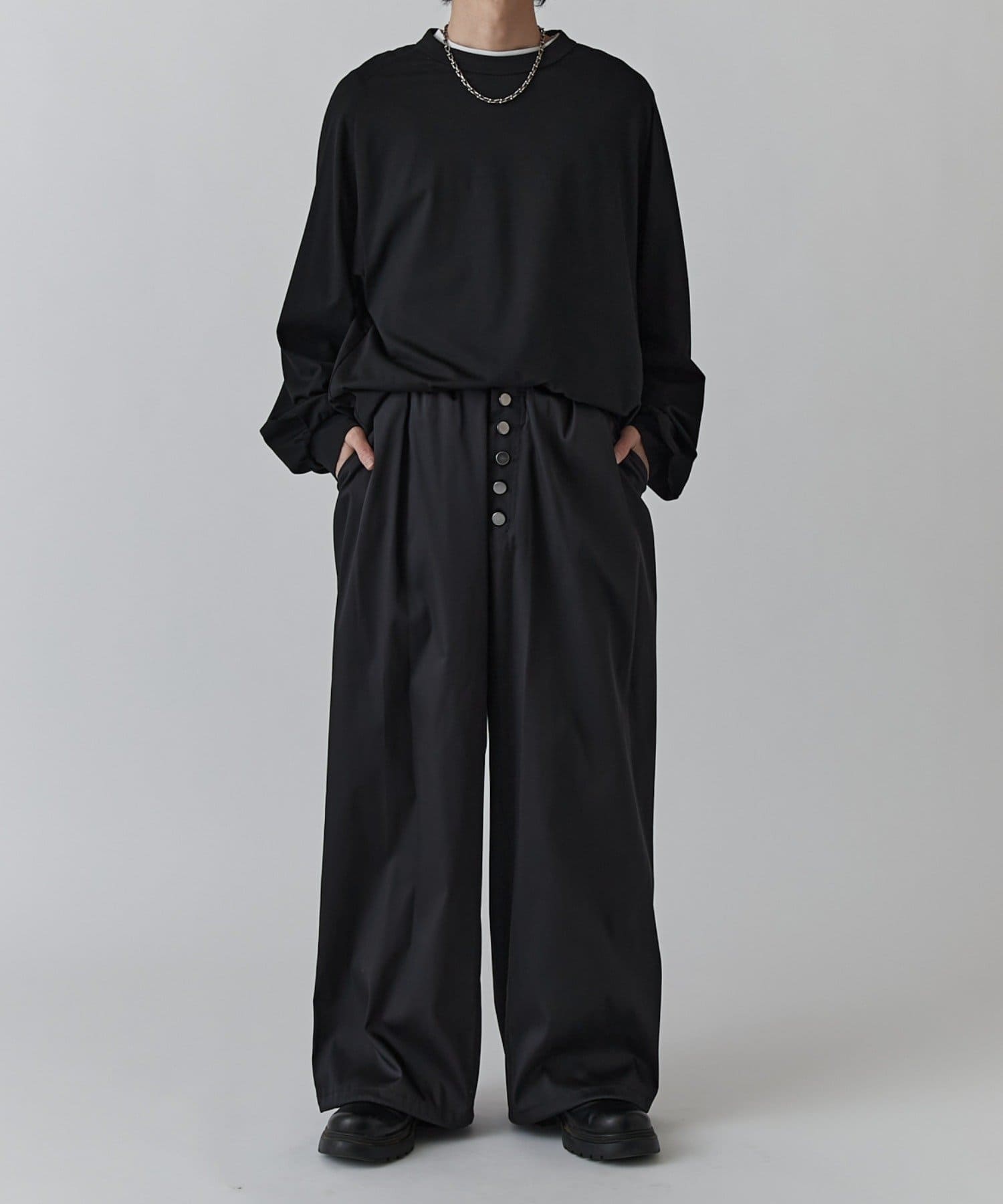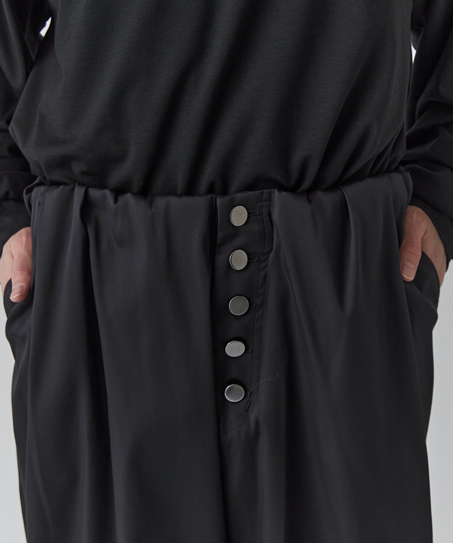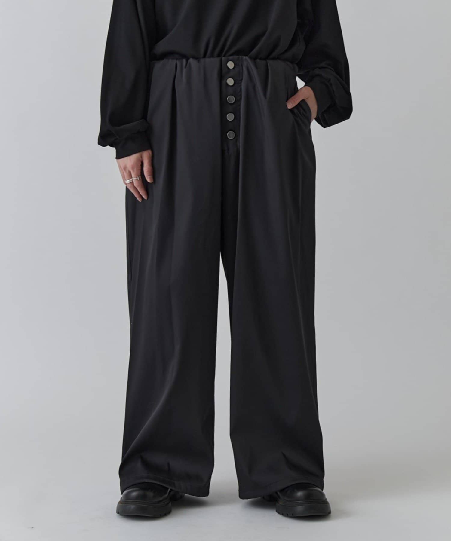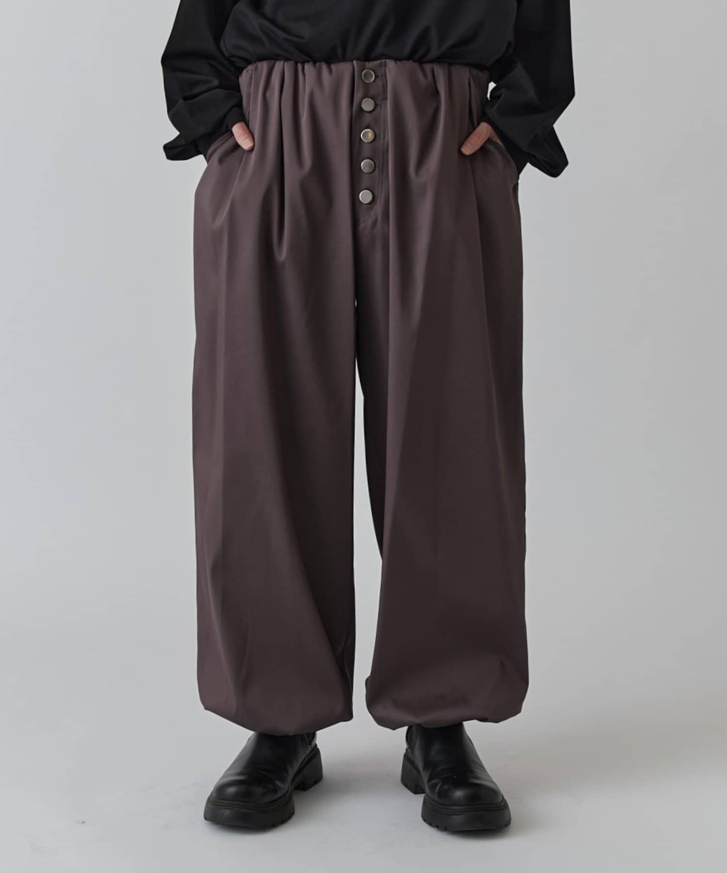 フロントのボタンフライがアクセントになったイージーパンツです。