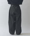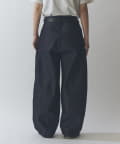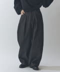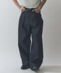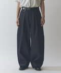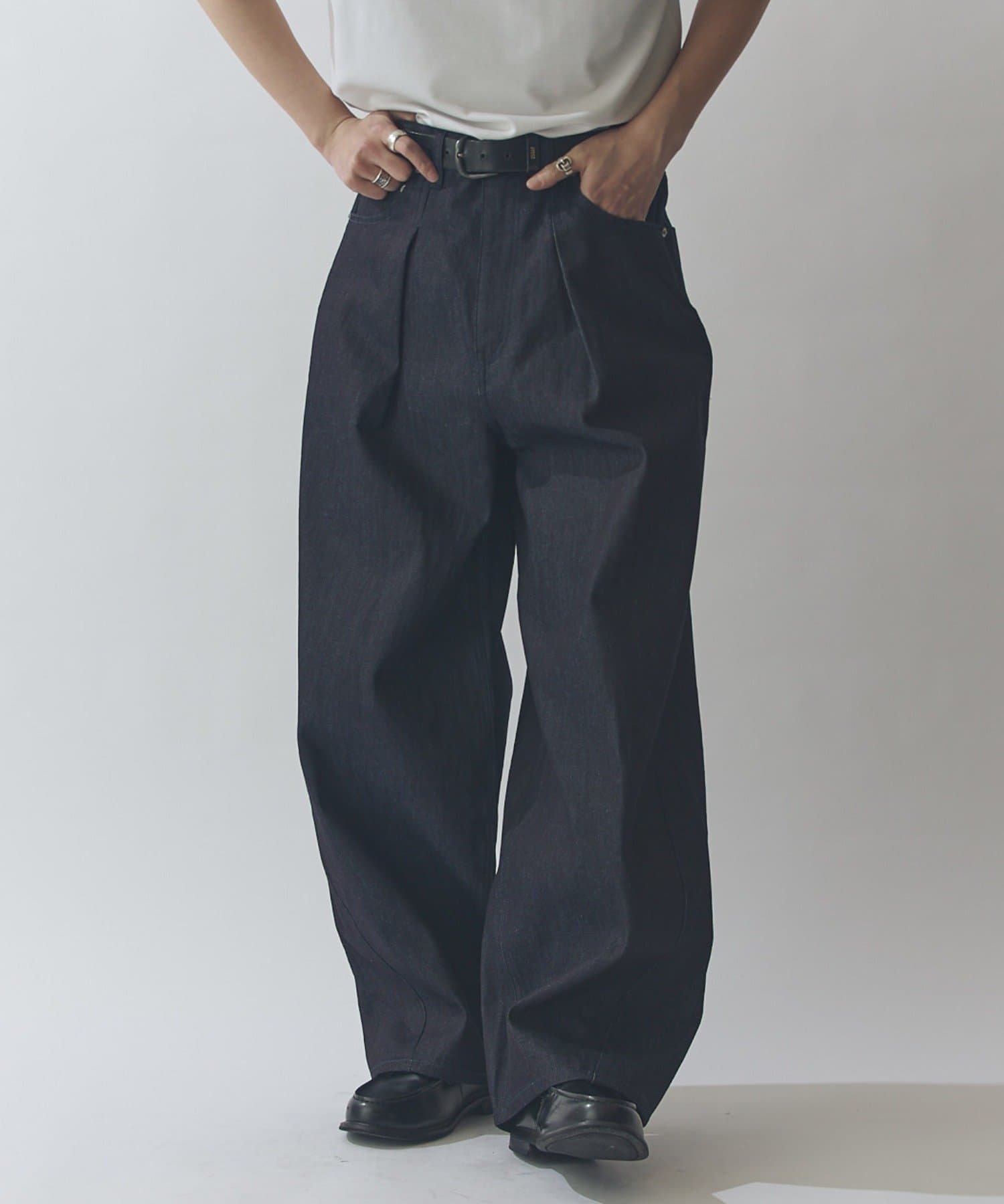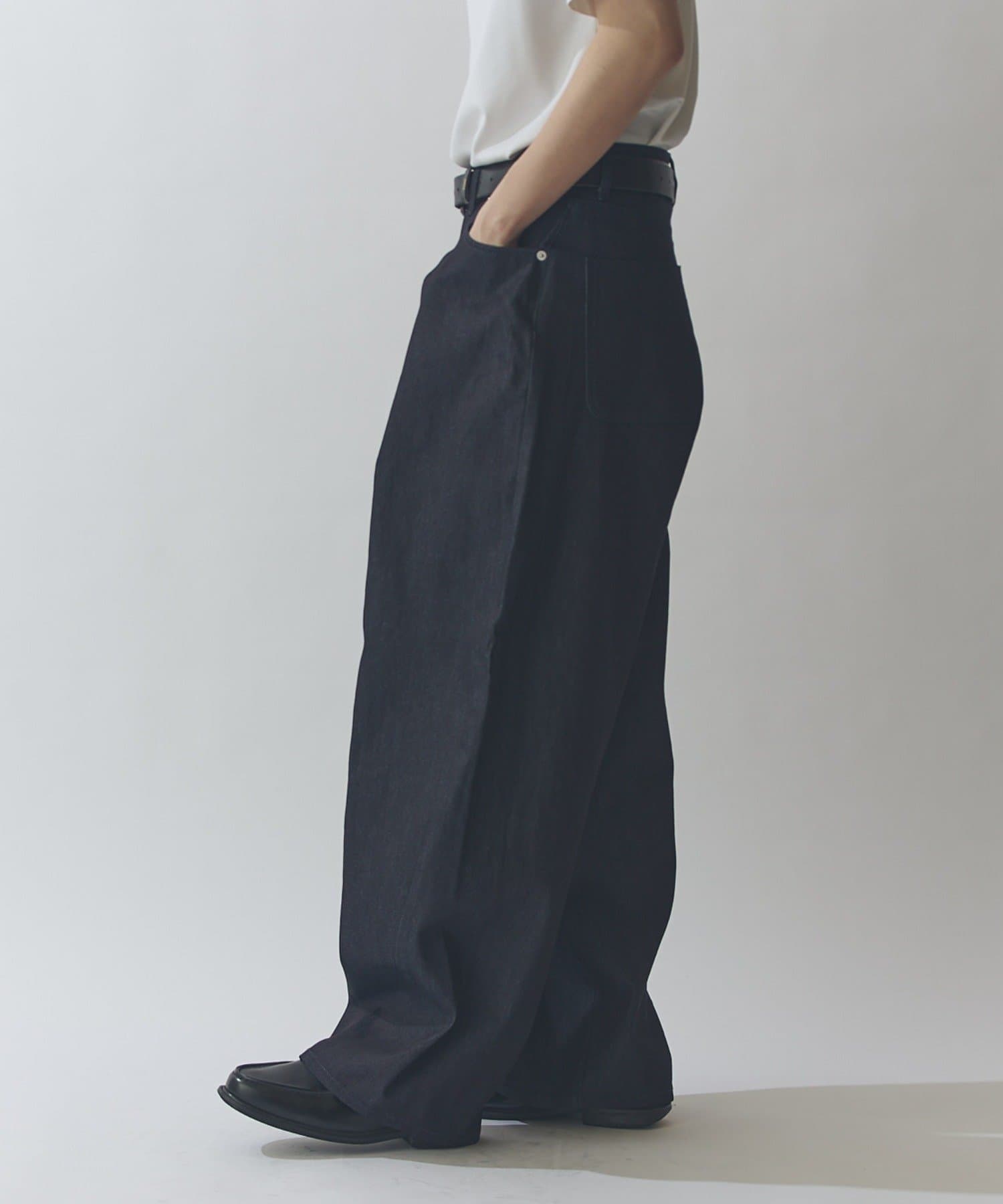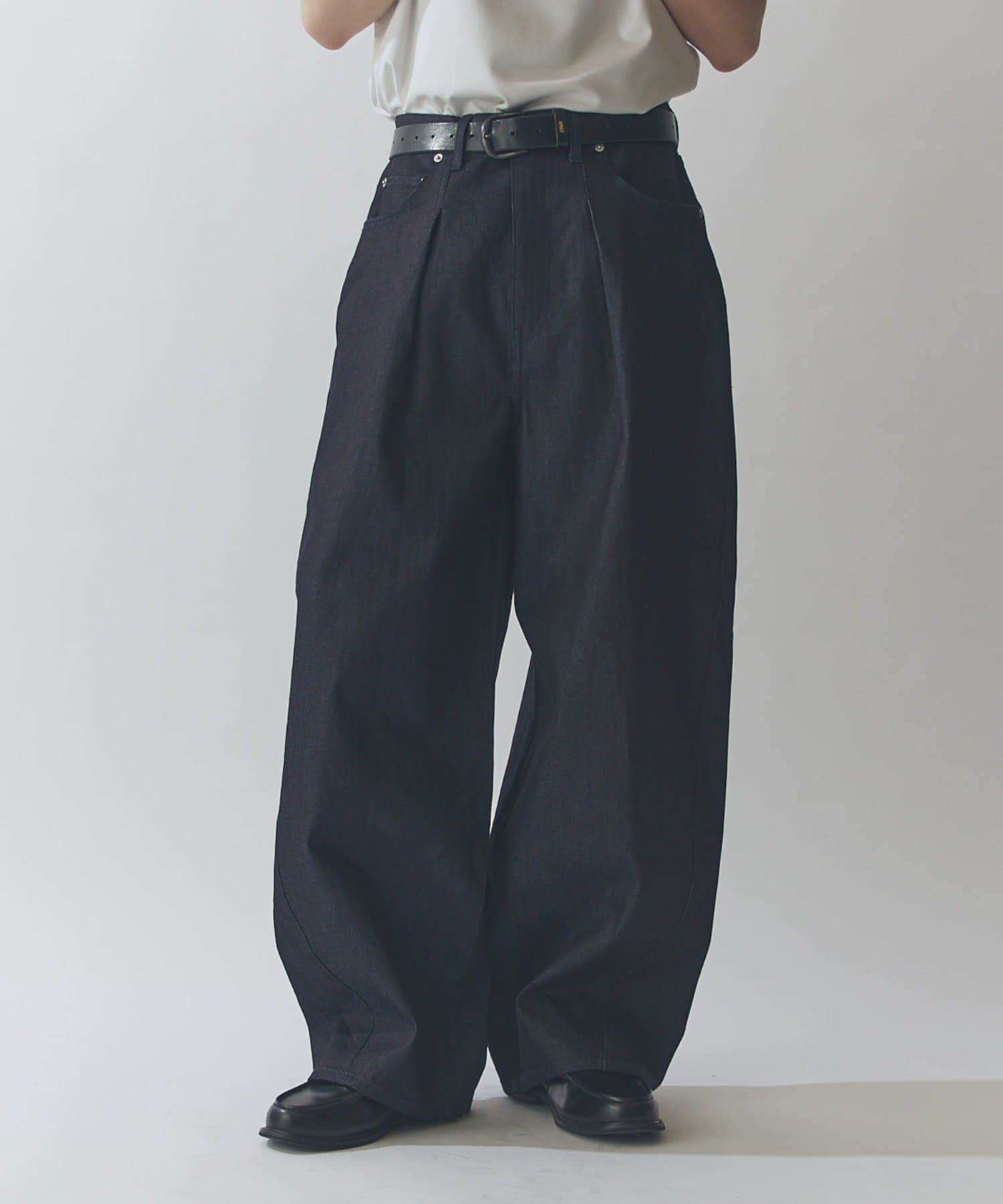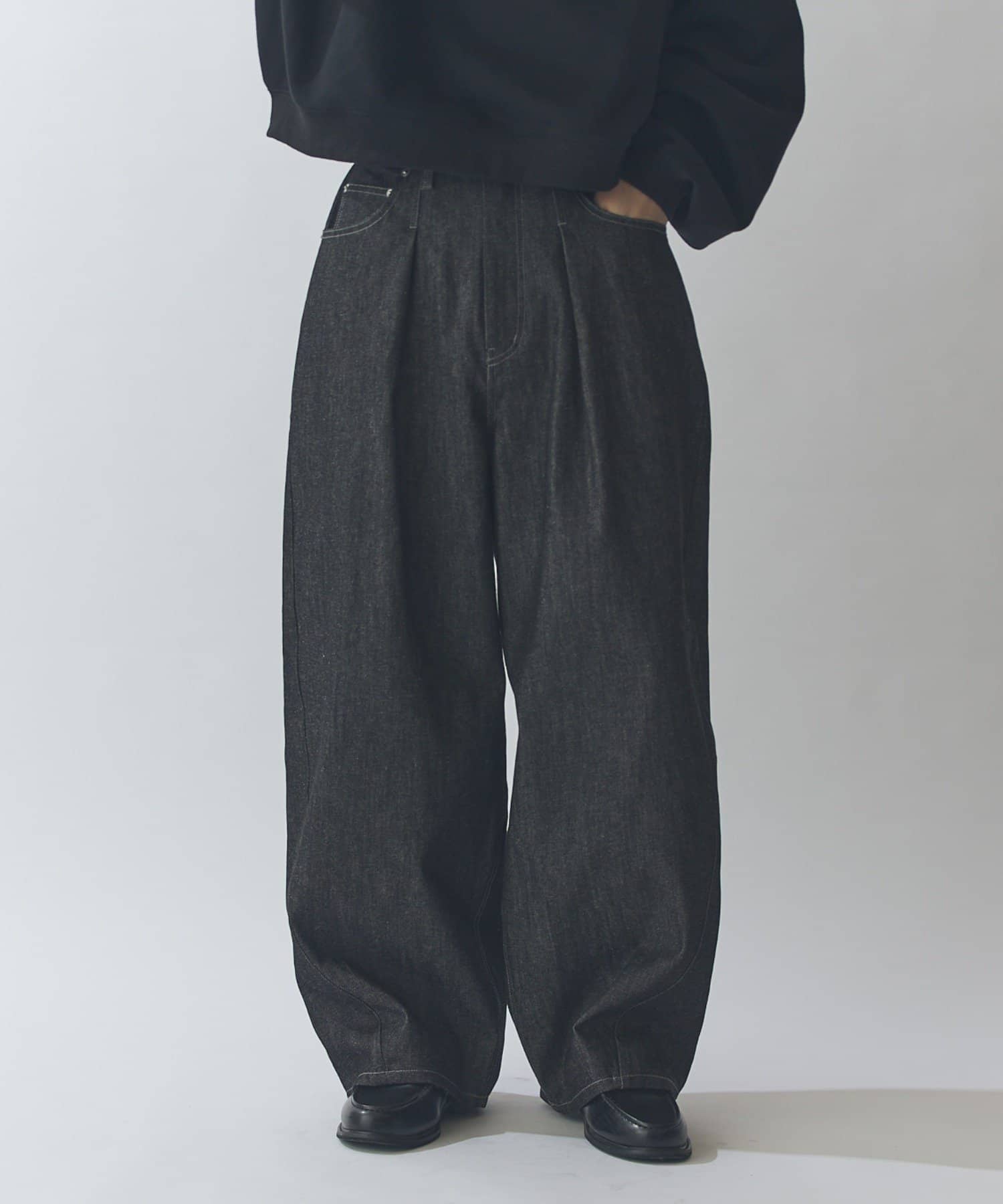 バルーンシルエットのリジットデニム。フロントにタックを取ることで、クリーンな印象に。膝の部分を広くとることで、特徴的なバルーンシルエットに仕上げました。
