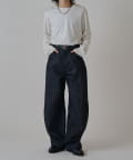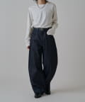 バルーンシルエットが特徴的なデニムパンツなので、無地のスウェットや無地のニットなど、プレーンなトップスを組み合わせるだけで、スタイルが完成します。