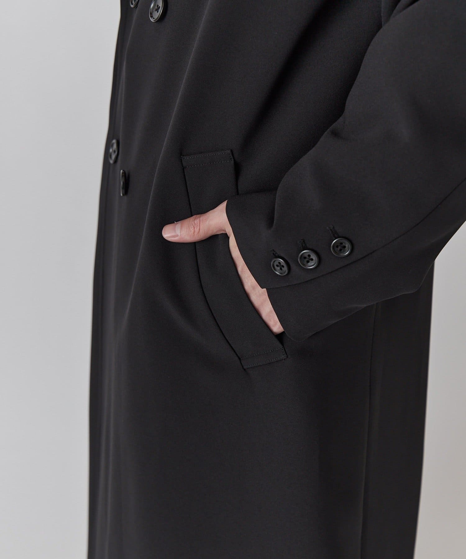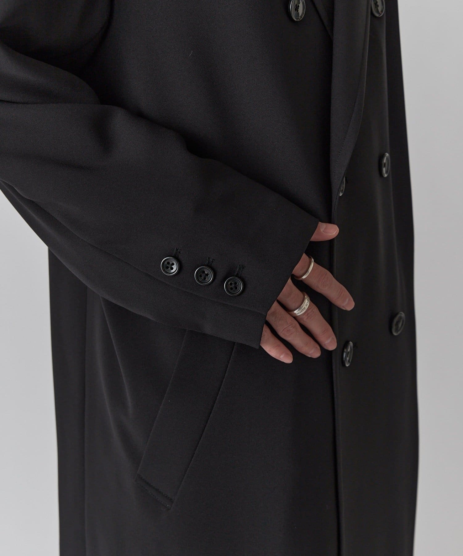 前身頃の重なる部分が広く、ボタンが縦に2列に並んでいるデザインが特徴的なロングコート。