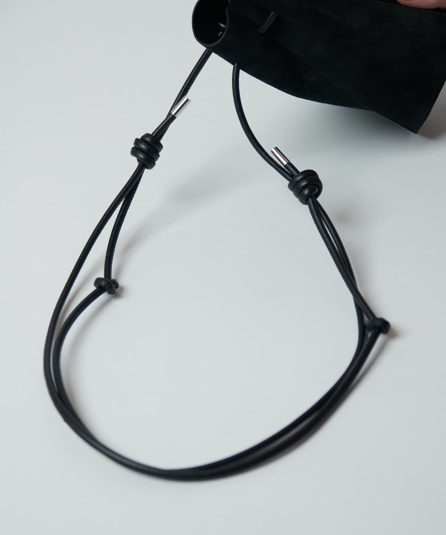 ショルダーストラップには、5mm径のしなやかなレザー丸紐を採用。スライド式の結び目で長さ調整が可能となっており、肩掛け・斜め掛け・手持ちなど、スタイルに合わせた使い分けが楽しめます。ストラップにはロックミシンによるステッチを施し、細部にも抜かりない仕立てが光ります。