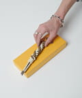 繊細なレザーの動きと、存在感のあるオリジナルメタルパーツを組み合わせることで、力強さと上品さが共存するミニマルなレザーアクセサリーに仕上がっています。