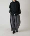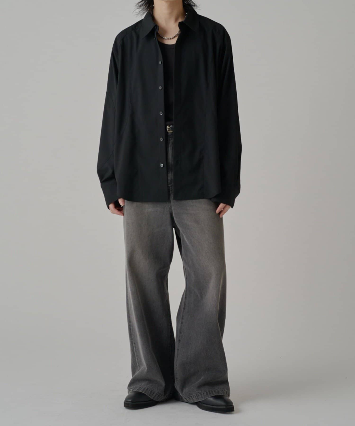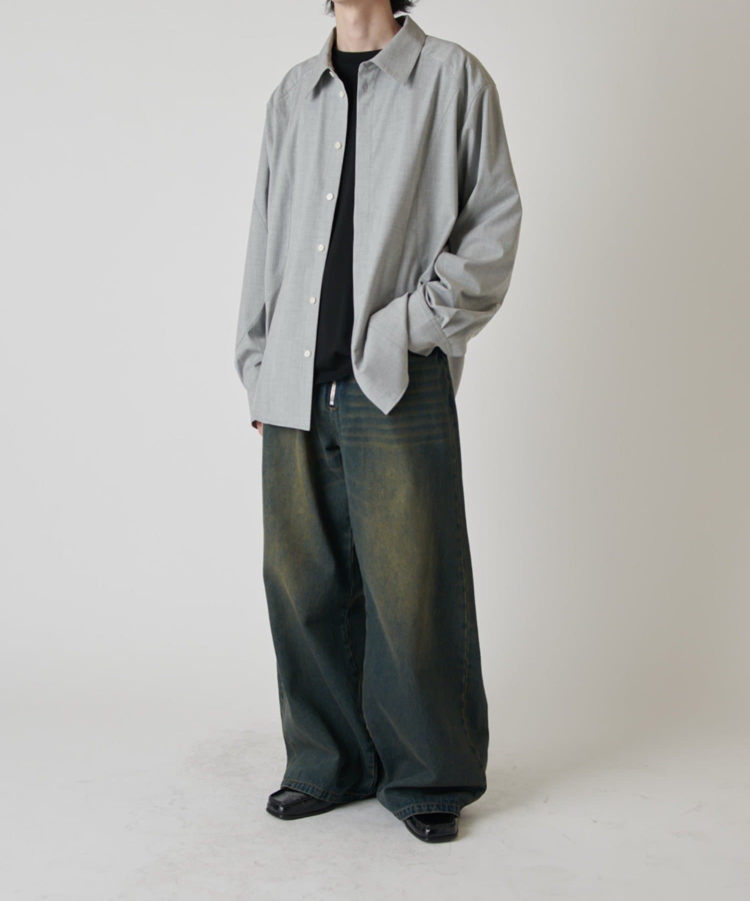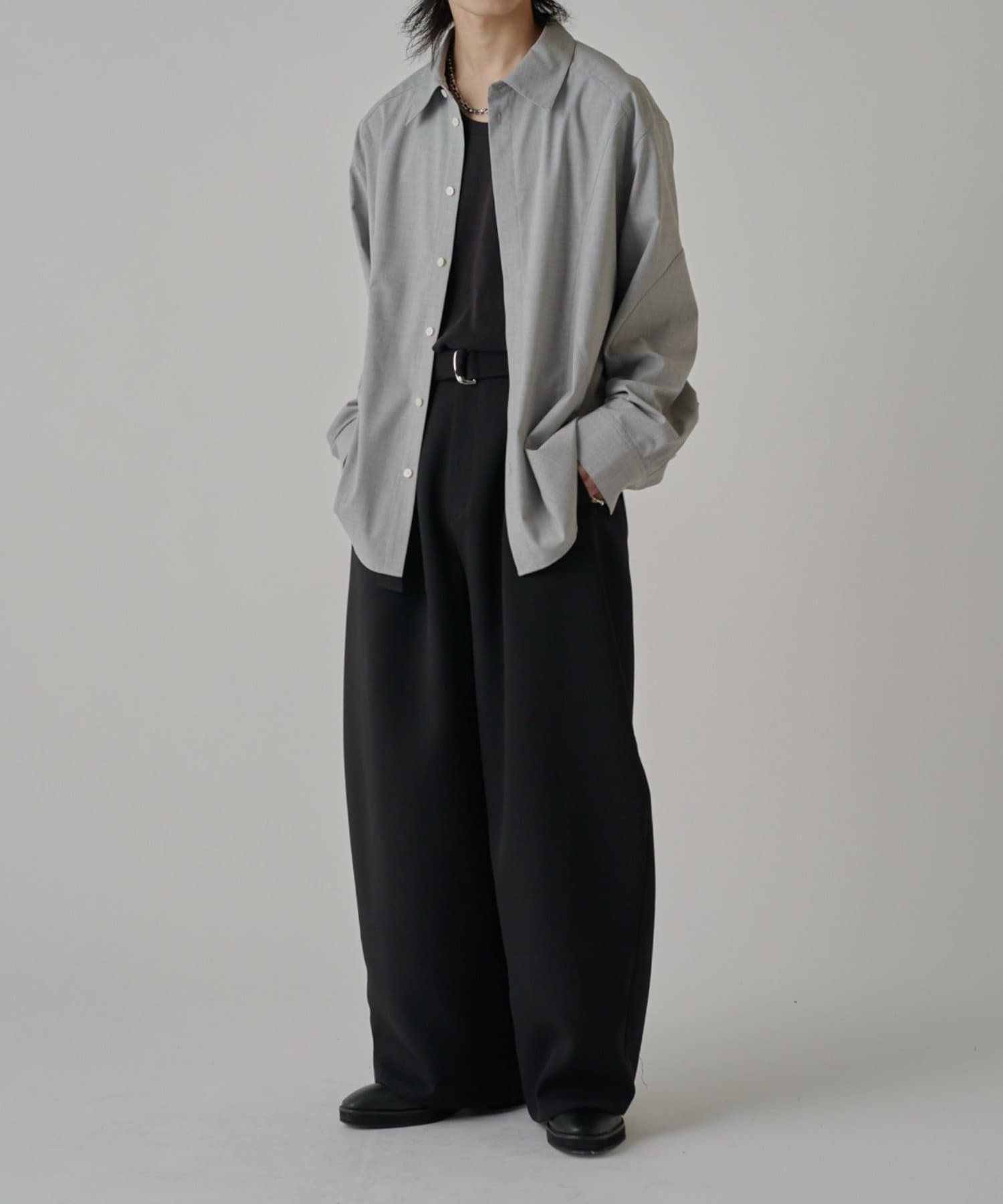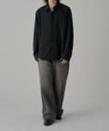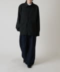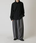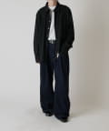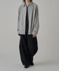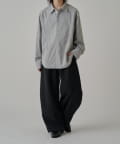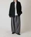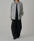 切替のデザインとルーズなサイズ感が特徴的なシャツなので、ワイドシルエットのパンツやデニムパンツと組み合わせたカジュアルなスタイルがオススメ。