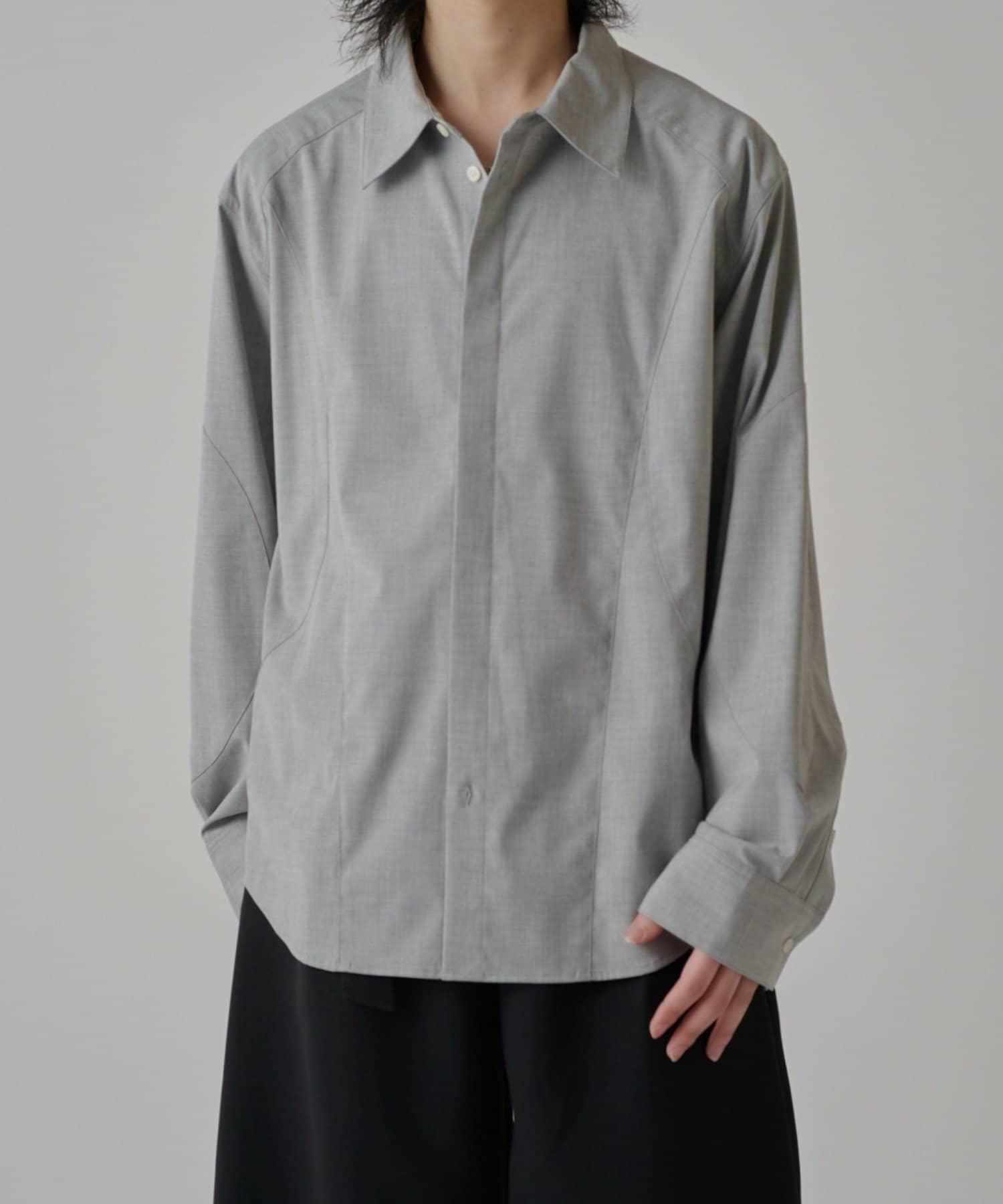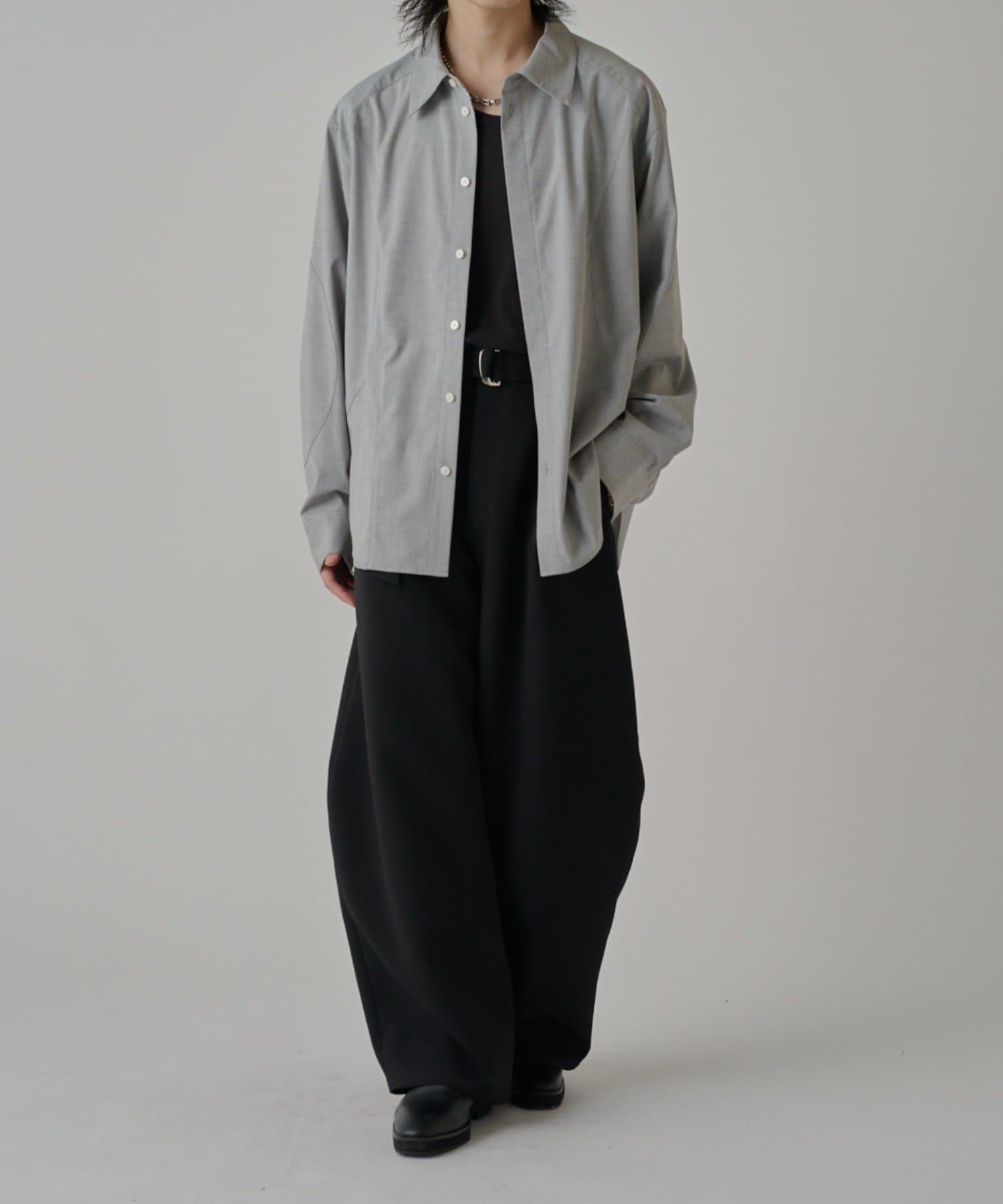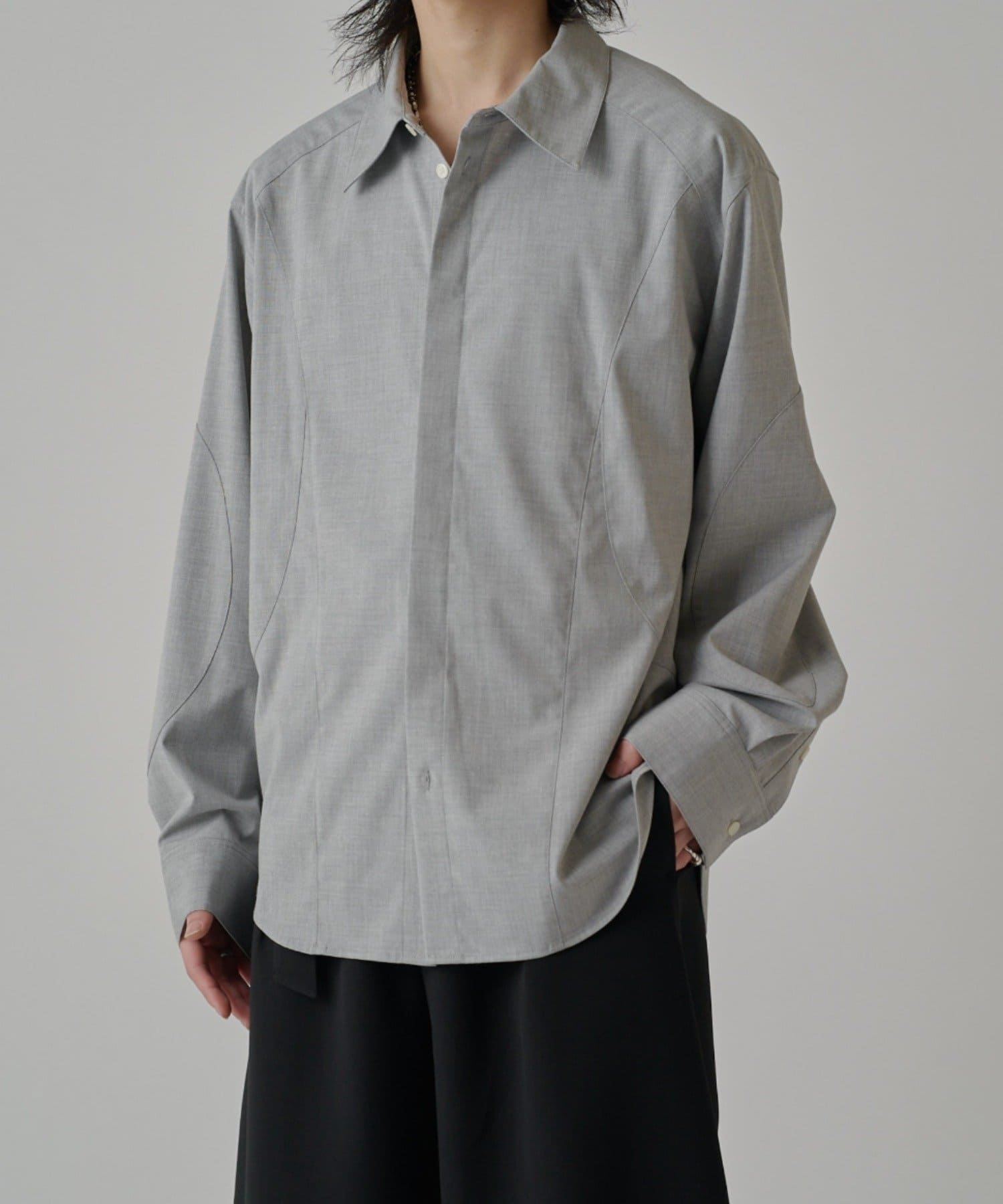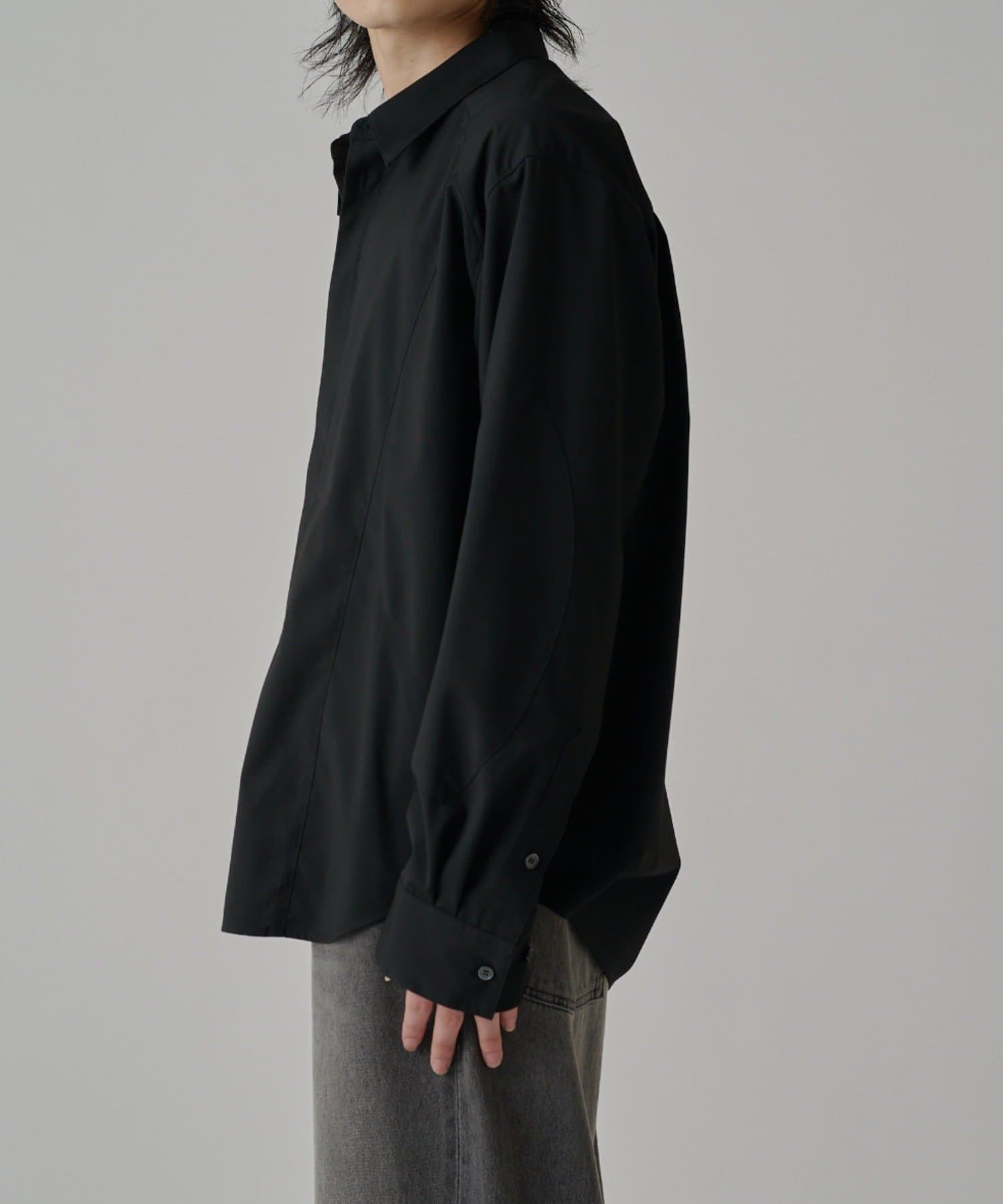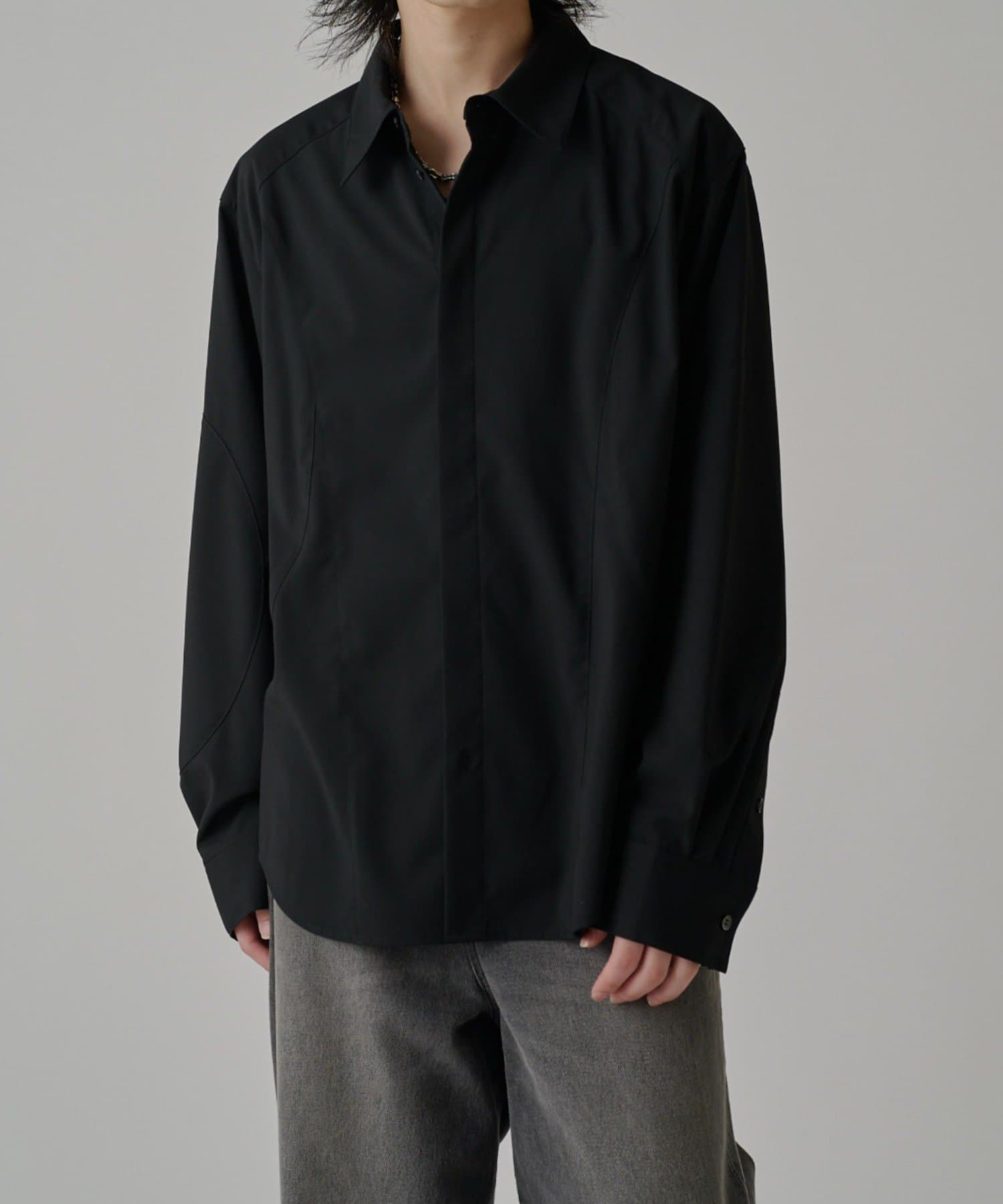 ・切替デザインが特徴的なシャツ。コンテンポラリーな曲線の切替がポイント。ルーズなサイジングで、一枚でサラッと着て頂けます。