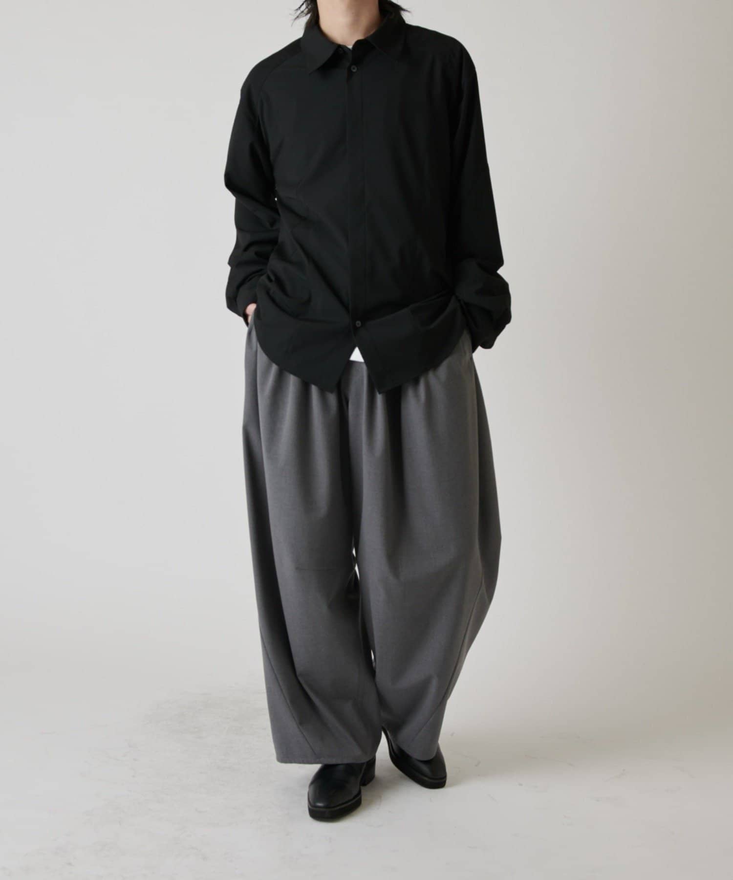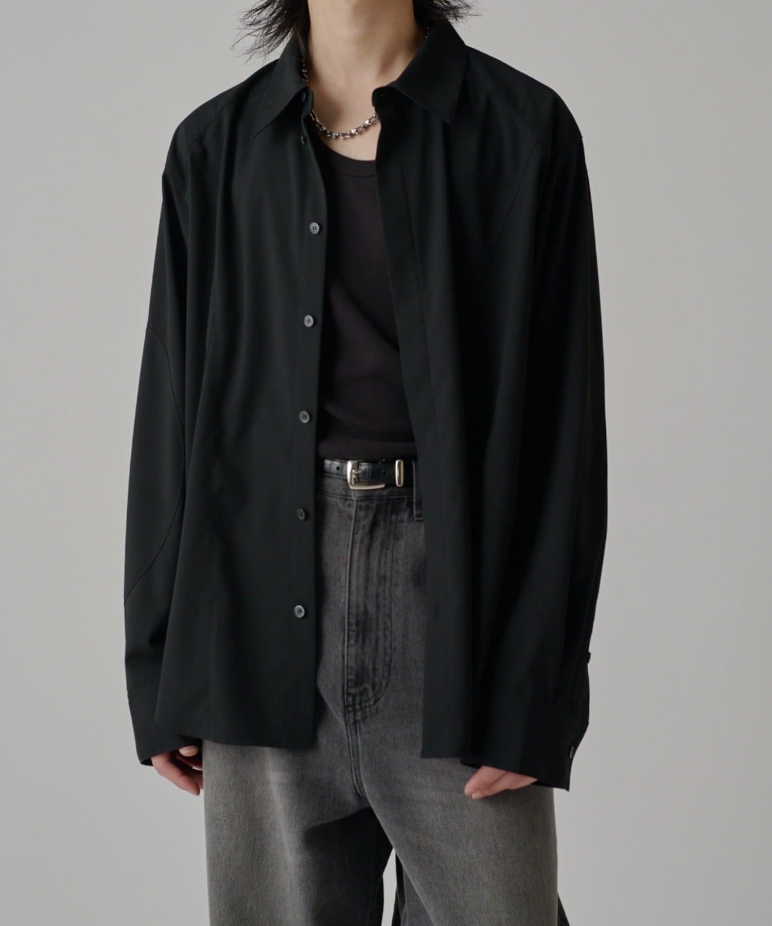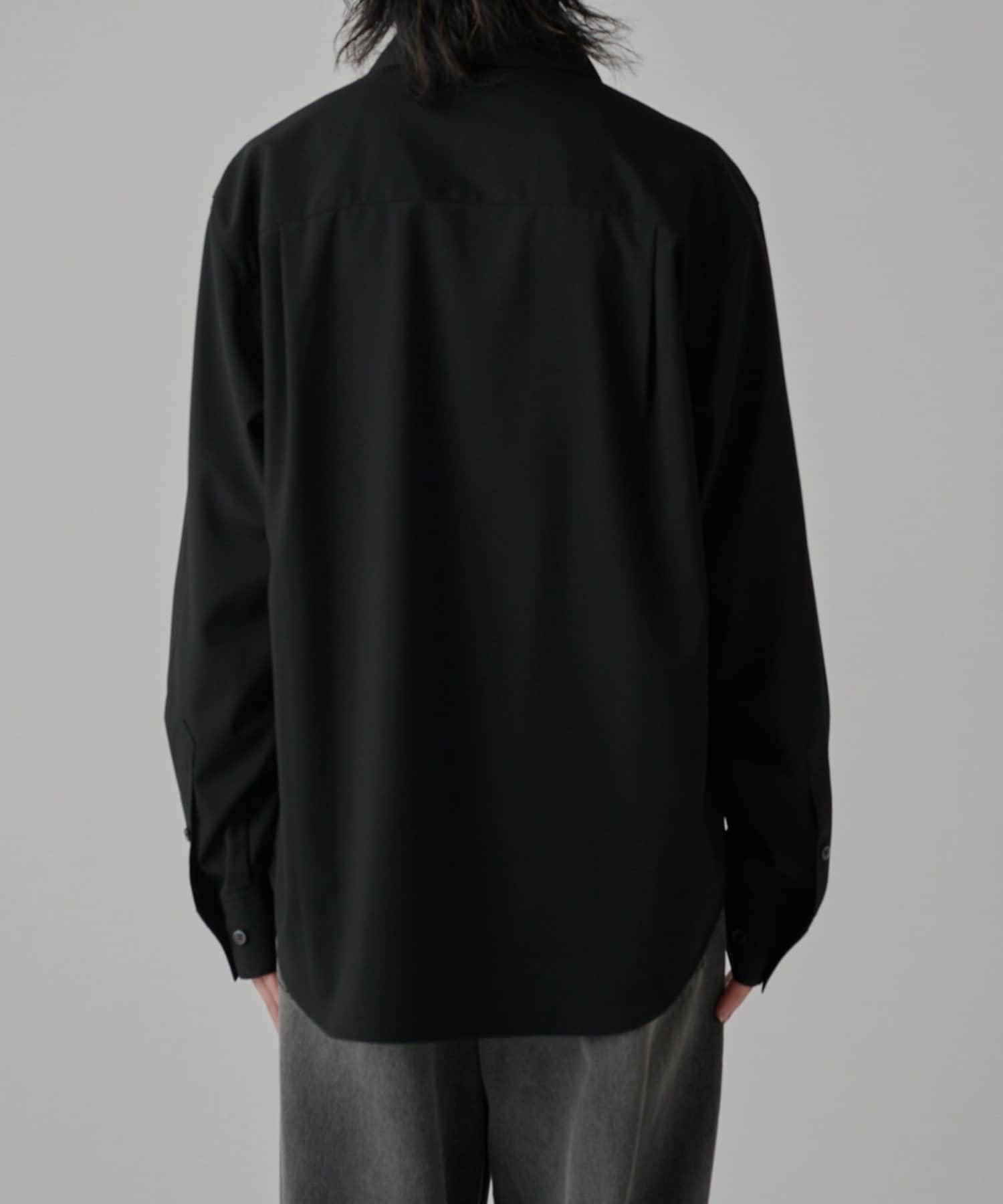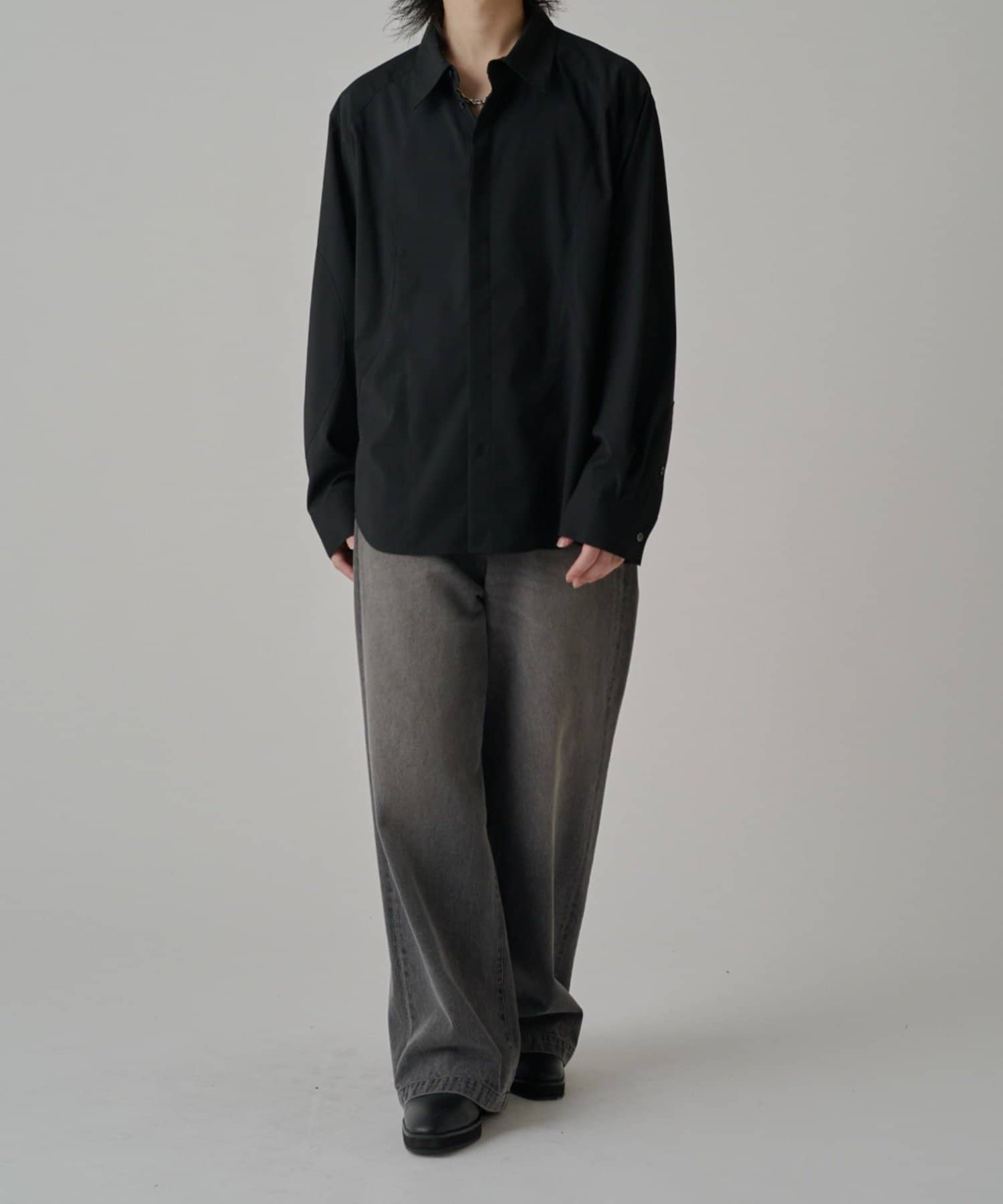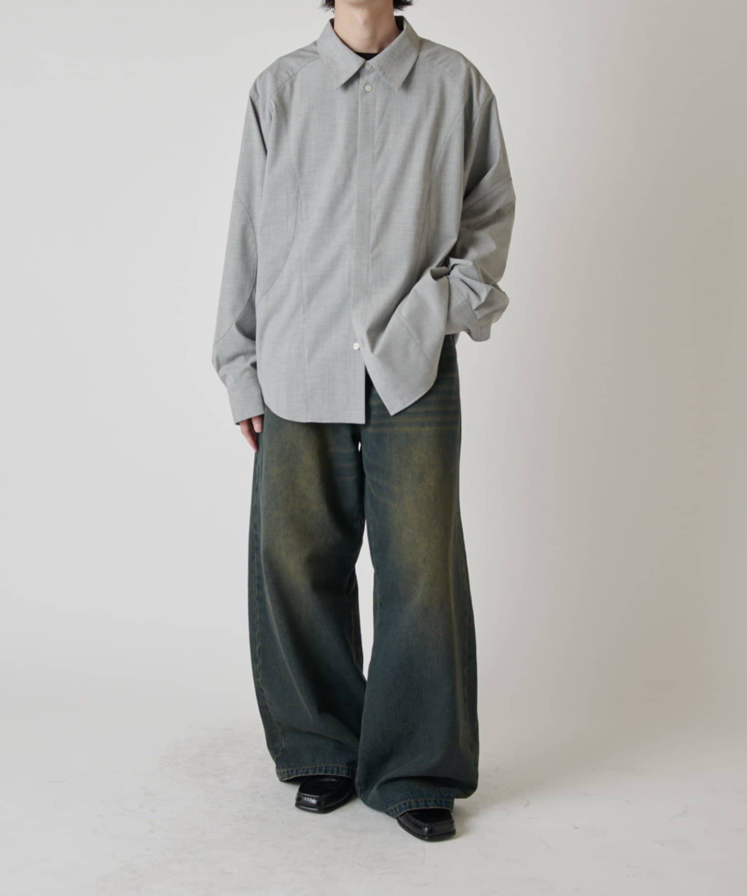・切替デザインが特徴的なシャツ。コンテンポラリーな曲線の切替がポイント。ルーズなサイジングで、一枚でサラッと着て頂けます。