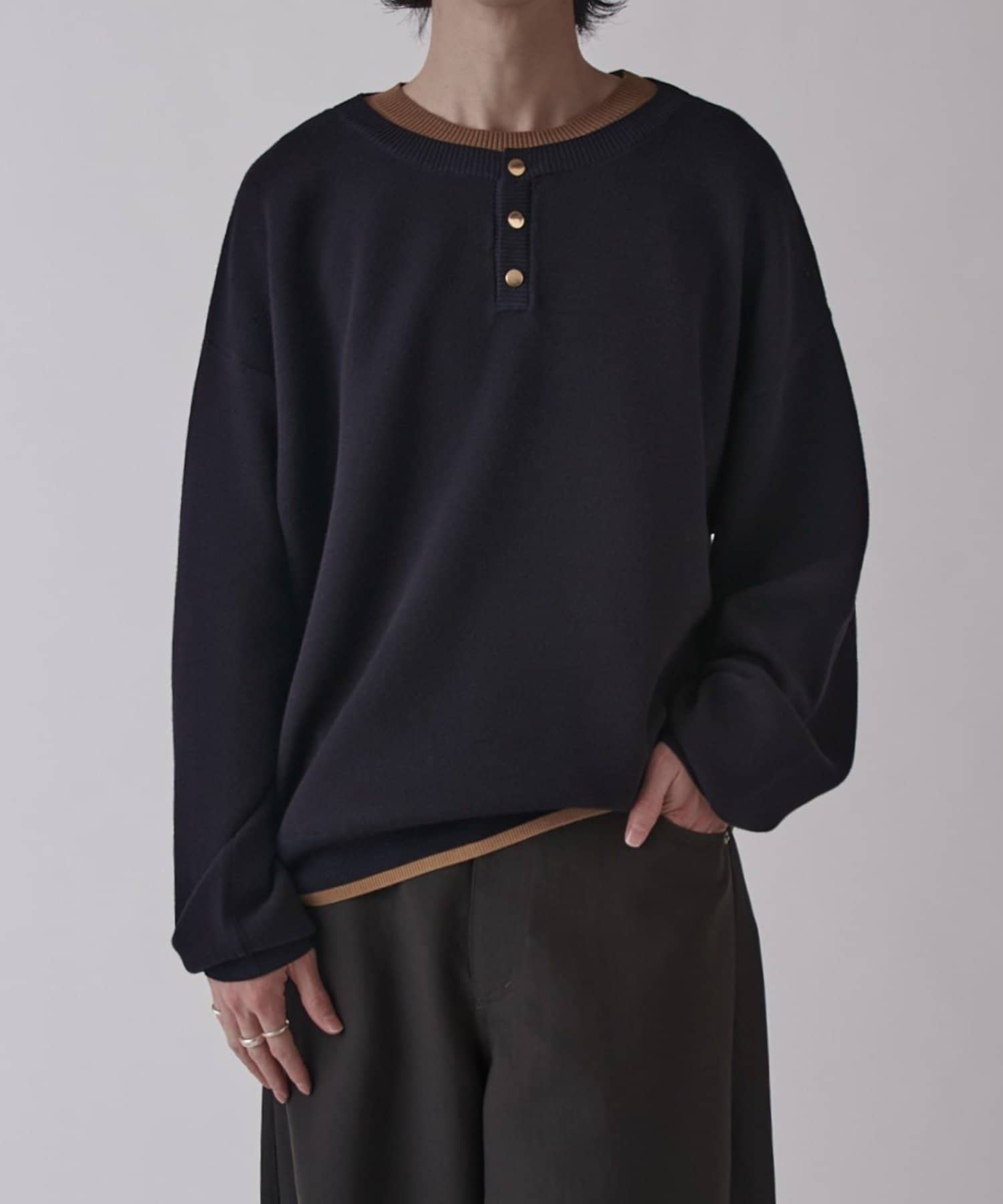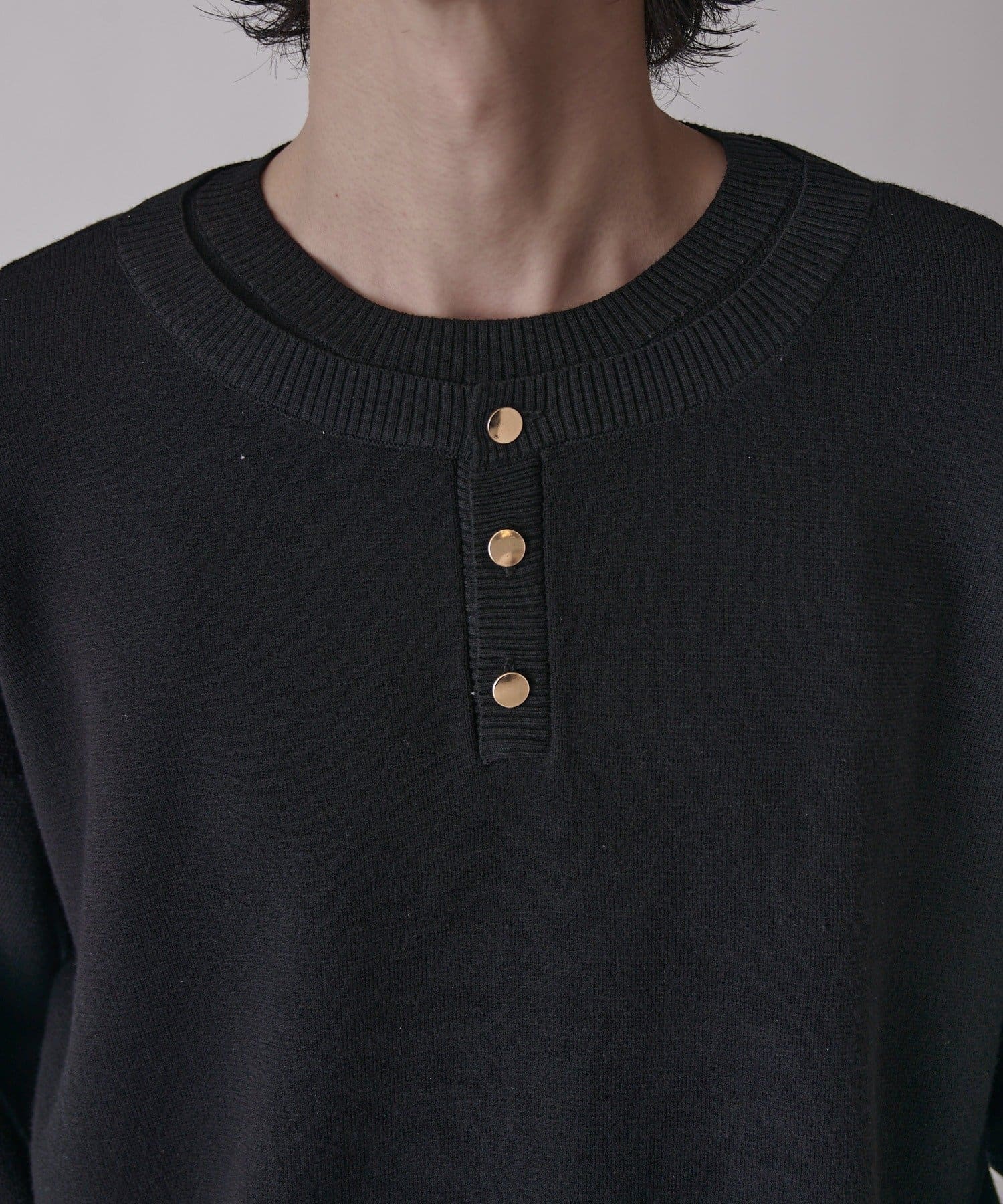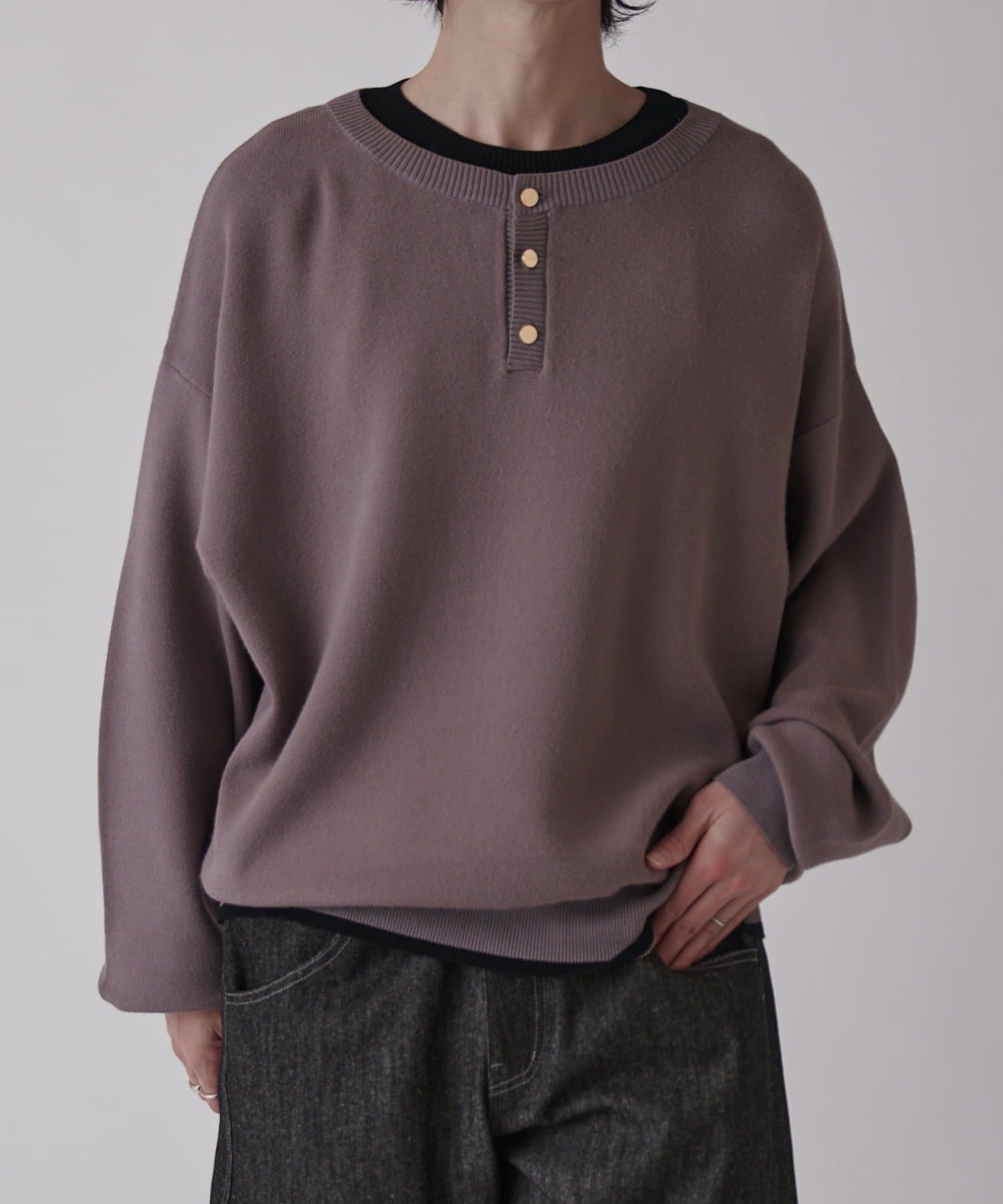 首元がレイヤードデザインになったヘンリーネックニット。