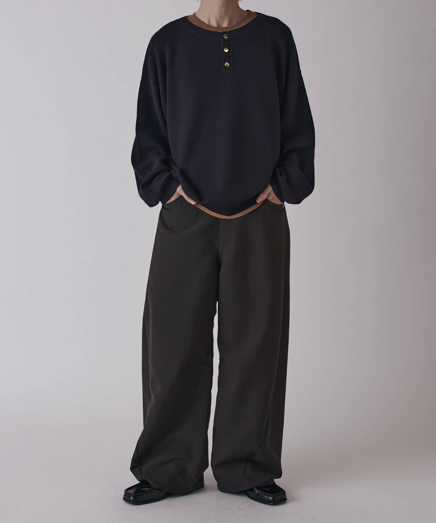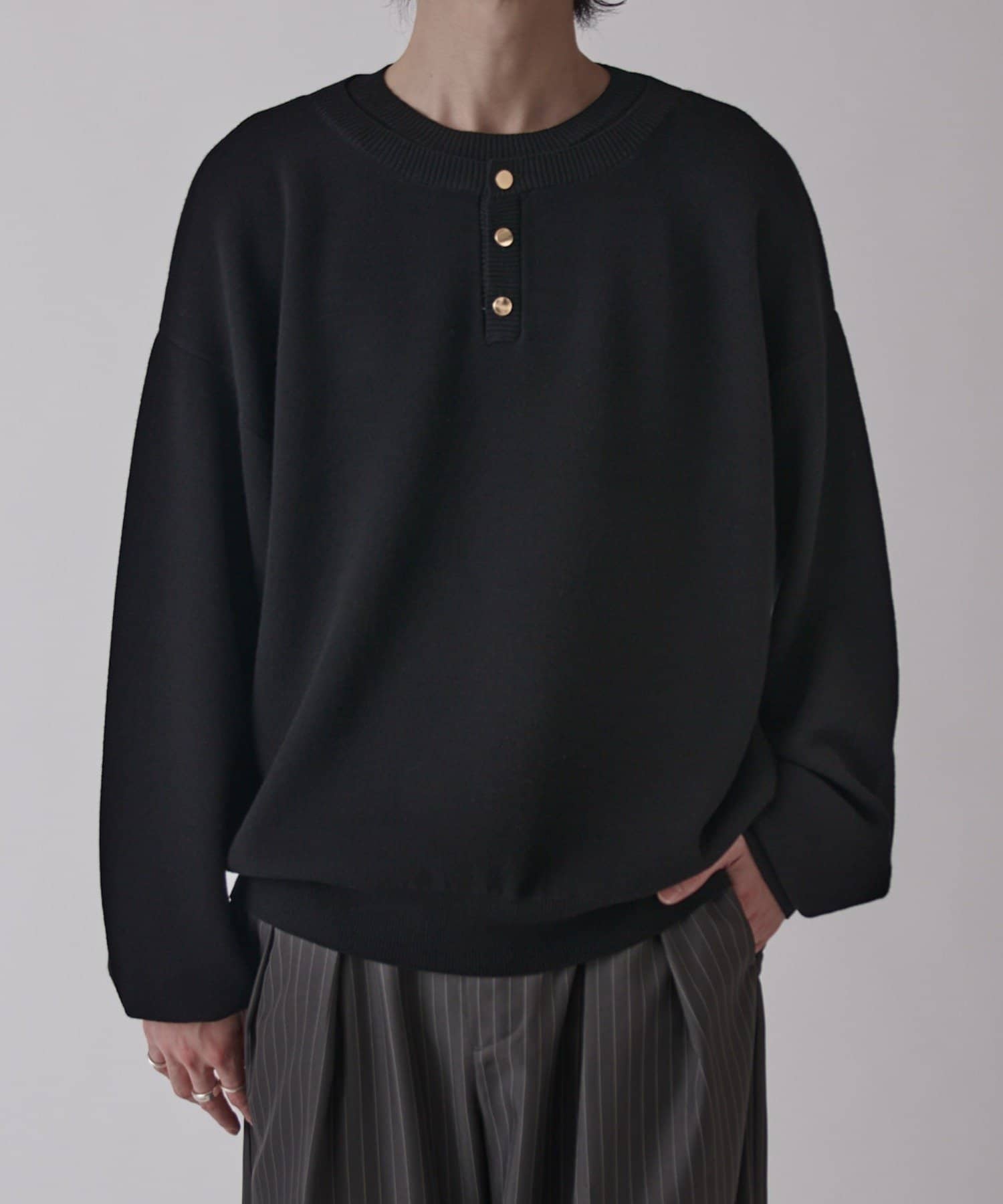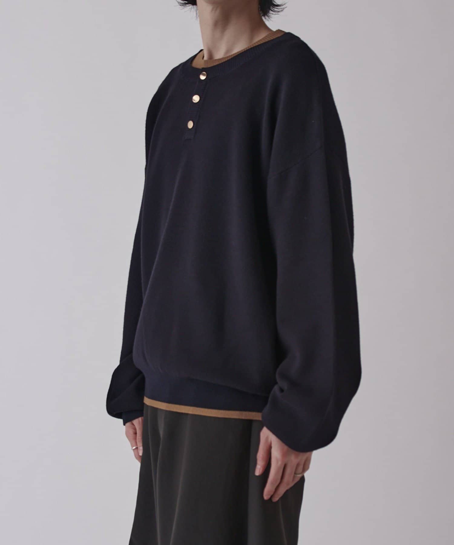 首元がレイヤードデザインになったヘンリーネックニット。
