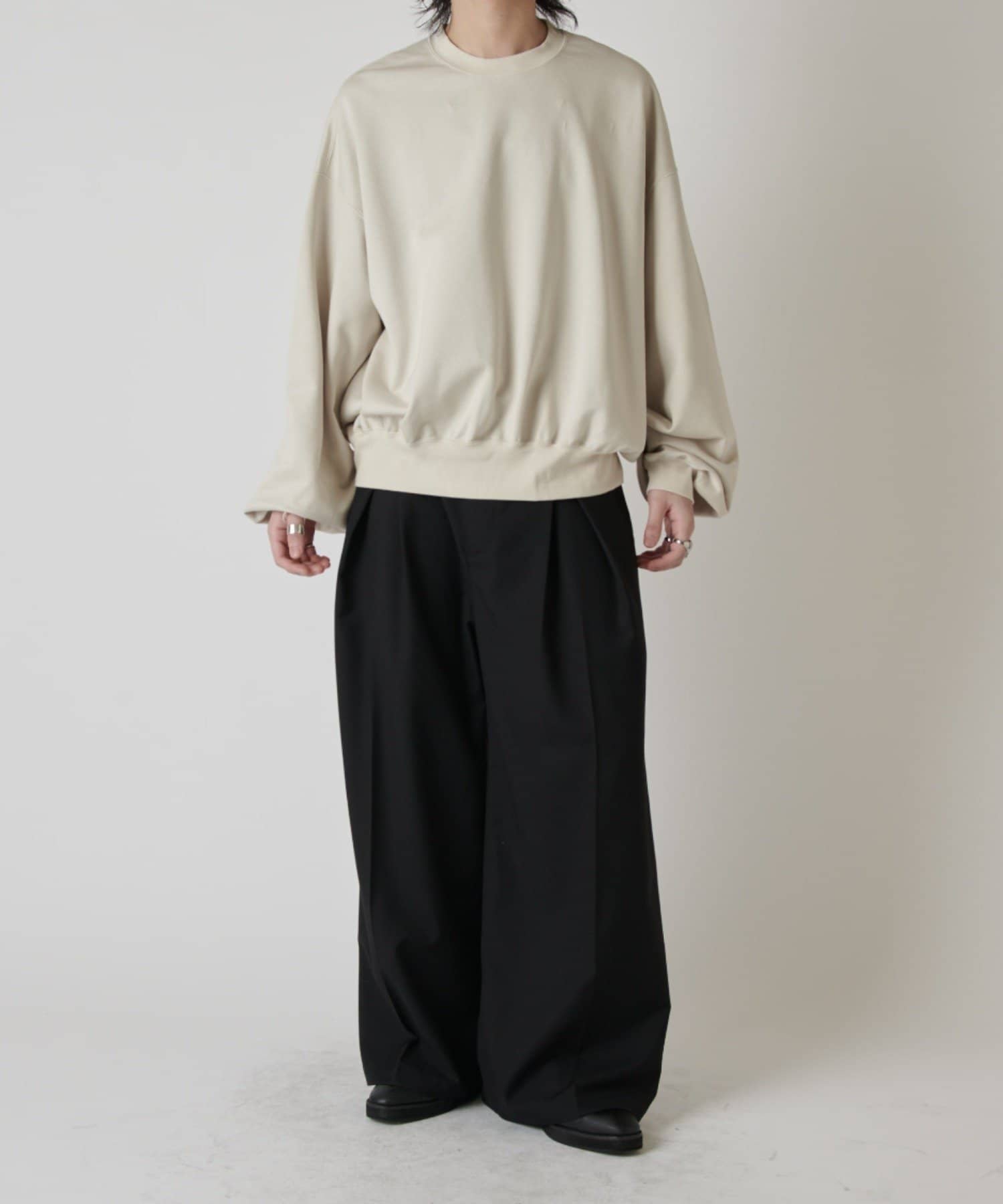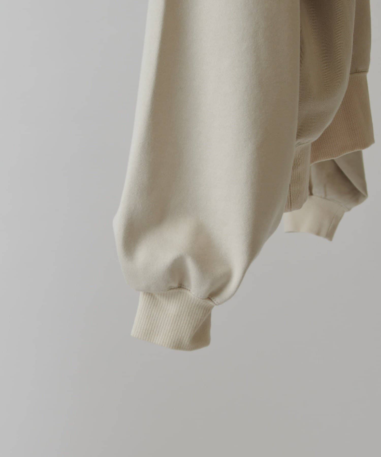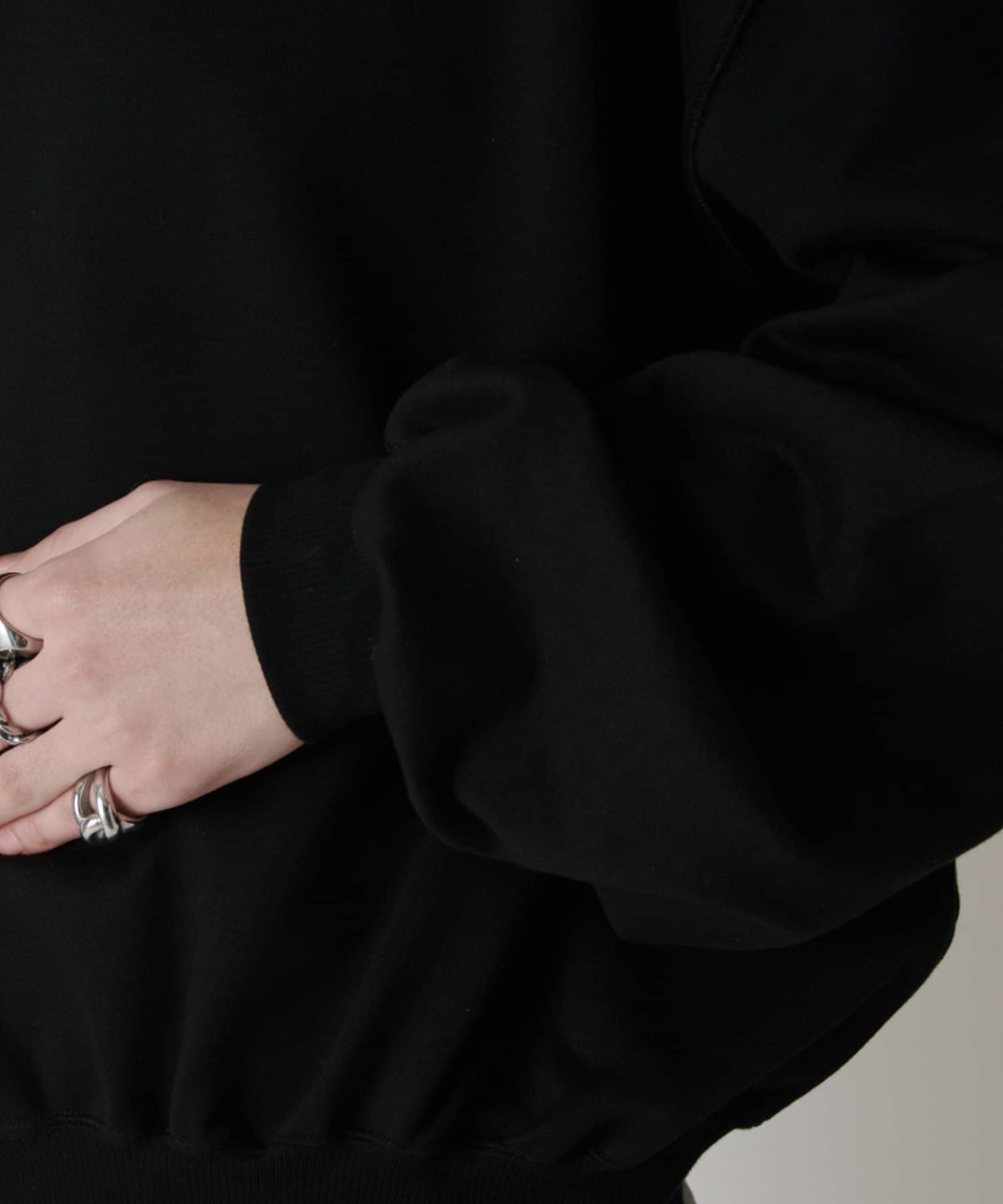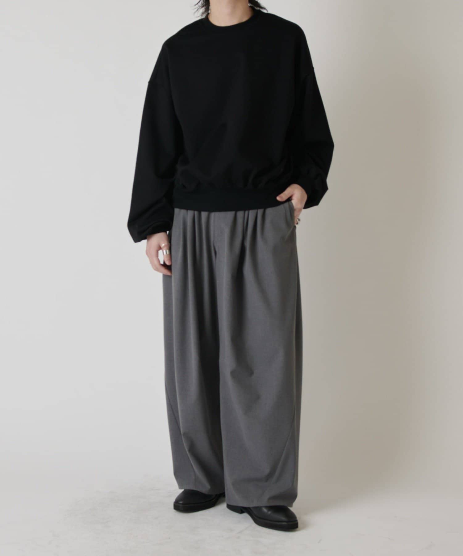 ・ボリューム感ある身幅や袖に対して、袖と裾のリブのテンションをやや強めに設定することで、ボリュームのあるバルーンシルエットに仕上げシンプルながら存在感のあるシルエットに。