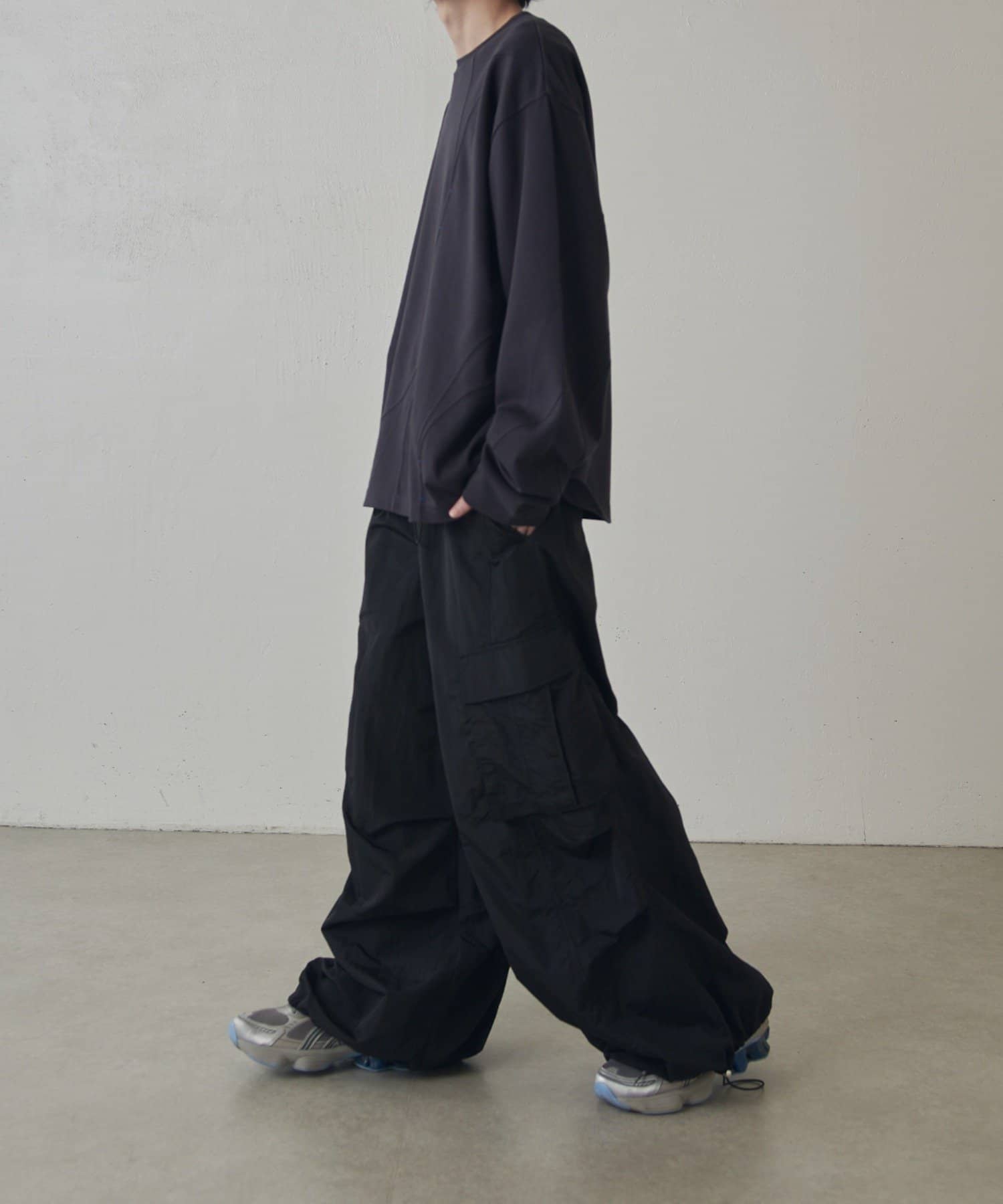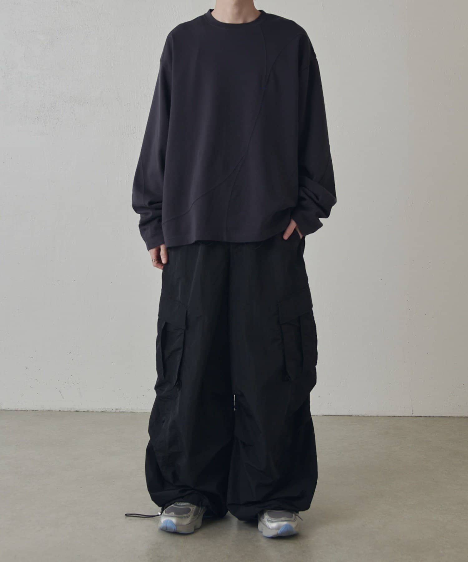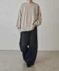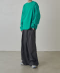 切替デザインが特徴的なロンTなので、デニムパンツや、ワイドパンツと組み合わせたストリートカジュアルなスタイルがオススメ。