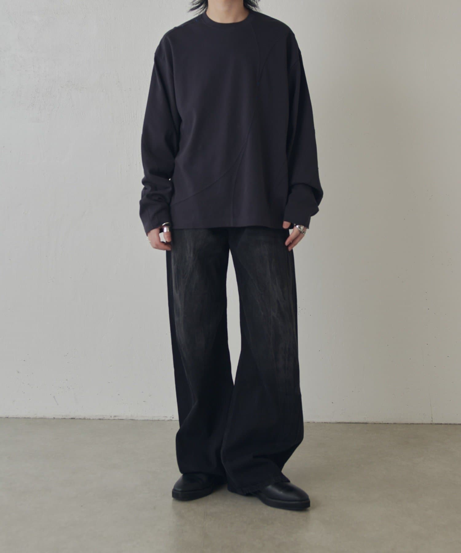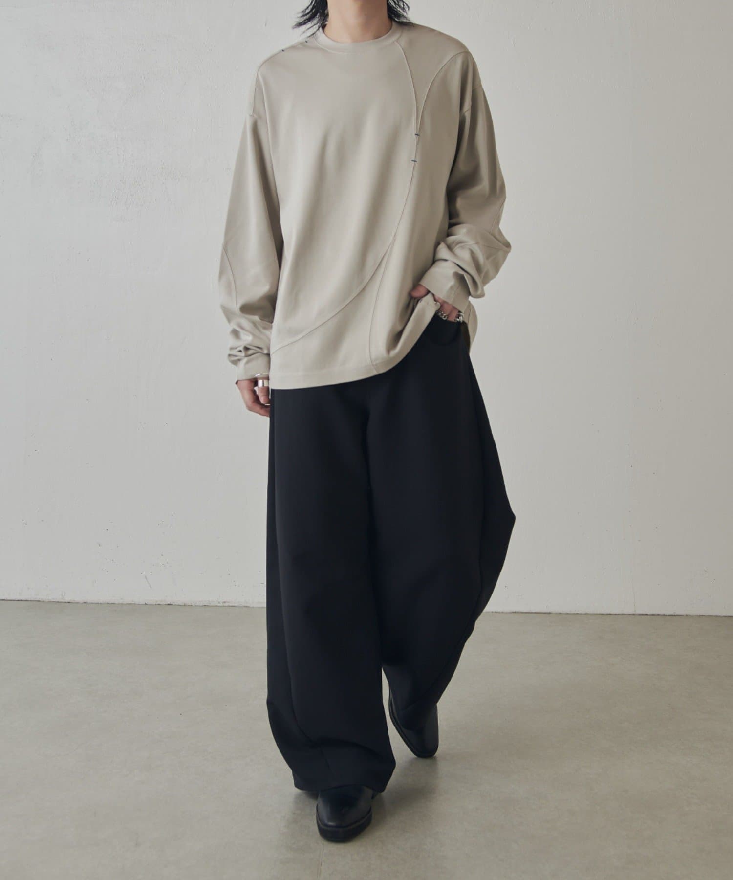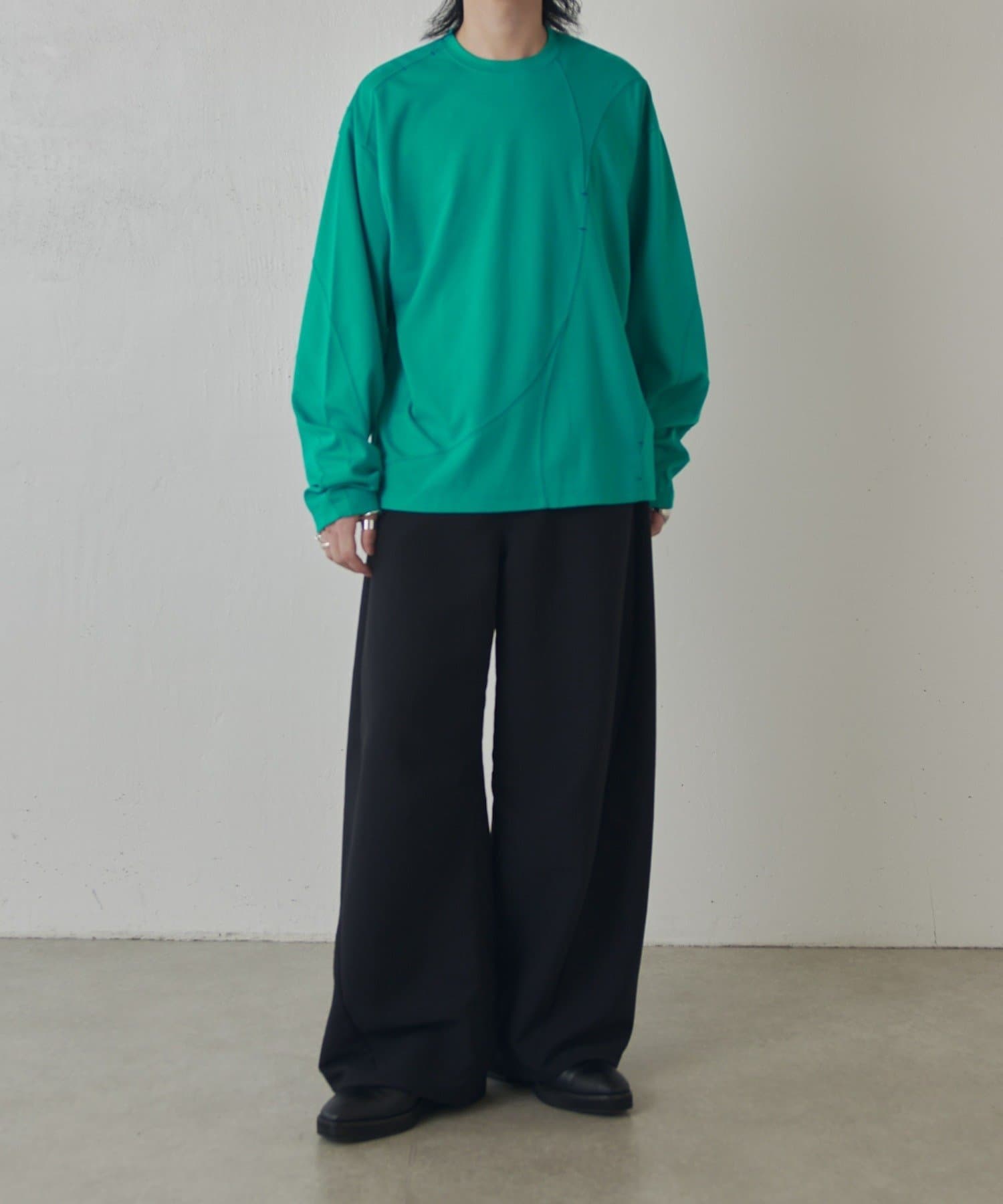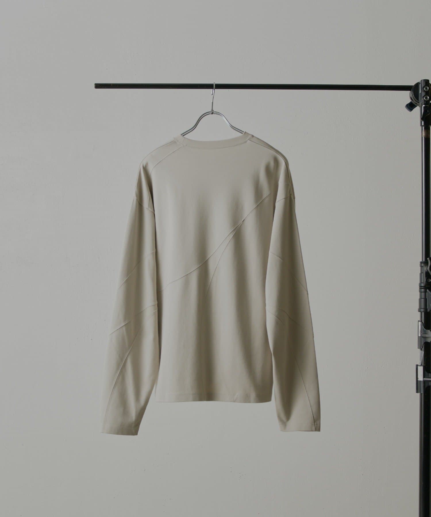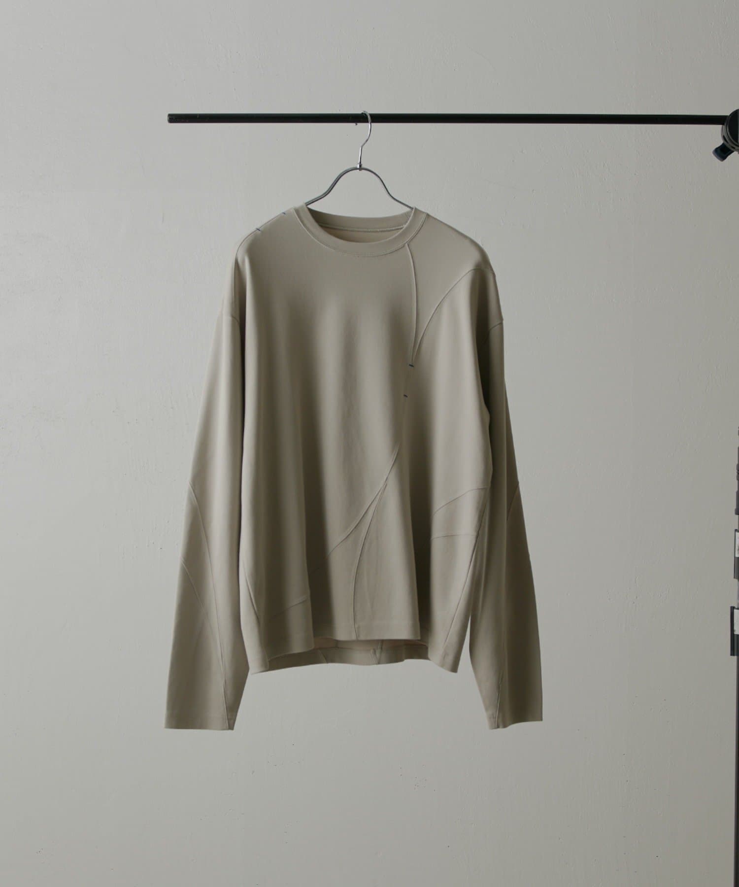 ・ランダムな切替デザインがポイントのロンT。配色のカンヌキステッチがさりげないアクセントに。ややルーズなサイズ感で様々なスタイルで取り入れられます。