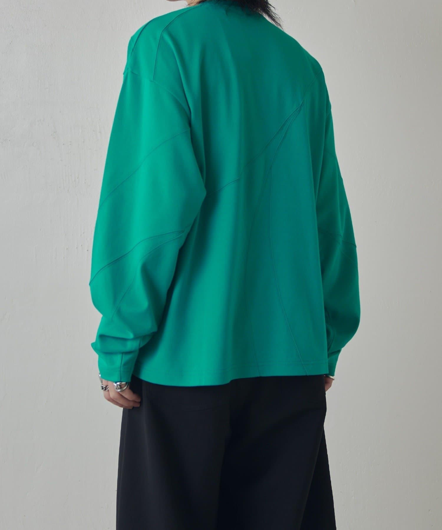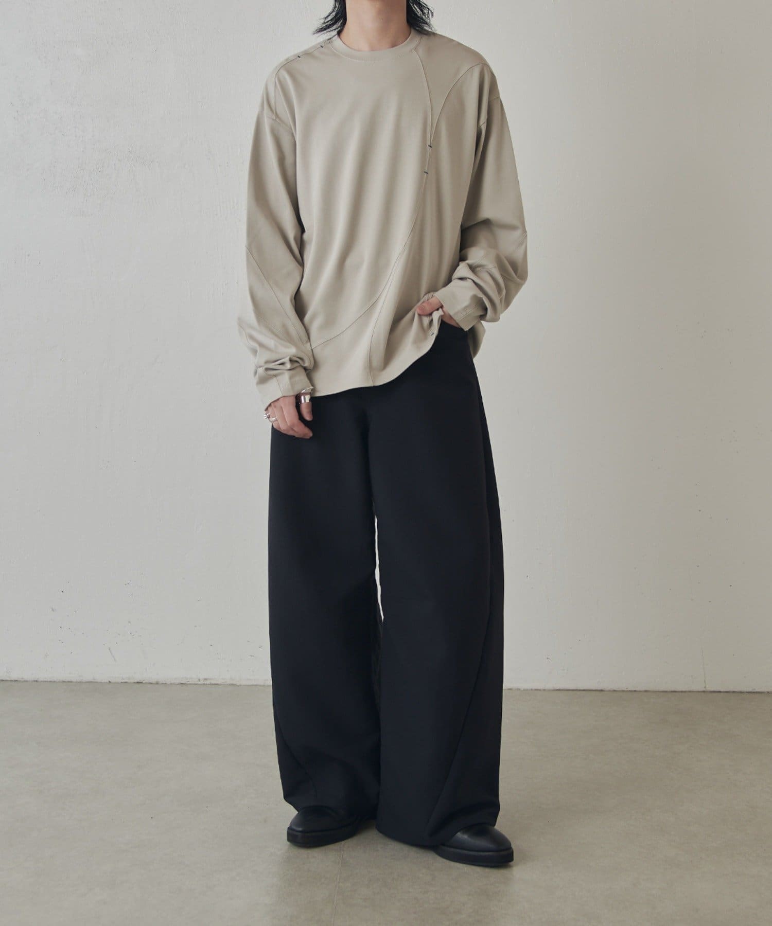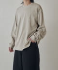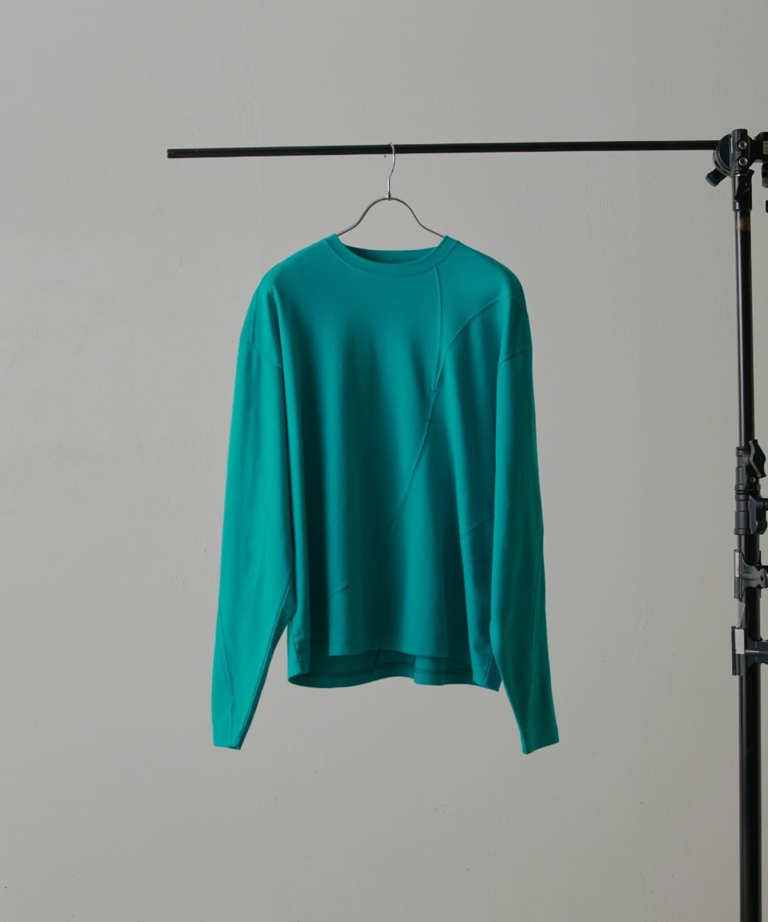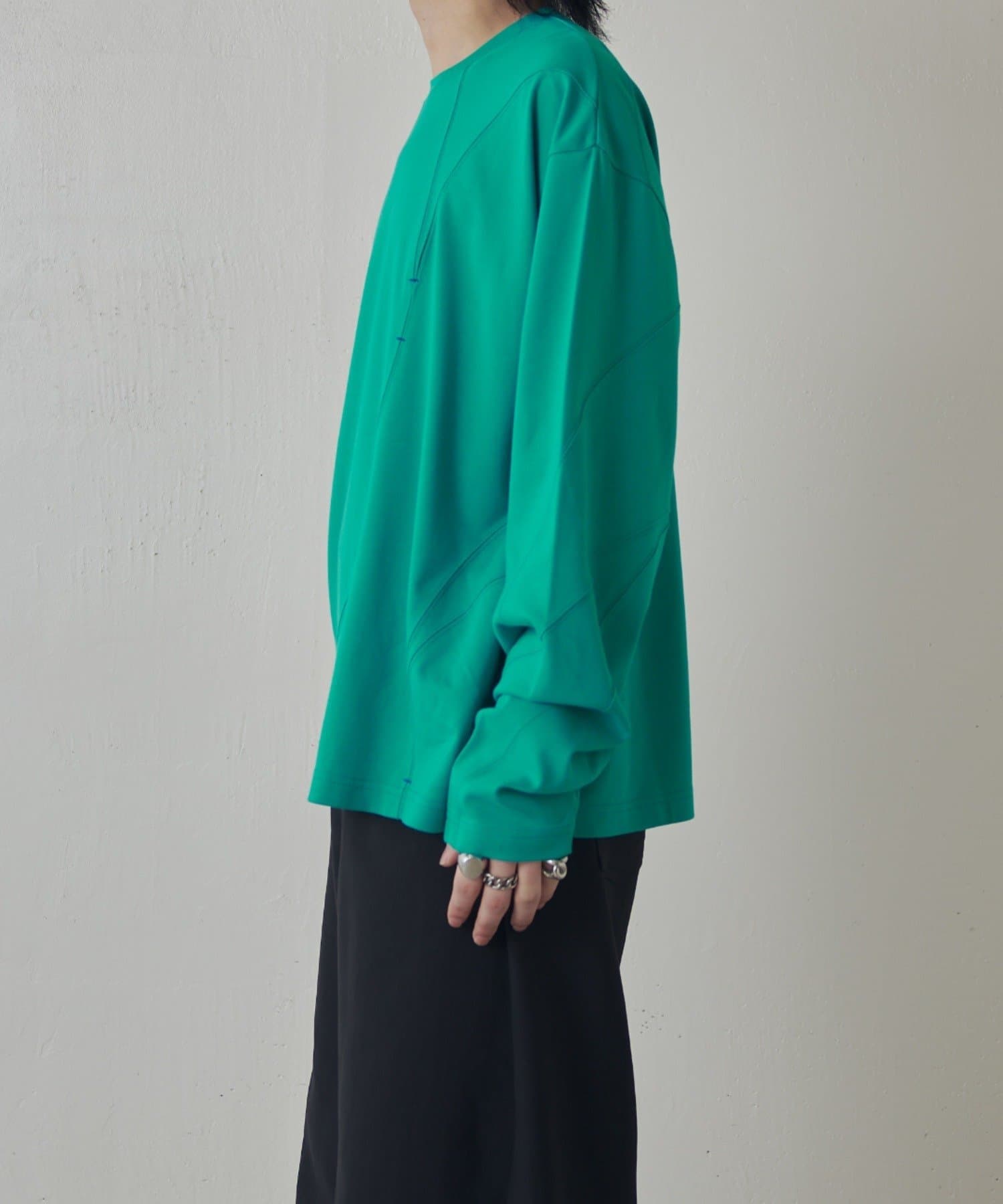 ・ランダムな切替デザインがポイントのロンT。配色のカンヌキステッチがさりげないアクセントに。ややルーズなサイズ感で様々なスタイルで取り入れられます。