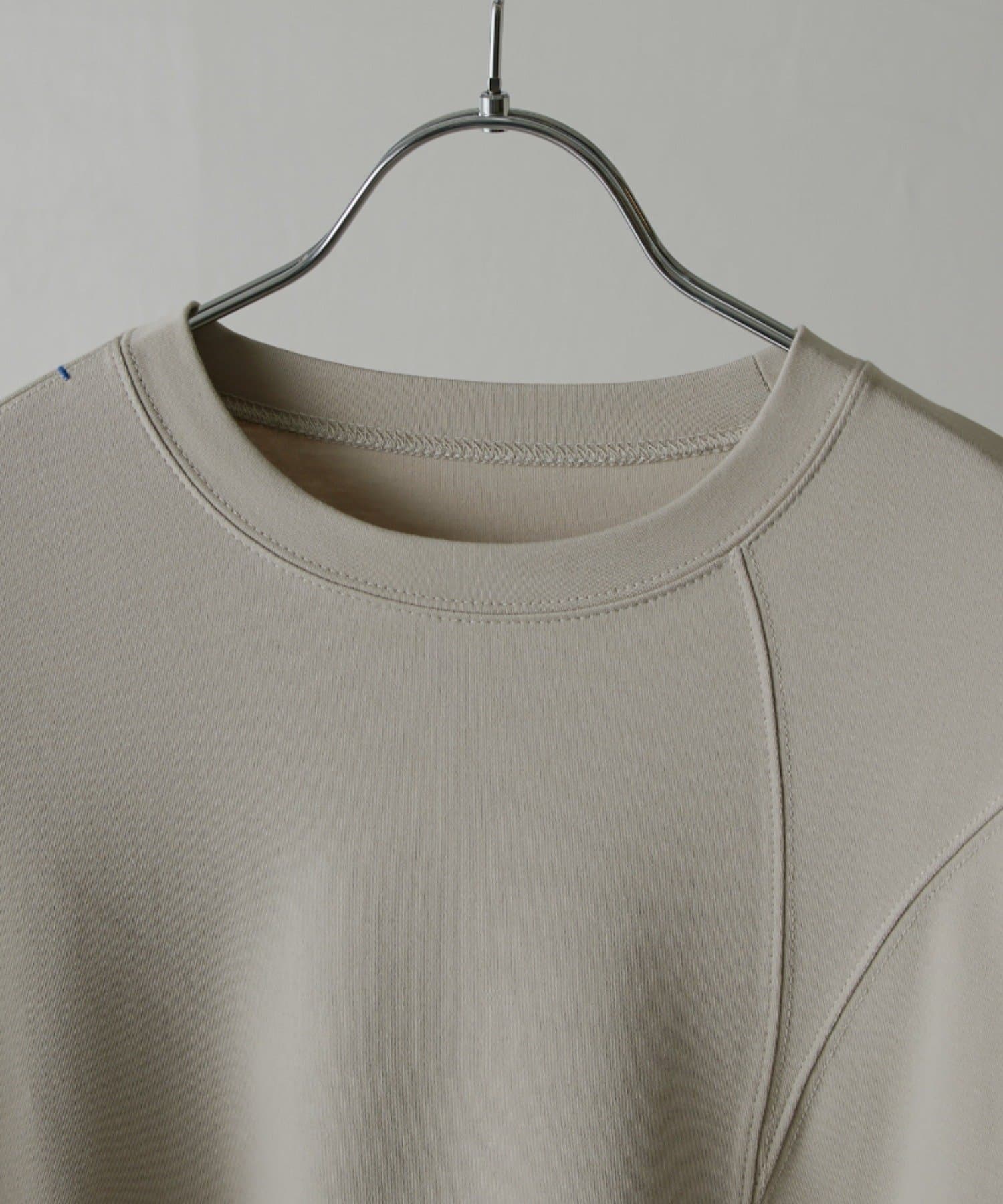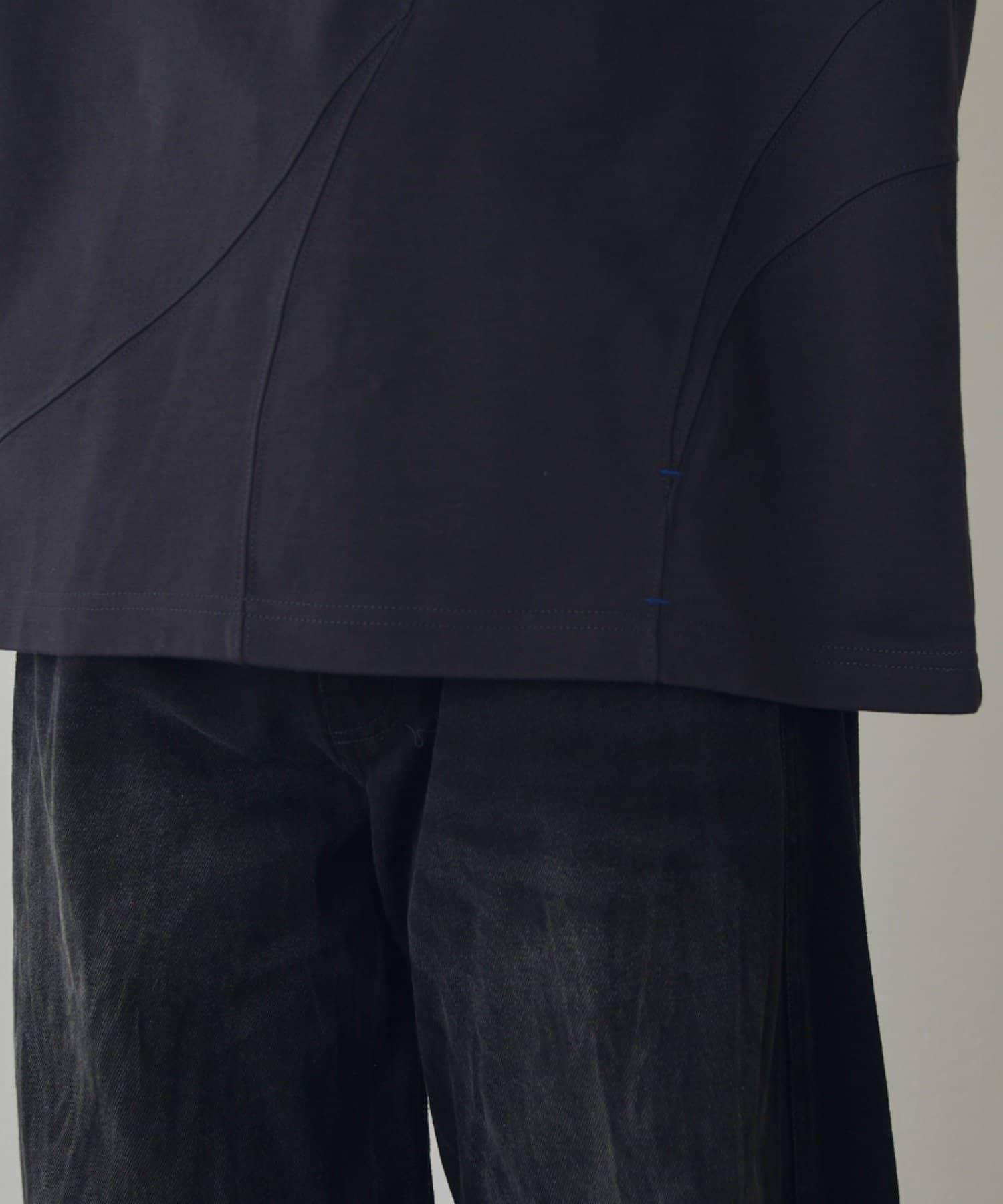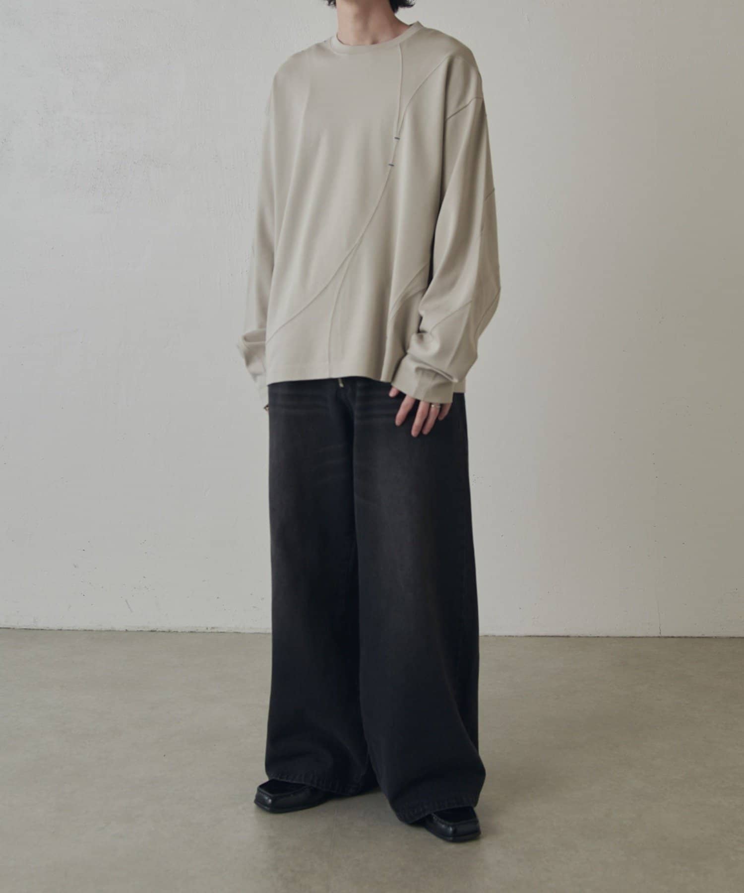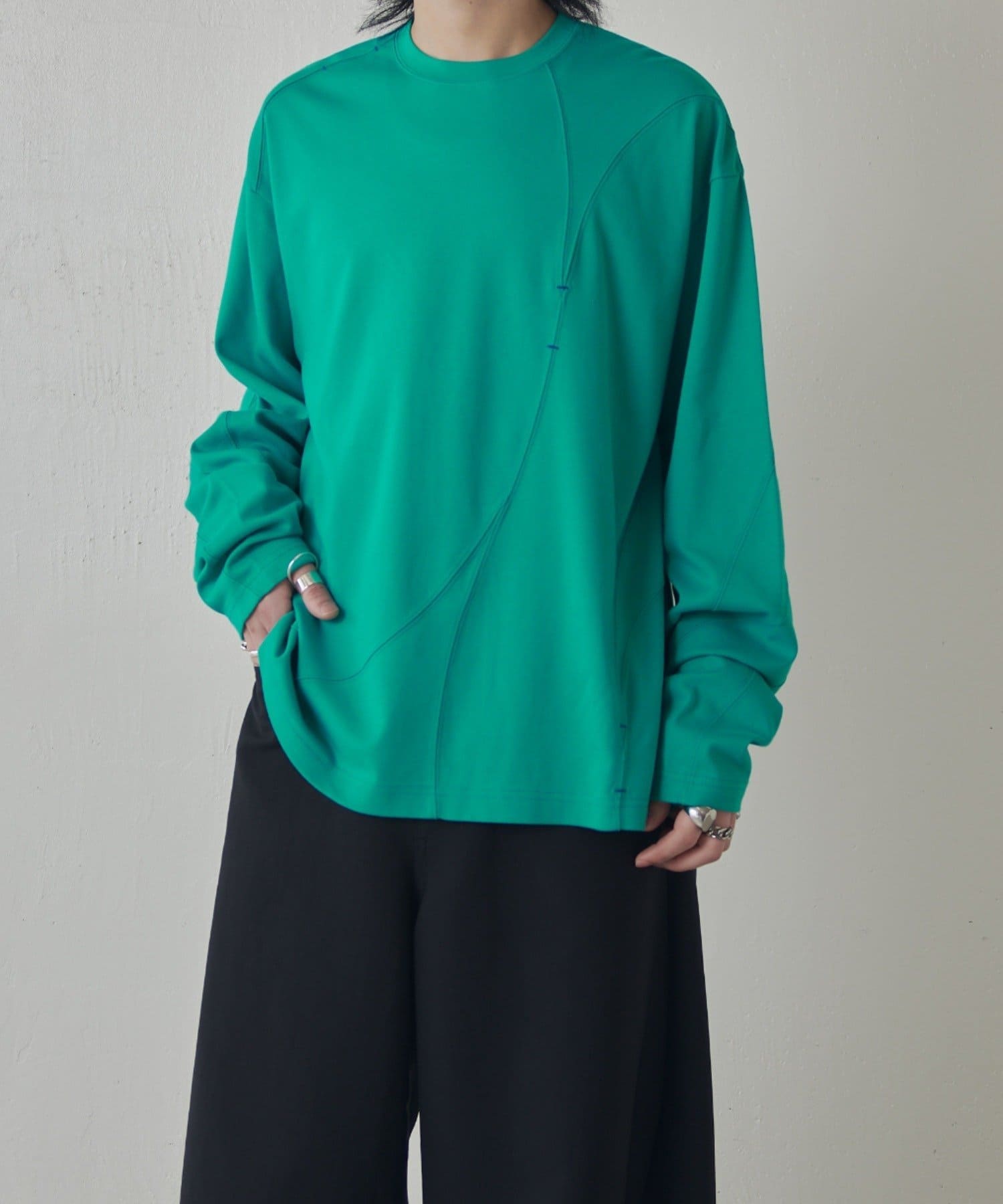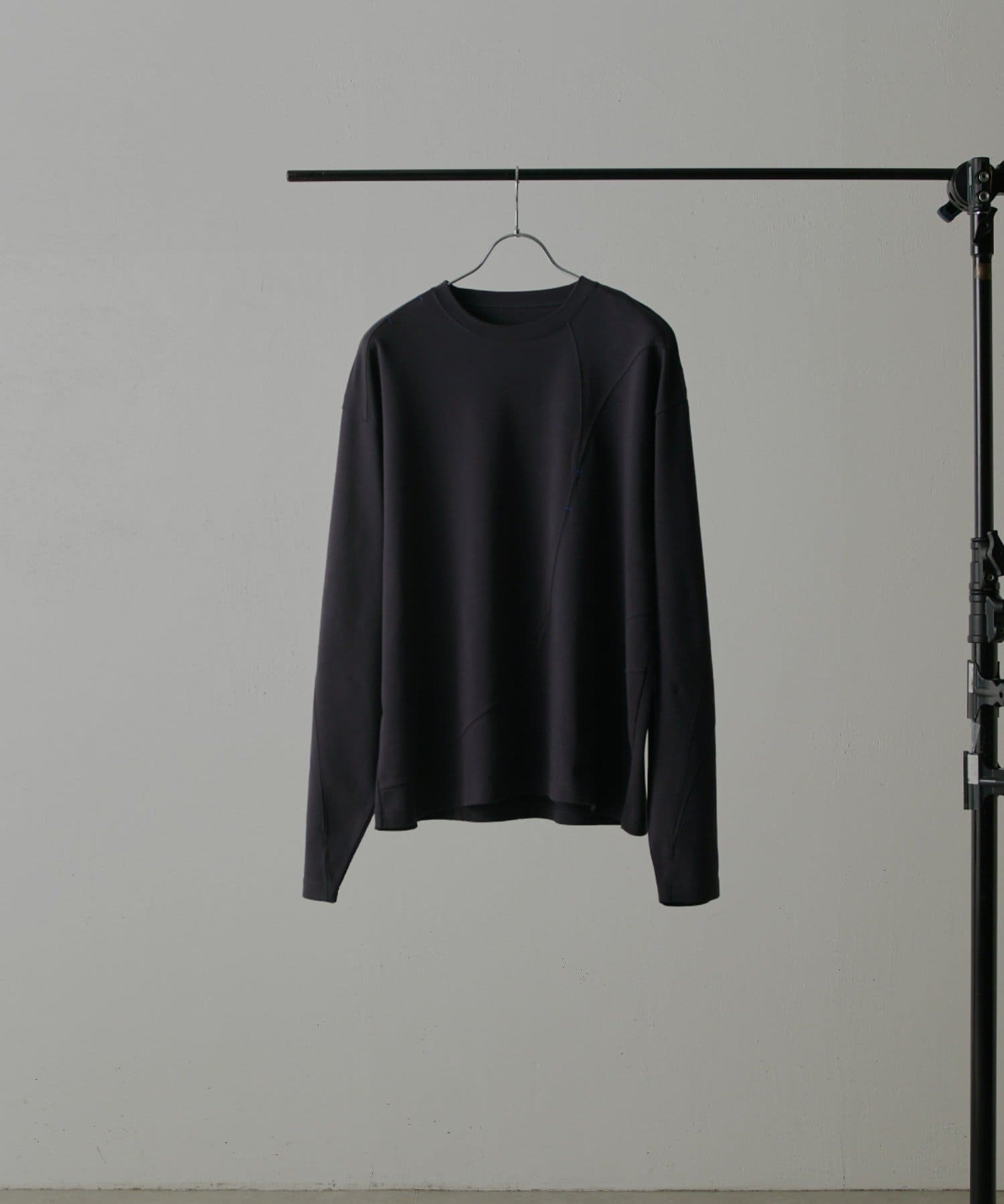 ・ランダムな切替デザインがポイントのロンT。配色のカンヌキステッチがさりげないアクセントに。ややルーズなサイズ感で様々なスタイルで取り入れられます。