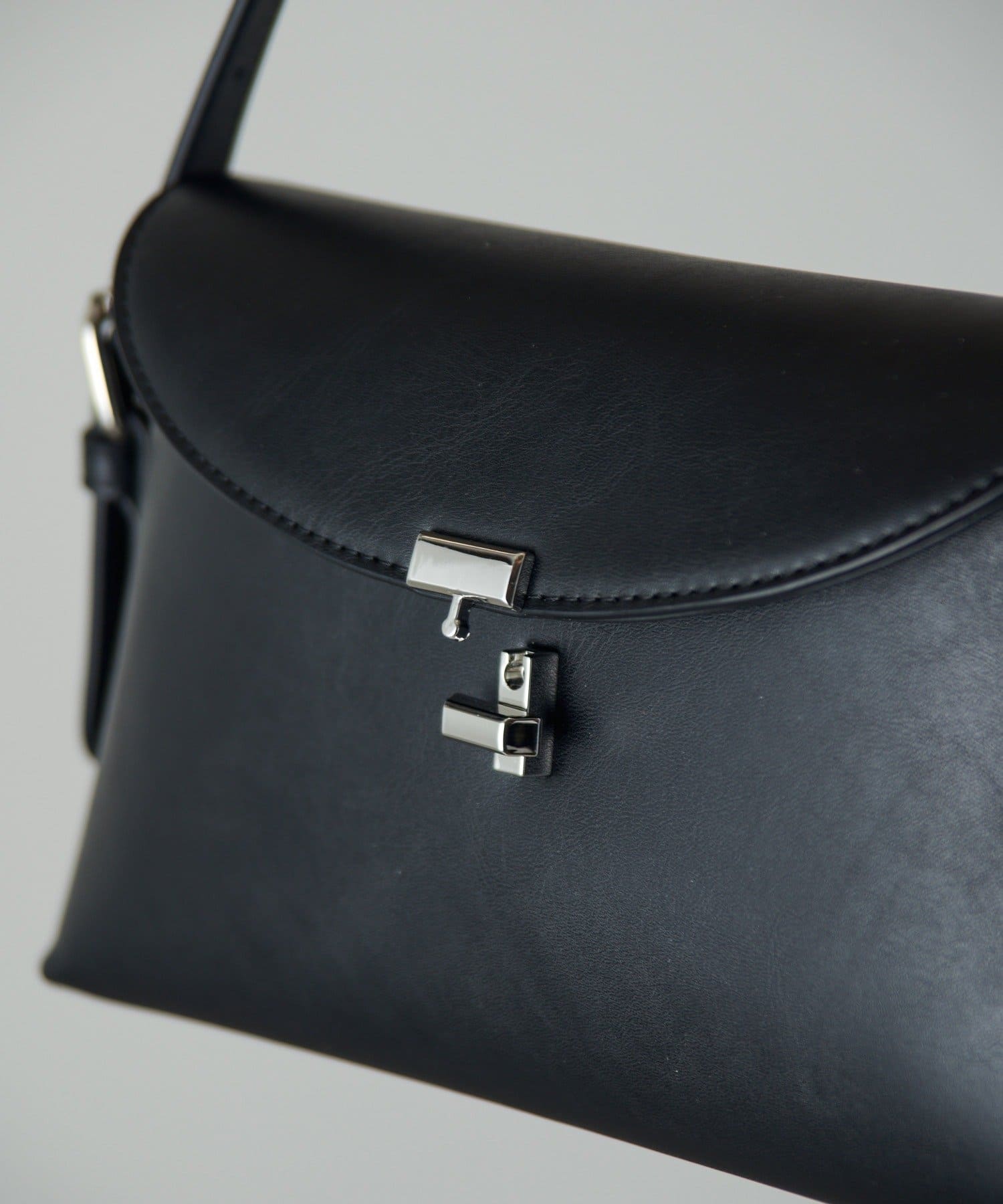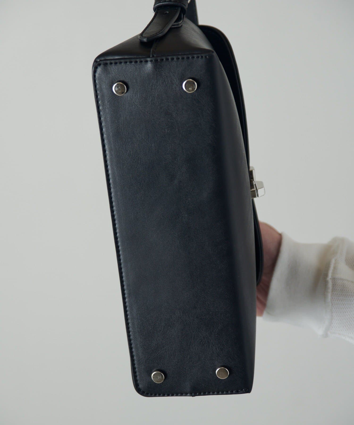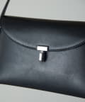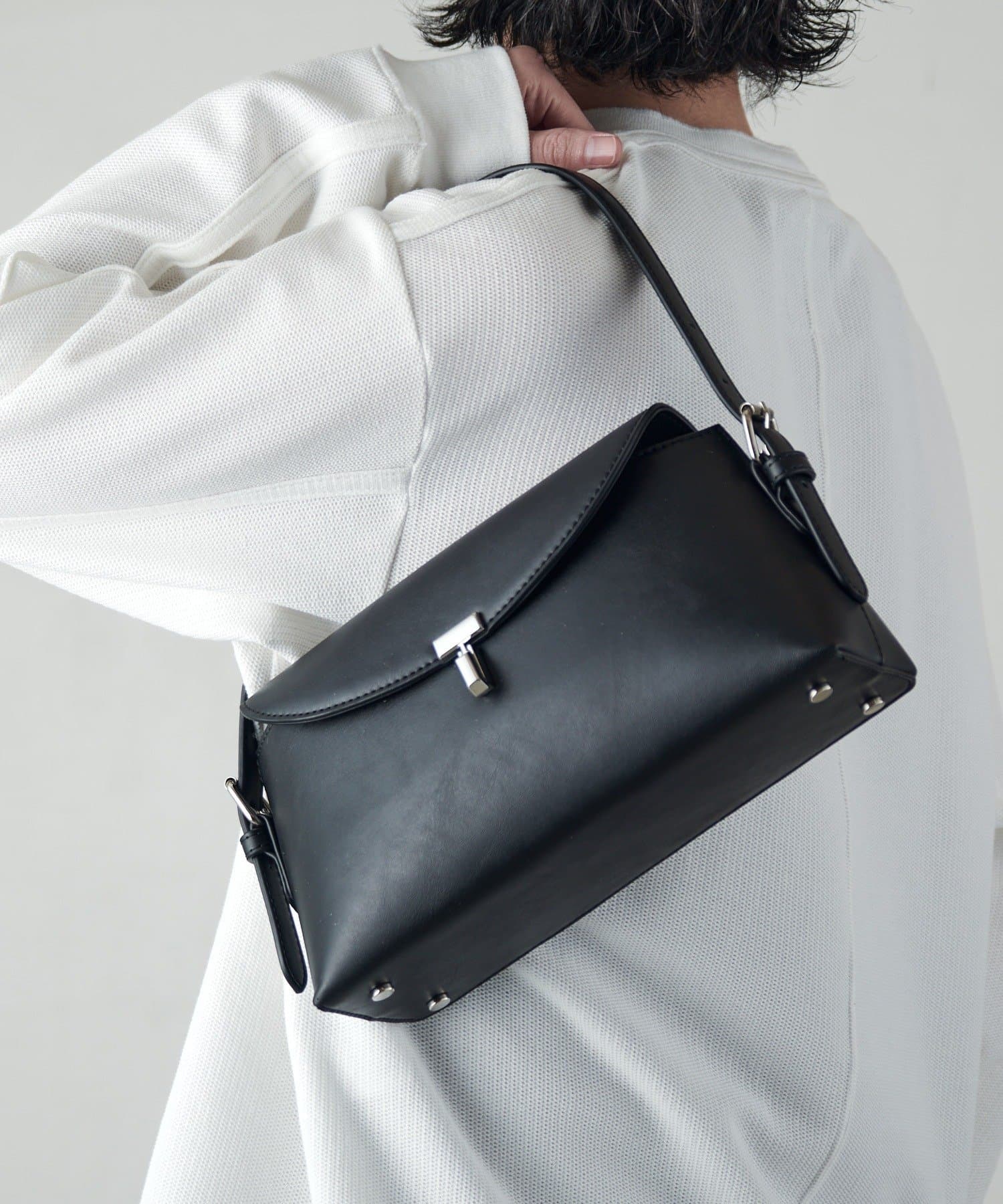 横長のユニークなデザインのハンドルバッグ。フラップ仕様のポケットで、フロントの金具を縦から横へ90度回転させると開きます。