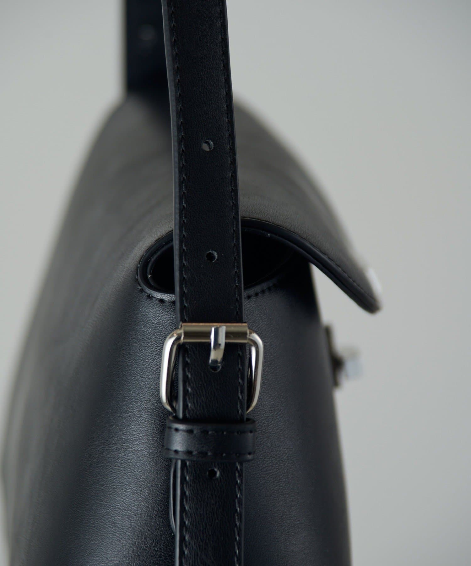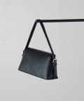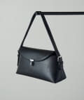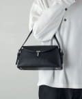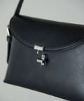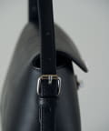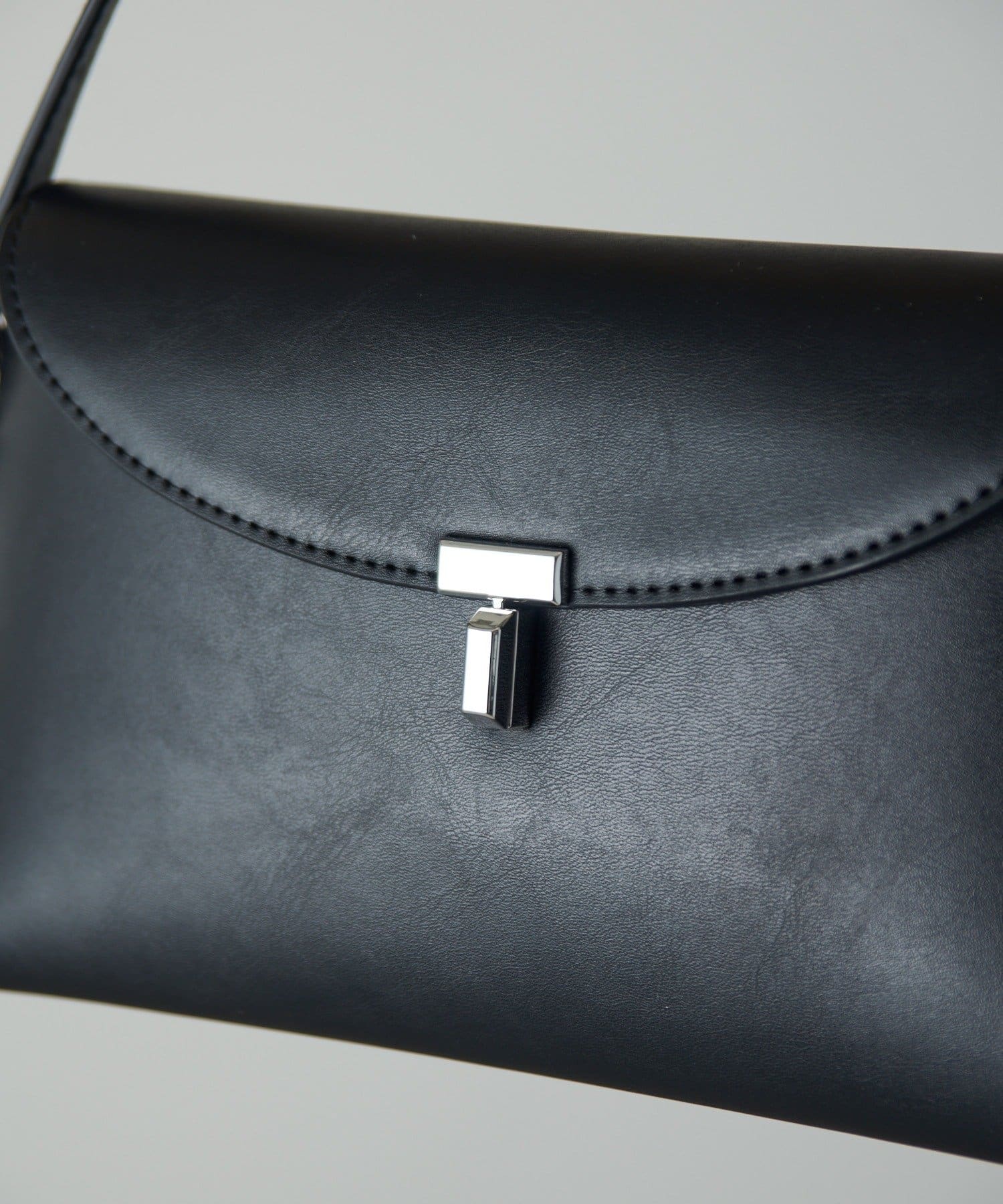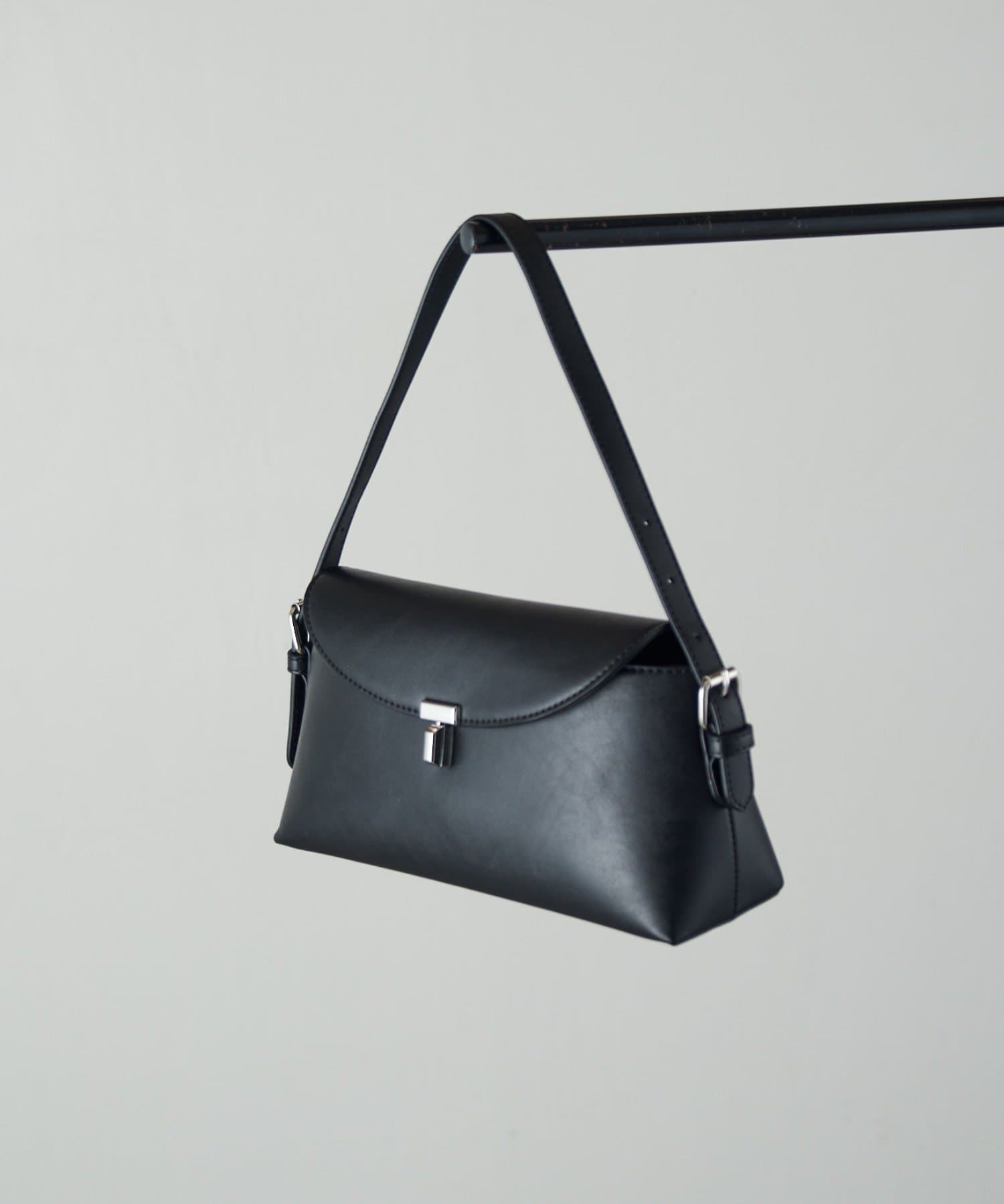 横長のユニークなデザインのハンドルバッグ。フラップ仕様のポケットで、フロントの金具を縦から横へ90度回転させると開きます。