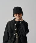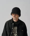 形は裾広がりのベル型で、全体をハーフミラノ編みで編み立てて、ブリムにあたる部分は畦編みを二重し、ほどよい肉感を持たせました。天井は六方に切り替えて丸く縫製することで、頭の形に綺麗に馴染むシルエットに仕上げています。