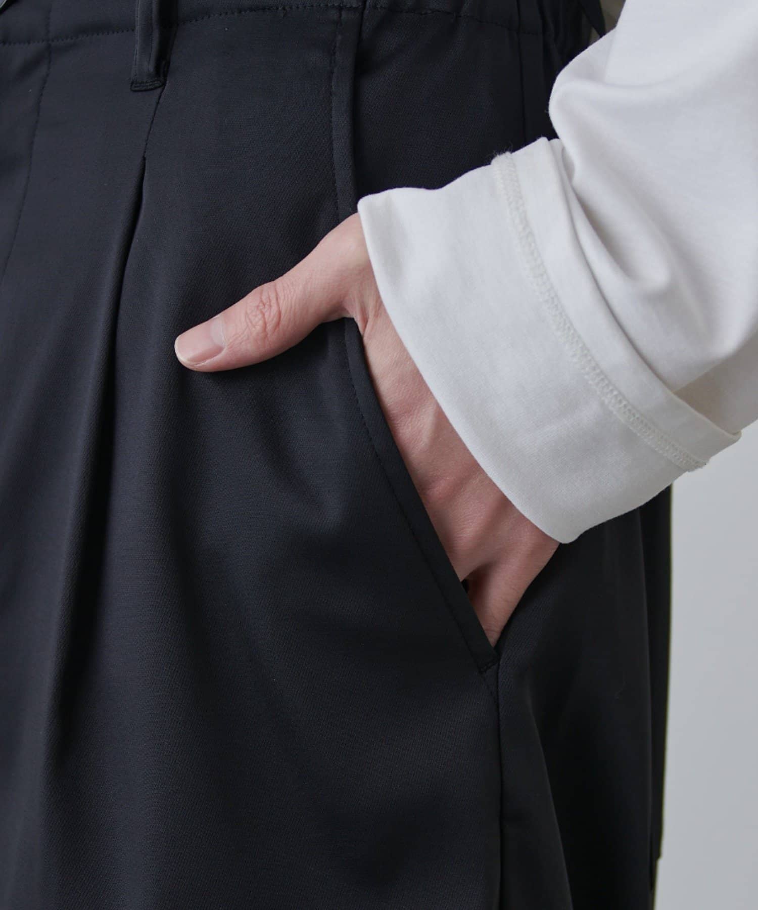 ・ウエストから縦に落ちるシルエットと、膝に施したタックで立体的な見え方を実現
